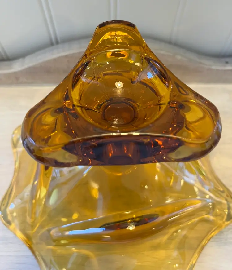 • Approx. 7.5” diameter × 5.5” tall • Rich amber color • Solid, heavy glass • No chips or cracks noted • Unmarked – likely mid-century American art glass (Viking-style)