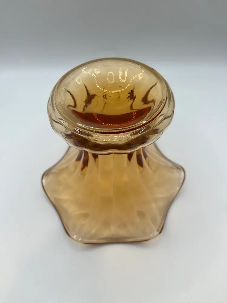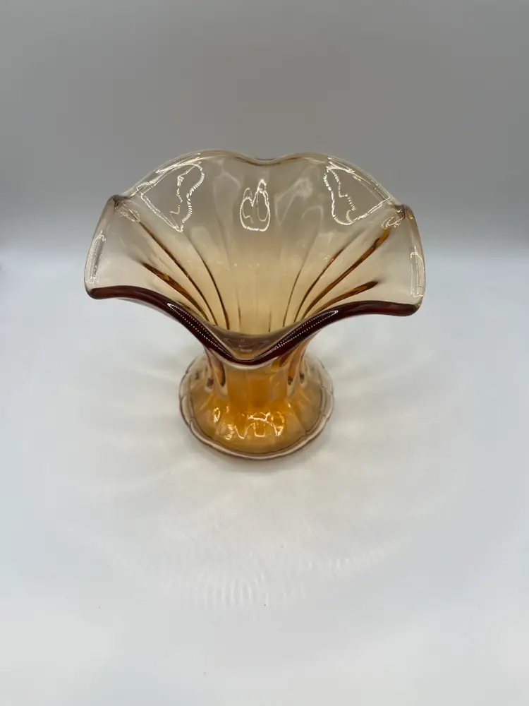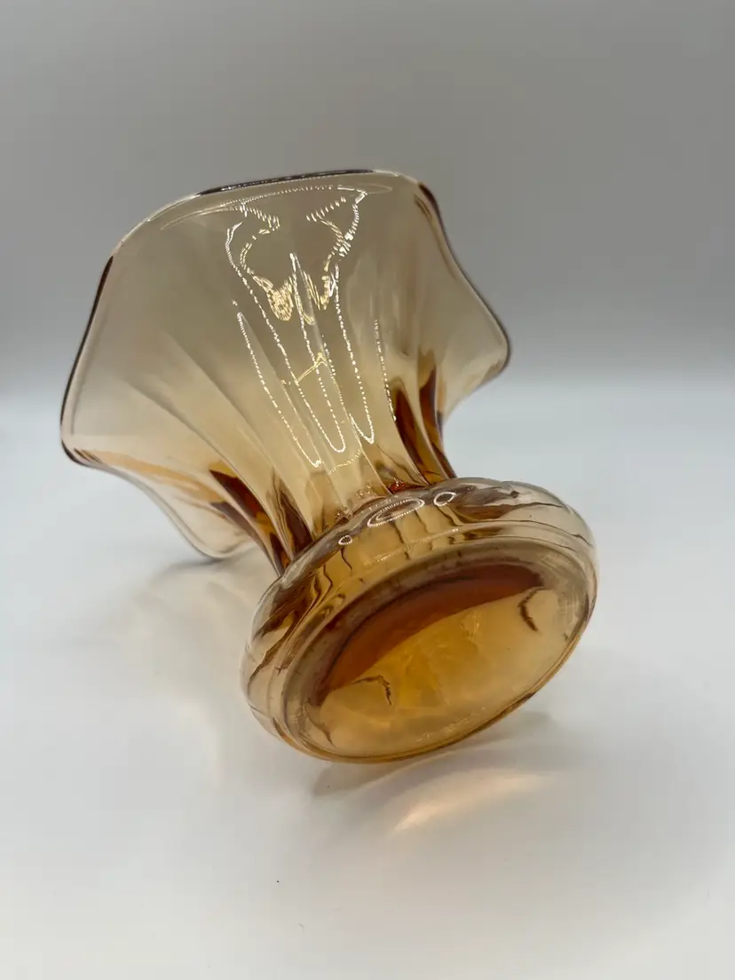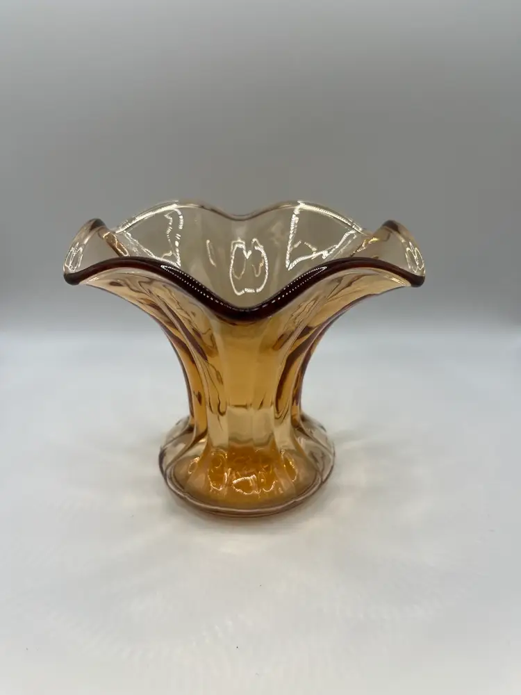 This is a beautiful amber glass vase. It is 5” tall and 6” across the top. No chips or cracks.