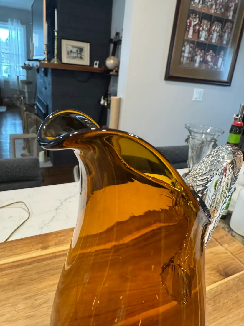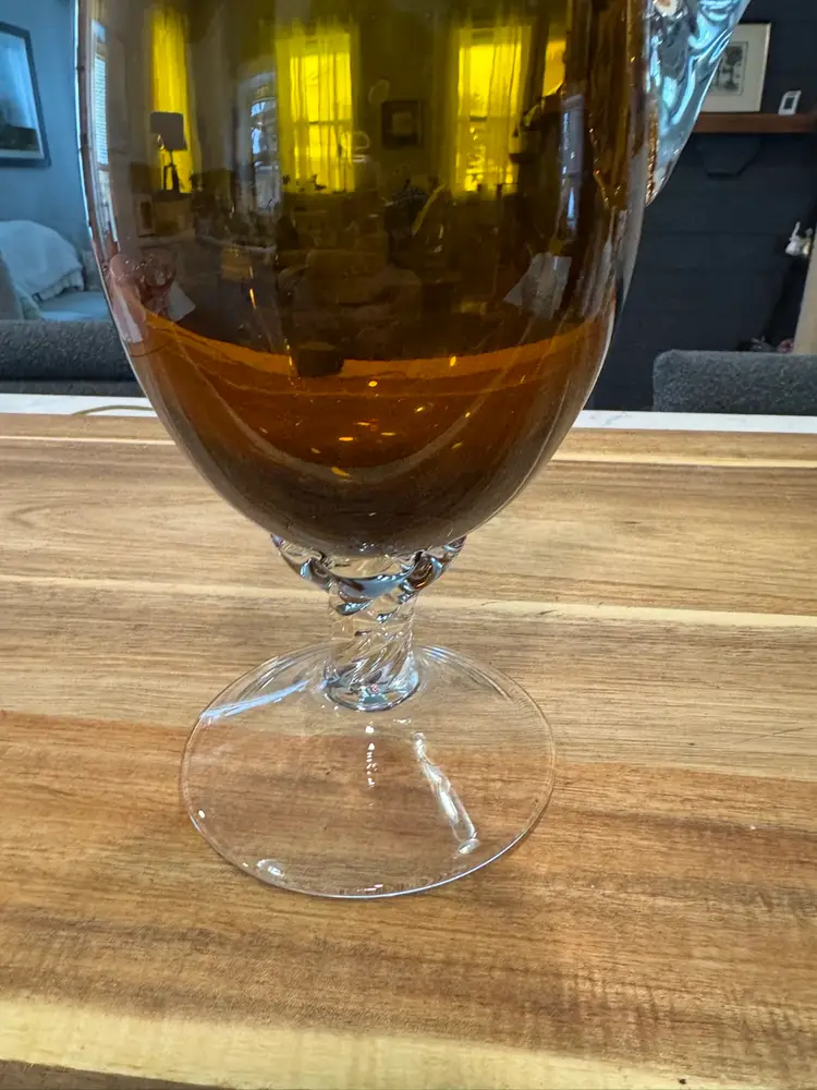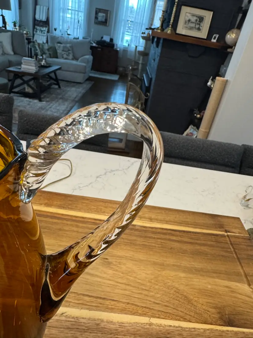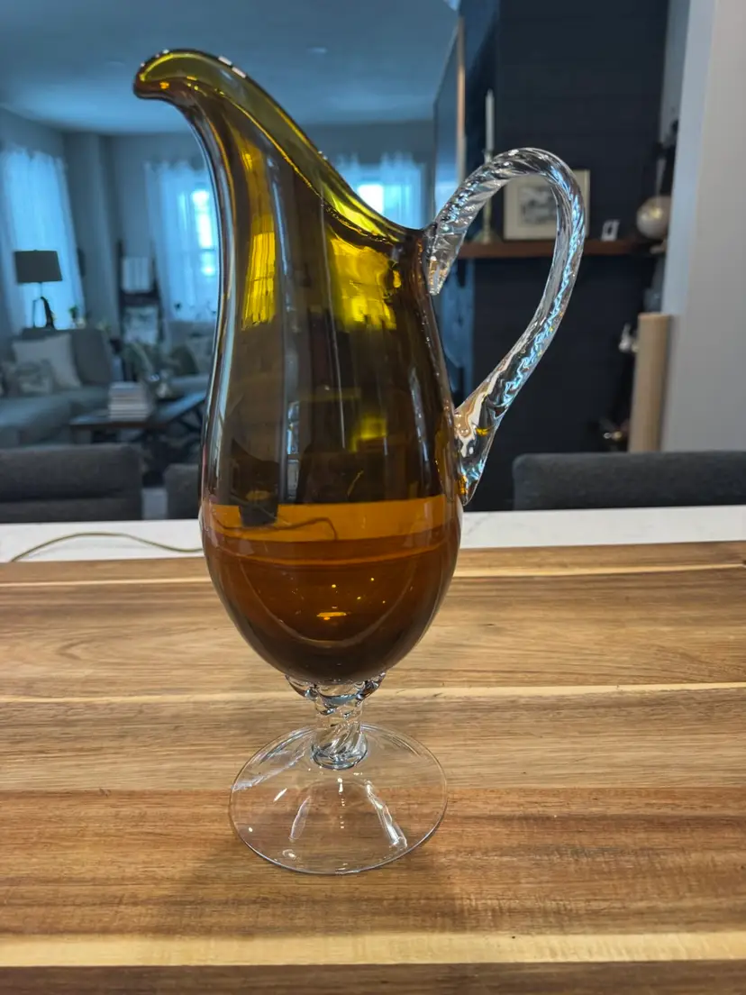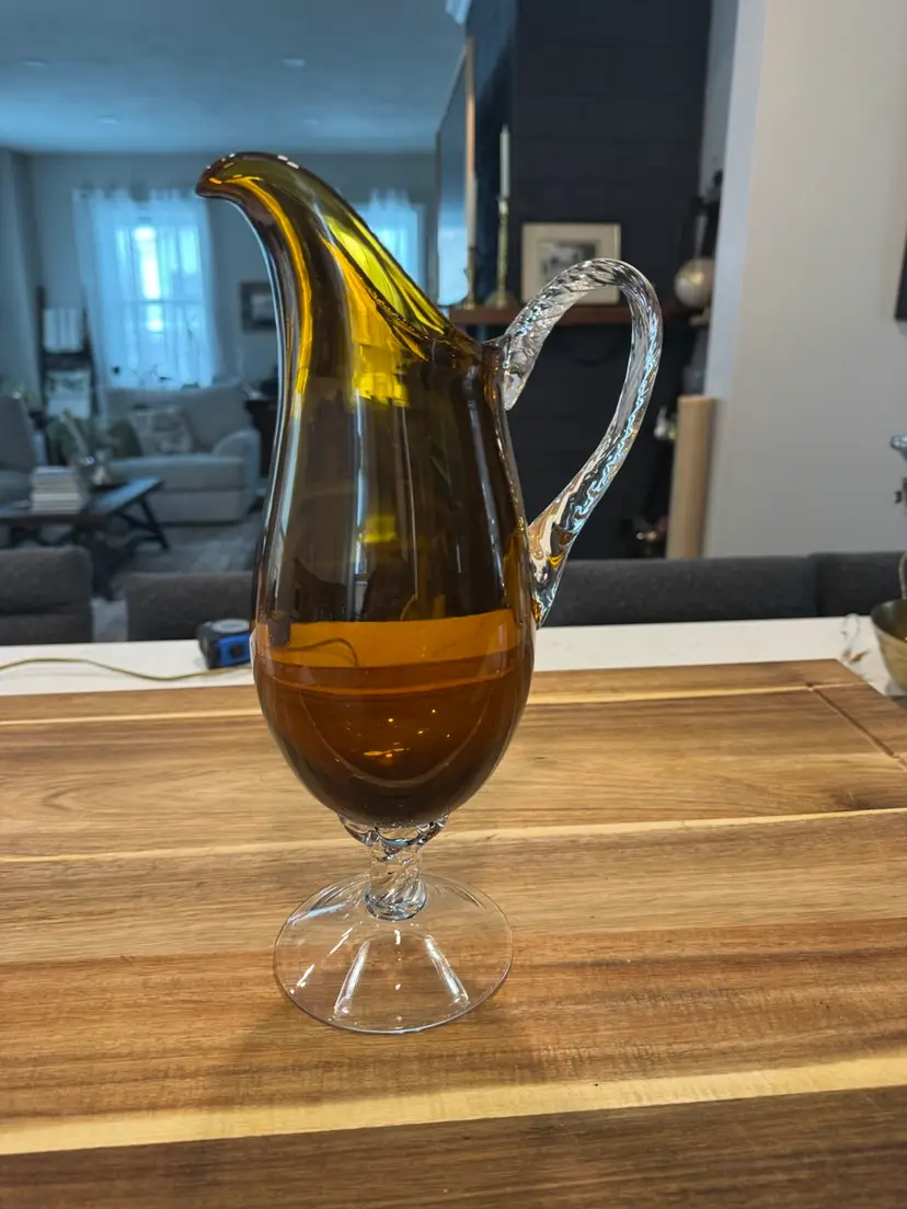 Italian Empoli glass. Mid century. Twisted handle and base. 12.25” to spout