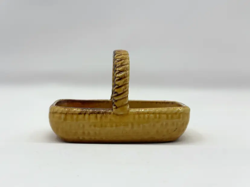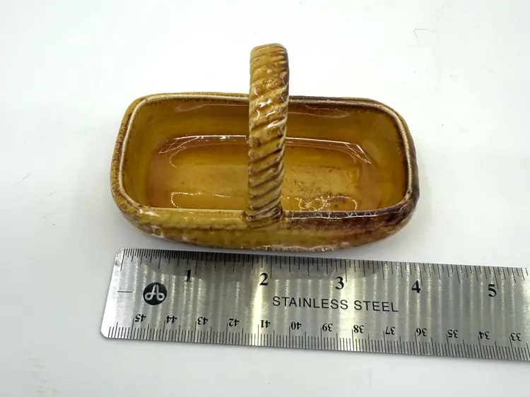 Warm amber glaze meets mid-century charm in this petite Japanese ceramic basket—reminiscent of Enesco’s classic condiment and salt & pepper caddies.