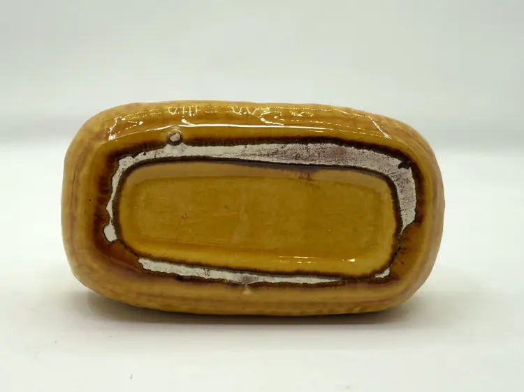 Details: • Manufacturer: Unmarked; attributed to mid-century Japanese production, Enesco-style • Markings: None • Date/Era: Circa 1950s–1960s • Material & Color: Glazed ceramic; golden tan with amber and brown accents • Dimensions: L 4", W 2", H 4.25" (including handle) • Weight: 4 oz • Finish: Gloss glaze with natural age crazing
