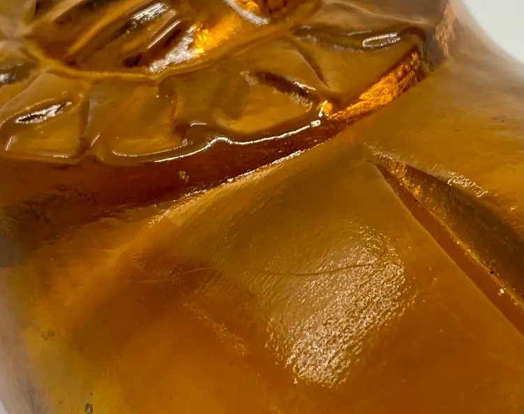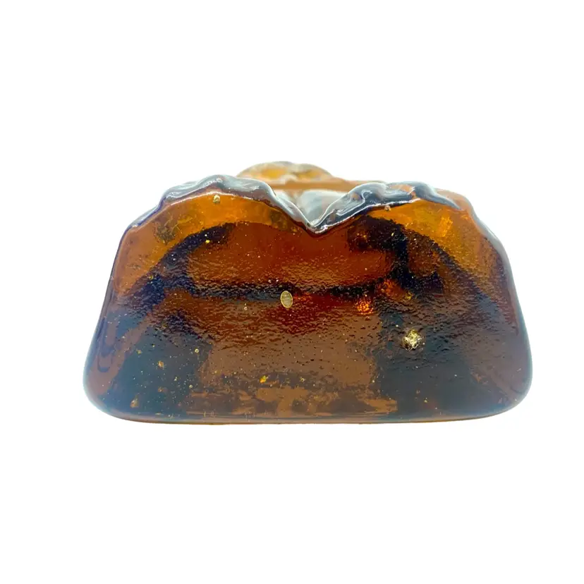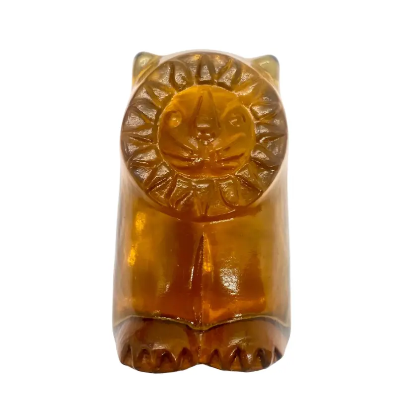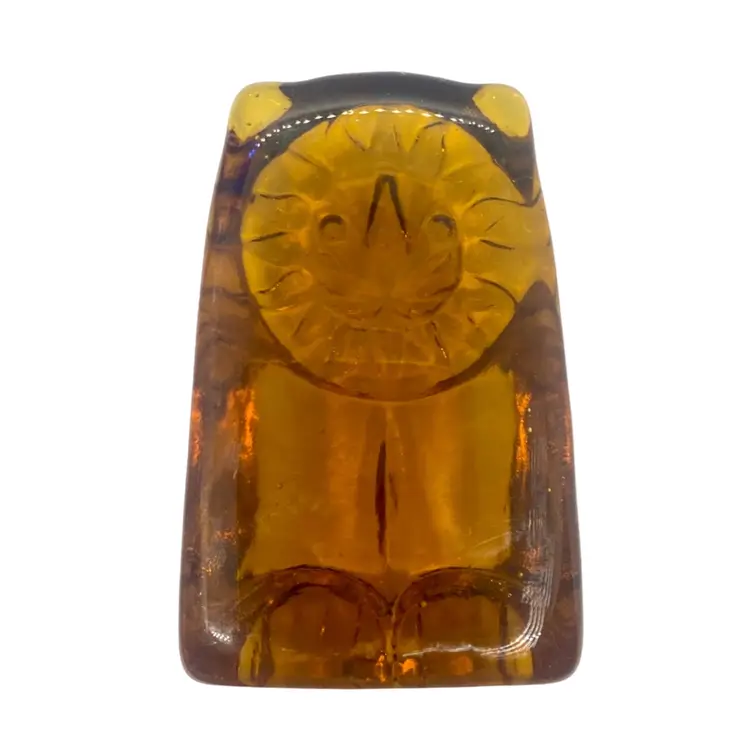 Leo the lion was made by Blenko! He is a solid amber vintage paperweight with a sweet face and a mane that looks like the sun. He is 4.5” tall and 3” across. He is in very good condition with a light scratch on the left side and a popped bubble on the bottom of his foot. There are bubbles within the piece. You can have him stand up or lay him down.