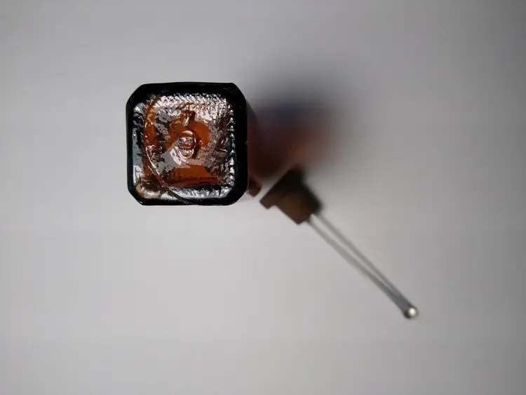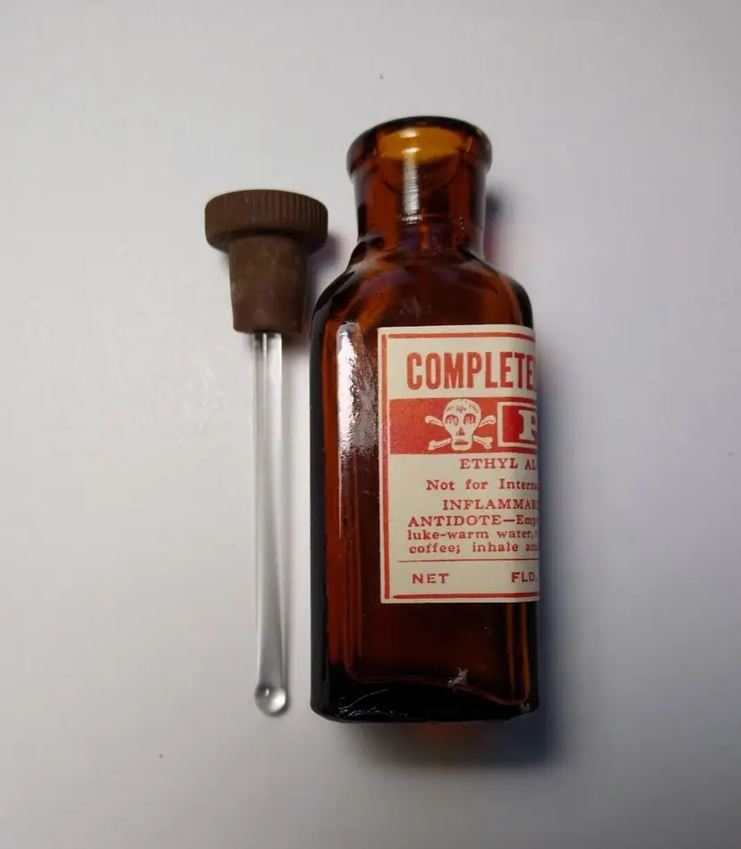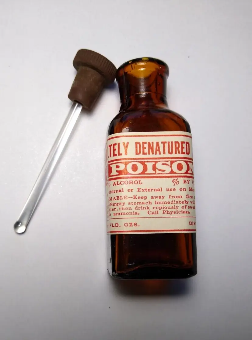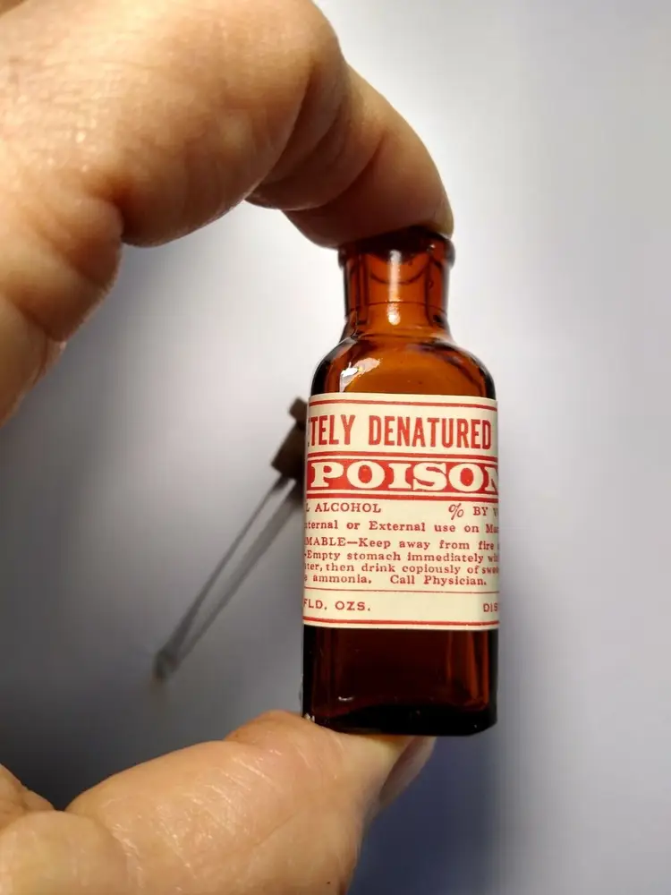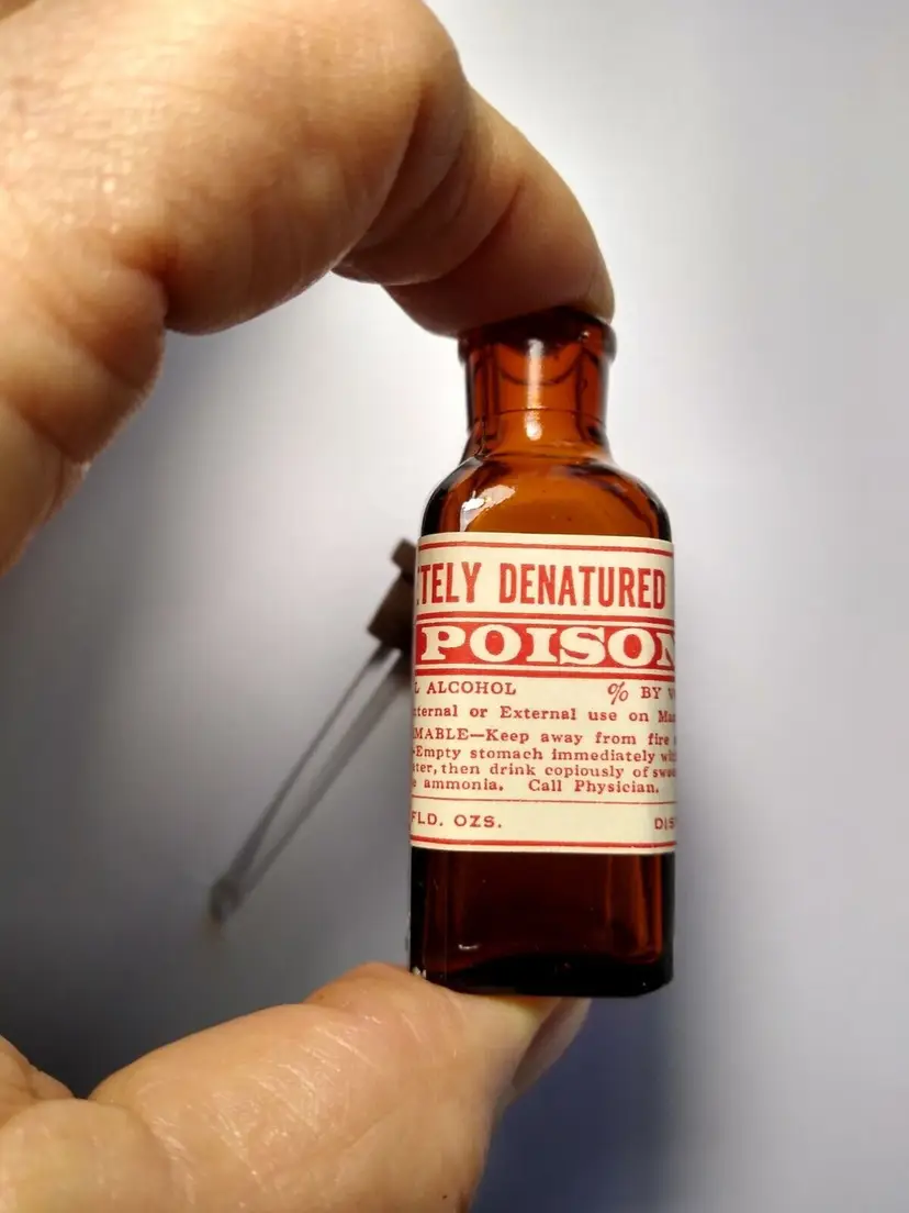 Antique small size EMPTY poison bottle. Bottom has embossing that is hard to read. Color is amber brown translucent. Bottle is in clean condition. Paper label has some wrinkles and wear. Comes with rubber stopper with dauber. Size of the bottle is 2.5" tall not including the dauber.