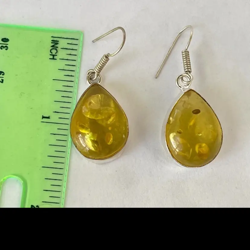 Yellow amber style teardrop earrings featuring translucent golden yellow resin with natural-looking inclusions, creating a warm, organic look.