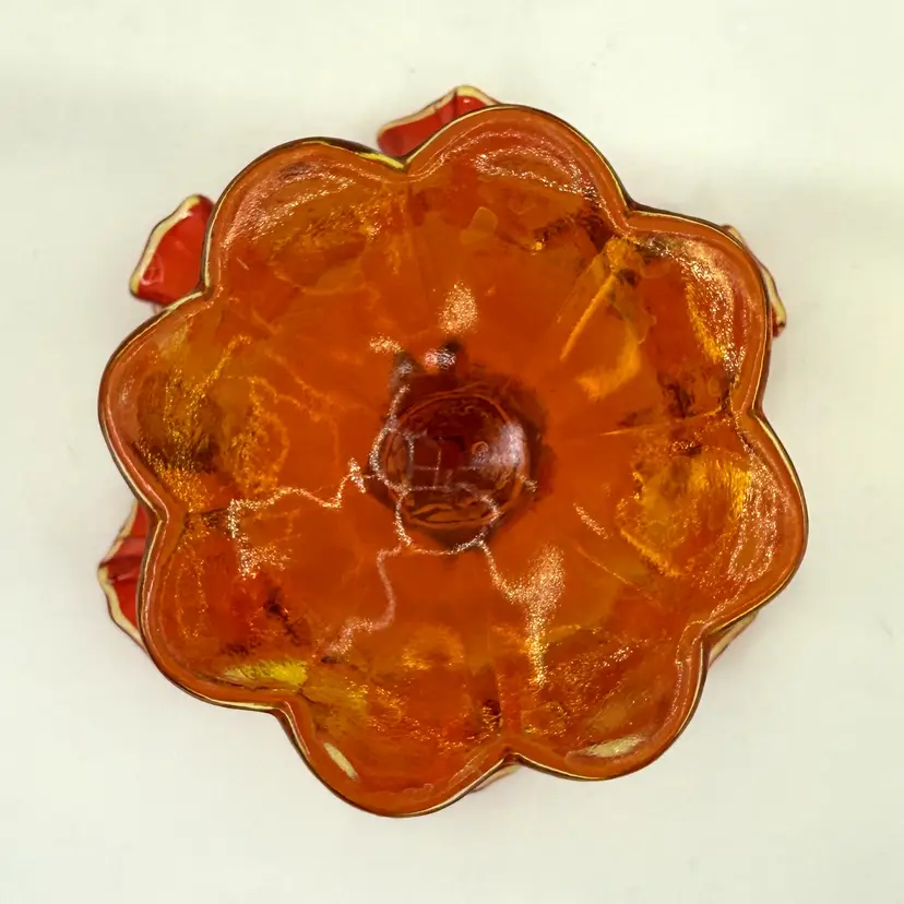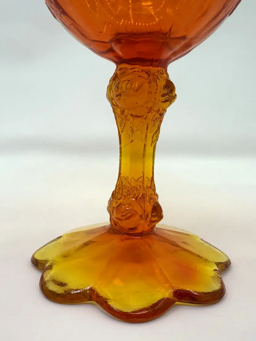 Details: • Manufacturer: Fenton Glass (unmarked, attributed) • Origin: USA • Era: Circa 1960s–1970s • Pattern: Cabbage Rose • Color: Amberina (red-to-amber, UV reactive) • Size: 6.5" H x 6.5" D, 1 lb