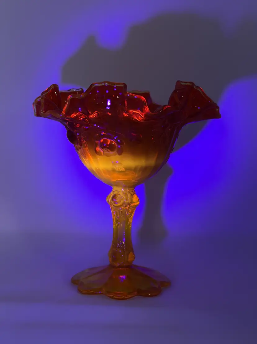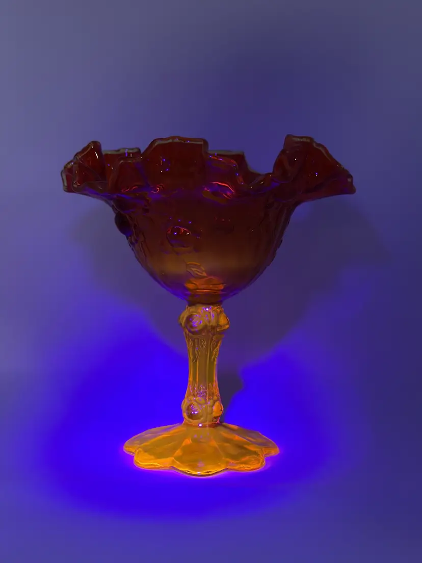 A glowing centerpiece for collectors and vintage lovers: • Fiery Amberina glass with a red-to-amber gradient, crafted in Fenton’s iconic Cabbage Rose pattern (unmarked, attributed by mold/color). • Ruffled rim, embossed floral details, and flared pedestal base—classic 1960s–70s American glass design. • UV reactive: Base glows vivid yellow-green under blacklight (uranium content). • Versatile: Use as a candy dish, compote, or showstopping centerpiece. • Condition: Excellent—no chips, cracks, or repairs. Displays beautifully in any light.