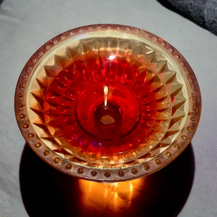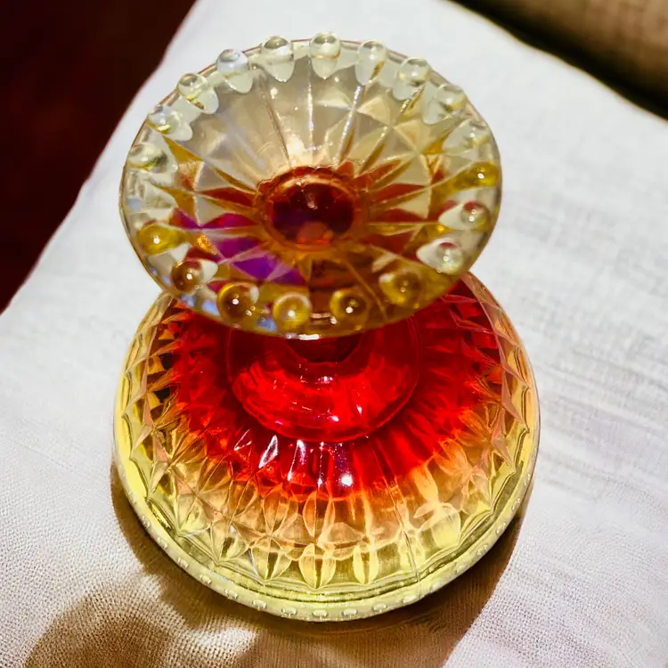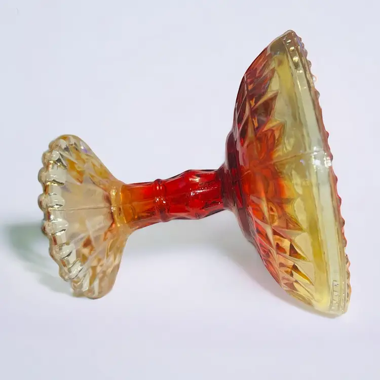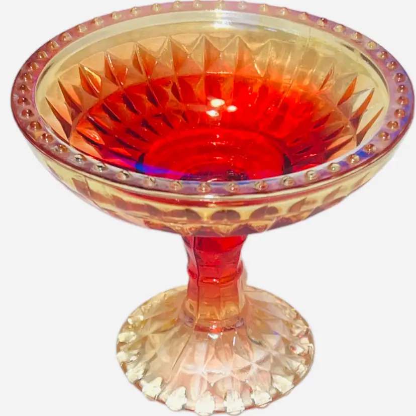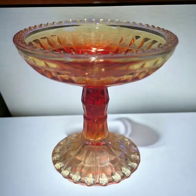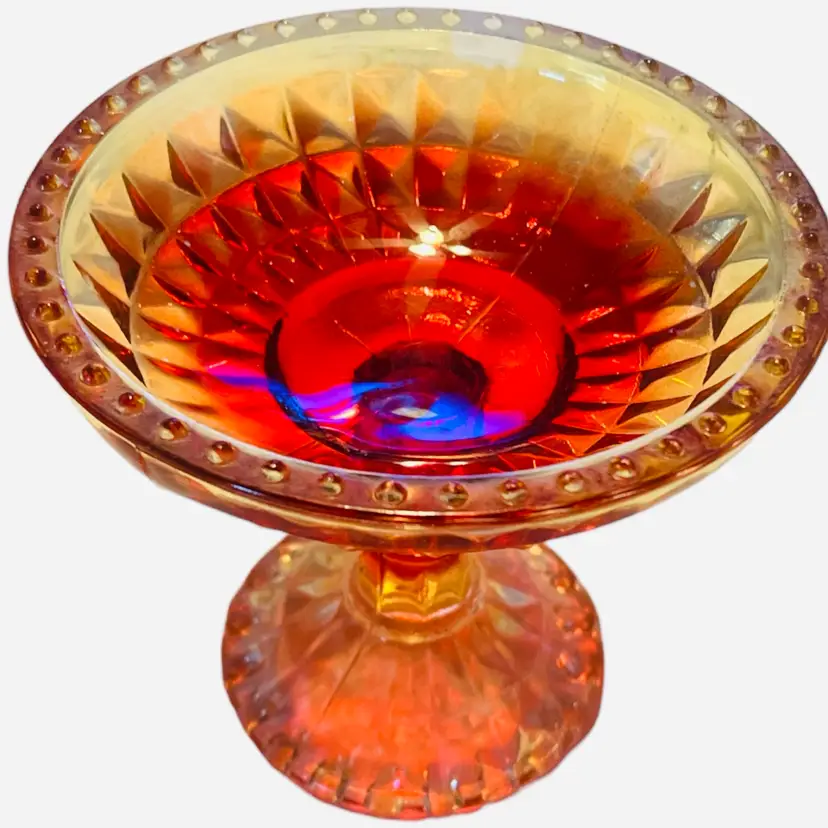 This vintage glass candy dish is a beautiful addition to any collection. The dish features a round, diamond-patterned design in orange and red colors. It sits on a pedestal foot and is 9 inches tall, 5.5 inches long, and 5 inches wide.