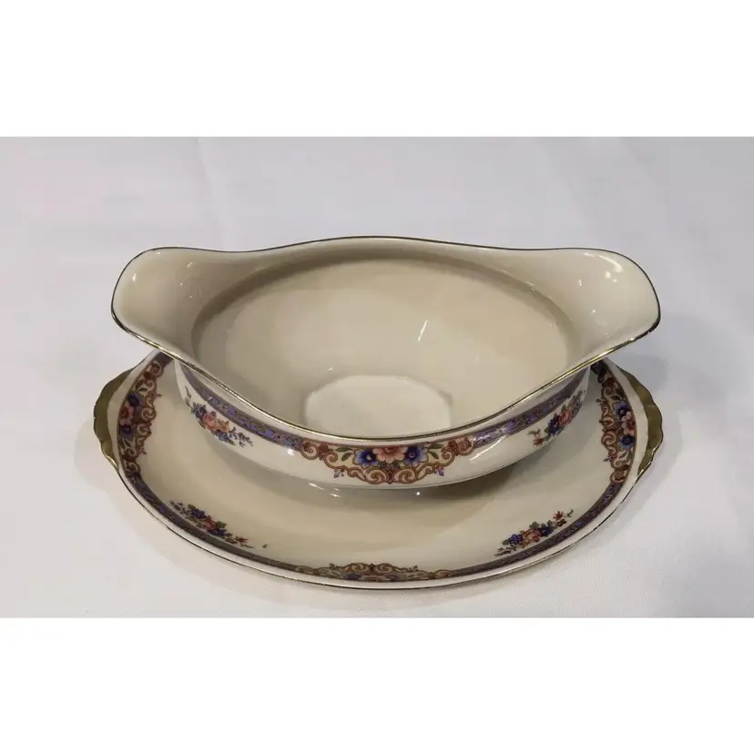 AMC China Germany ACC2 Gravy Boat with Attached Plate Blue Floral Gold