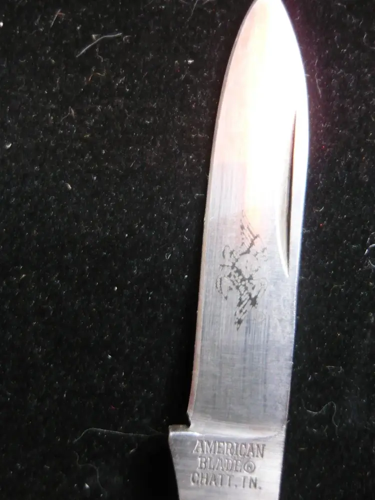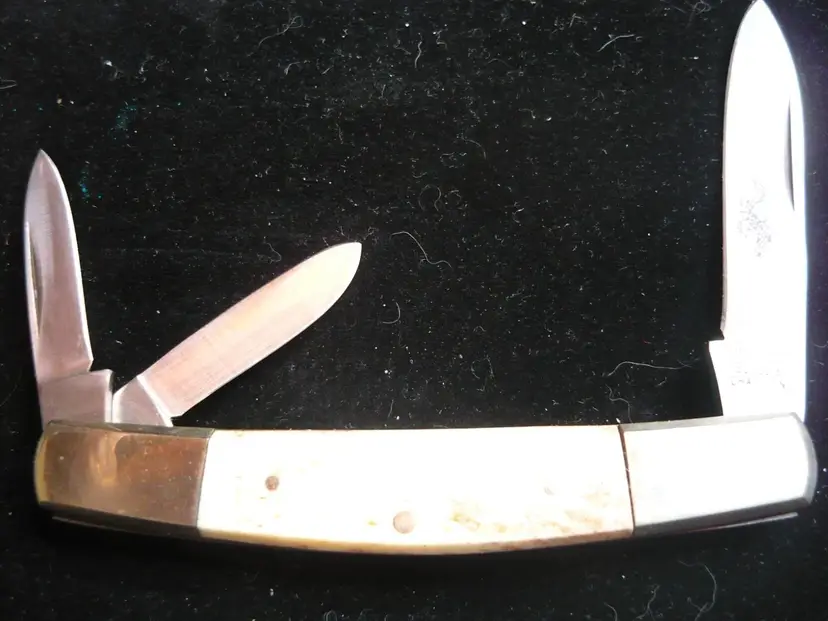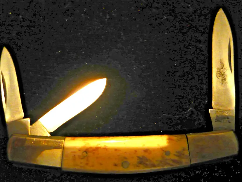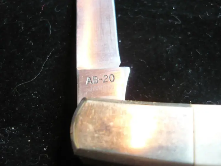 The American Blade AB-20 is a three-blade folding knife with a sleek design and smooth bone stag handles. This pocketknife features a stainless steel blade with a range under 2.75 inches, making it perfect for everyday carry. The knife is ambidextrous, manual, and original, with a plain blade edge. The beige color and unique design make it a collectible piece for enthusiasts of modern folding knives.