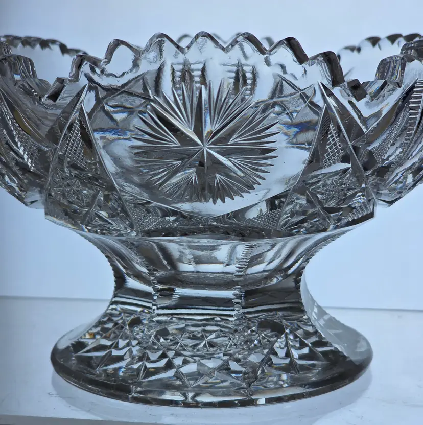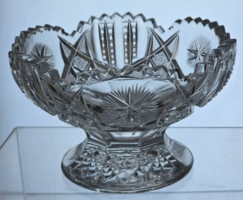 Stunning ABP cut glass bowl with intricate starburst and fan patterns. Measures 7" in diameter 4.25" high