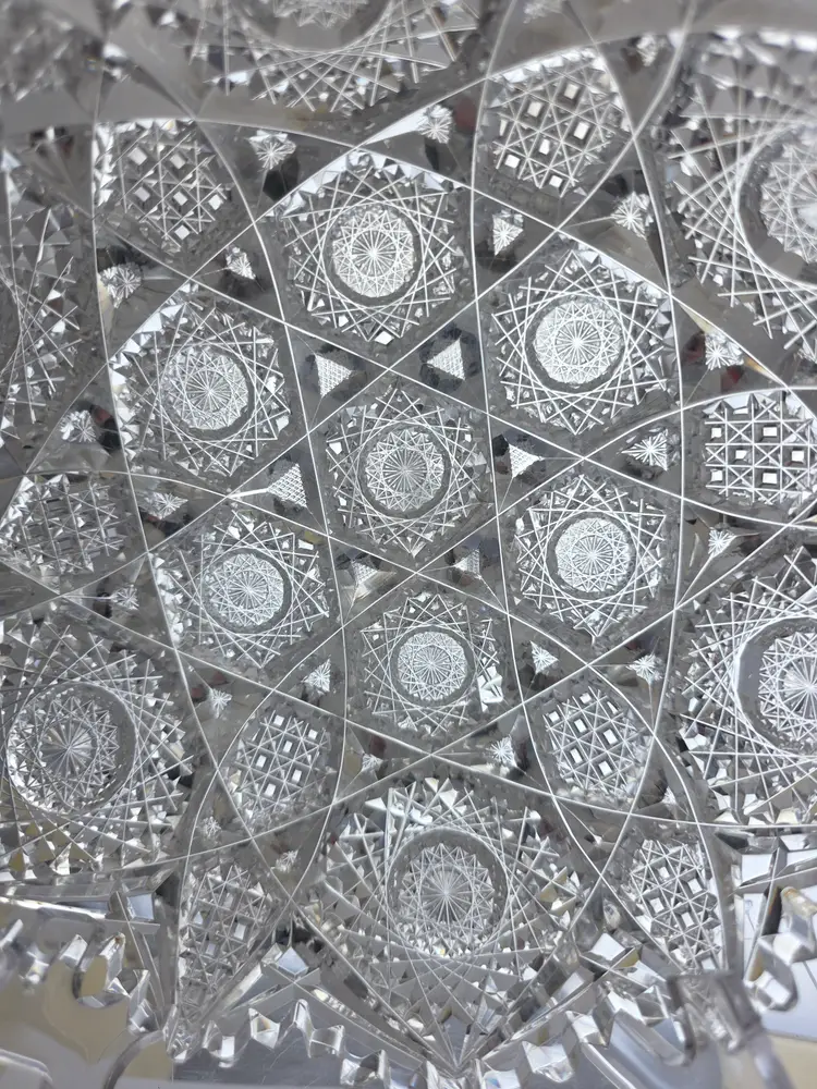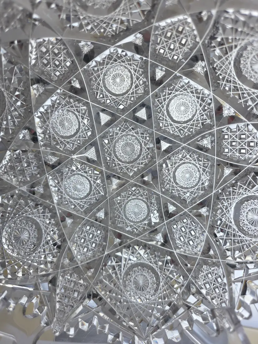 Exquisite ABP cut glass bowl featuring intricate geometric and starburst patterns. Perfect for display or serving. Measures approximately 8" in diameter. Egington cluster pattern