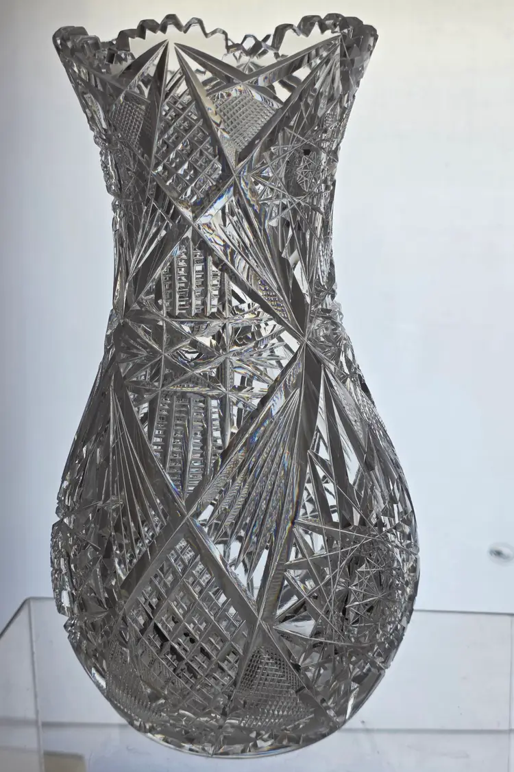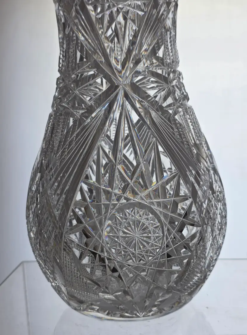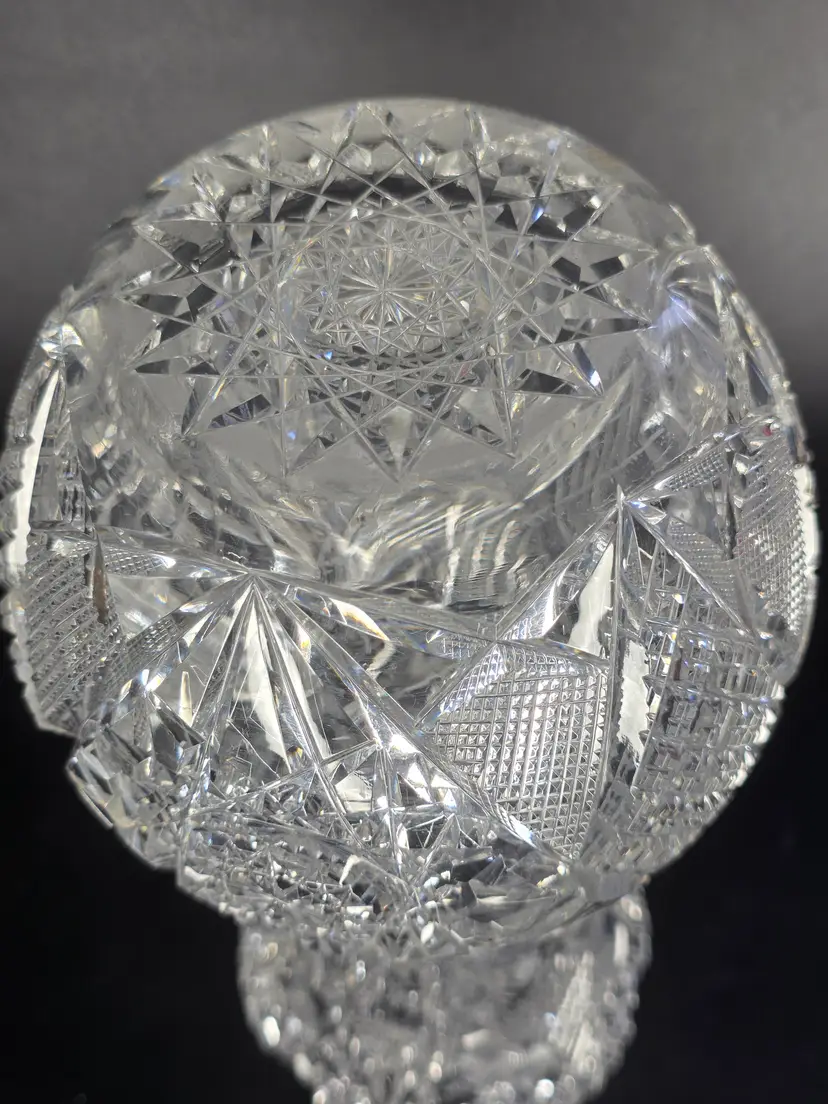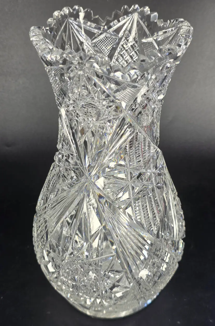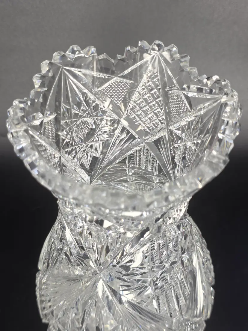 Stunning ABP cut glass vase with intricate patterns. Measures approximately 10" high.