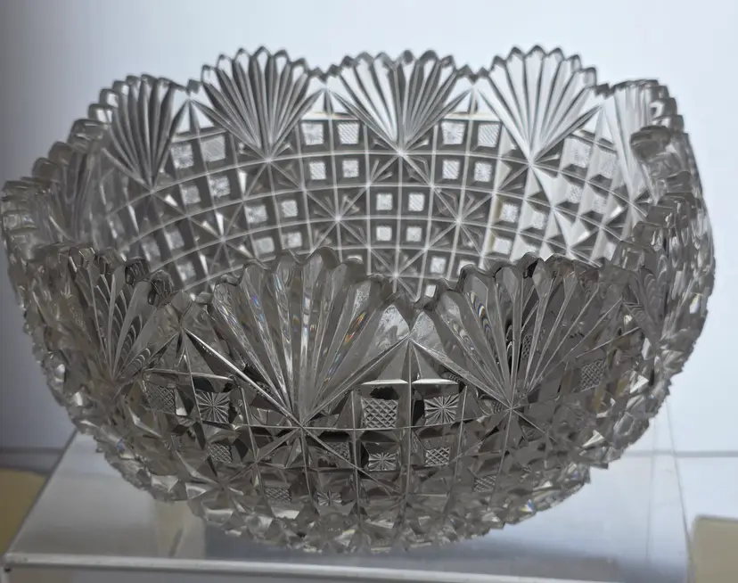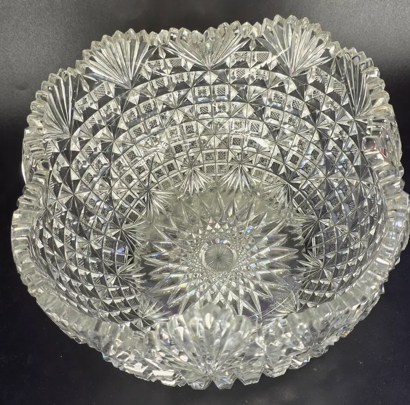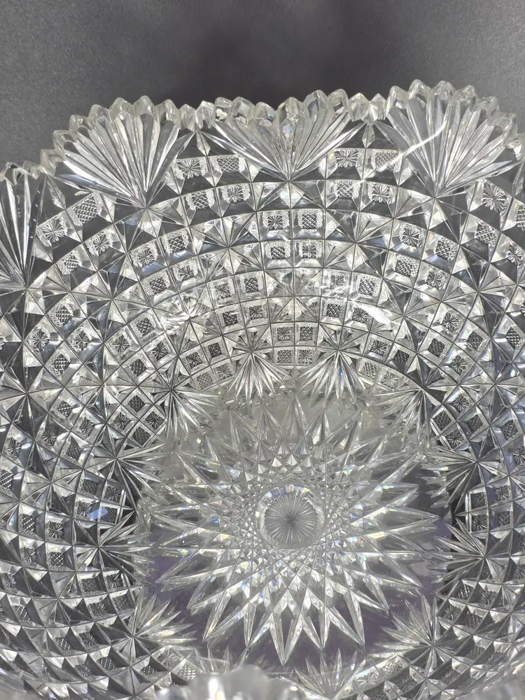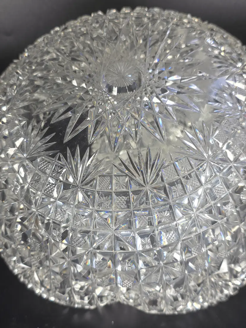 Stunning ABP cut glass bowl with intricate patterns. Measures approximately 9 square. Strawberry diamond and stars by Clark