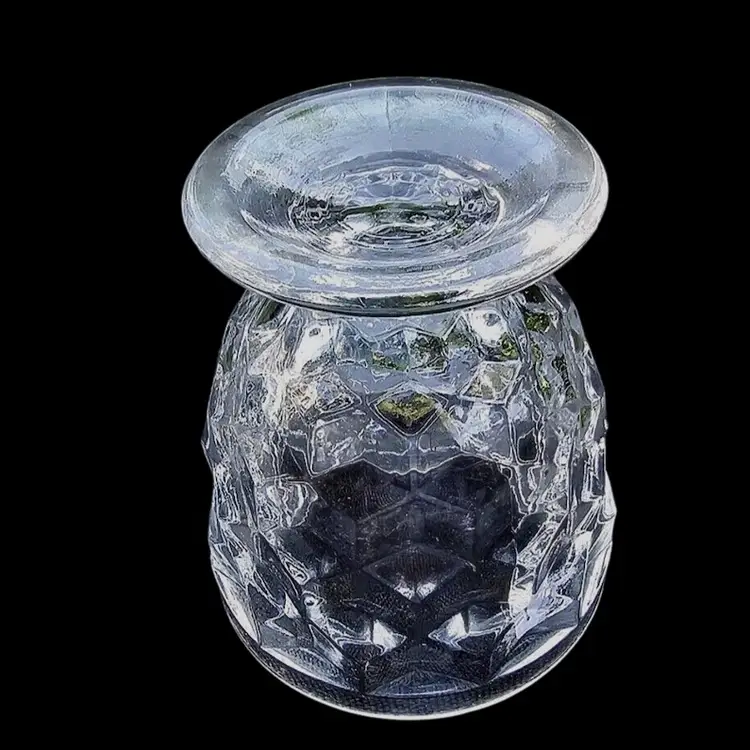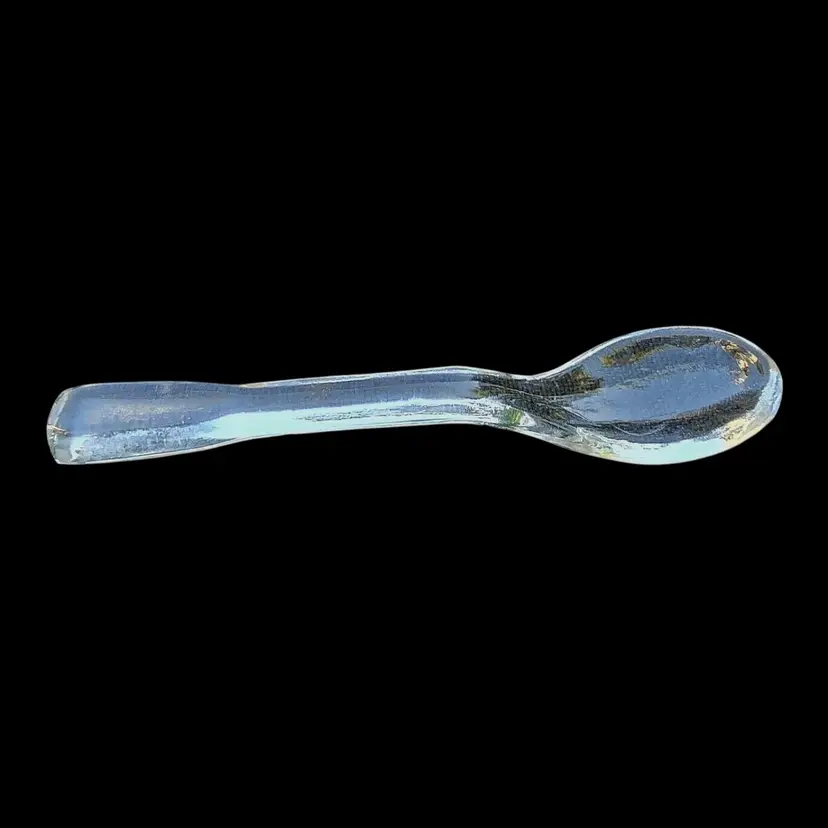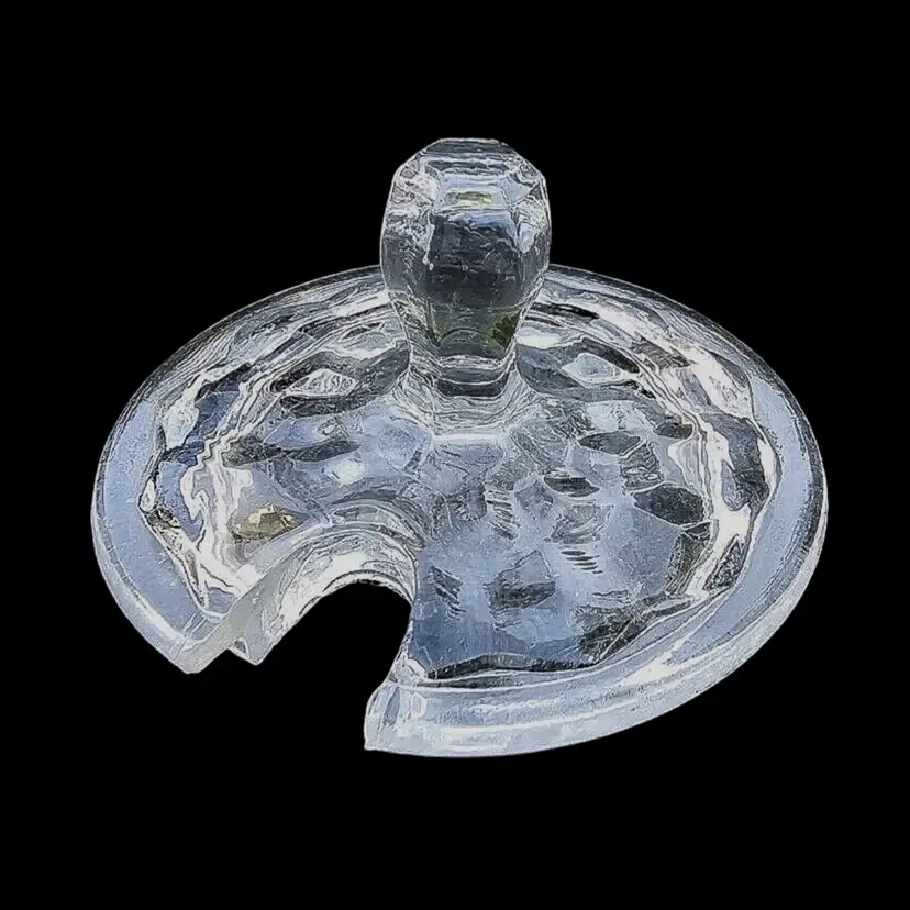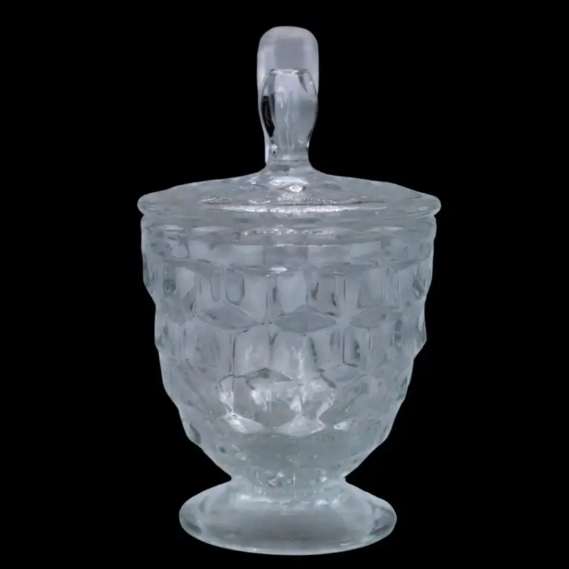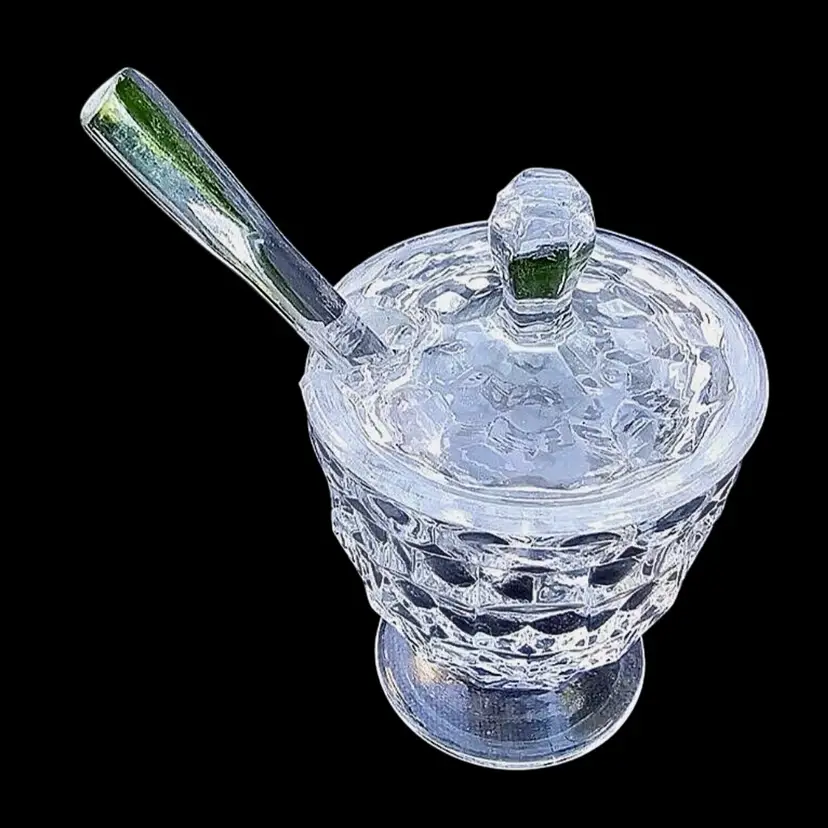This is a clear glass mustard pot with spoon in the American pattern by Fostoria. All three pieces are in excellent condition with no chips or cracks. The spoon is 4” long and the pot is 3.5” high with the top on. It is a mid century piece.