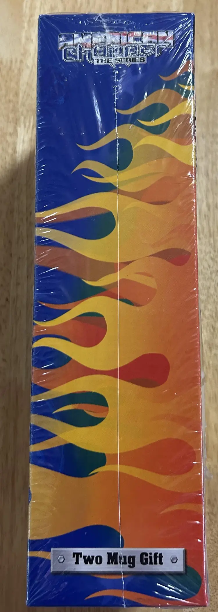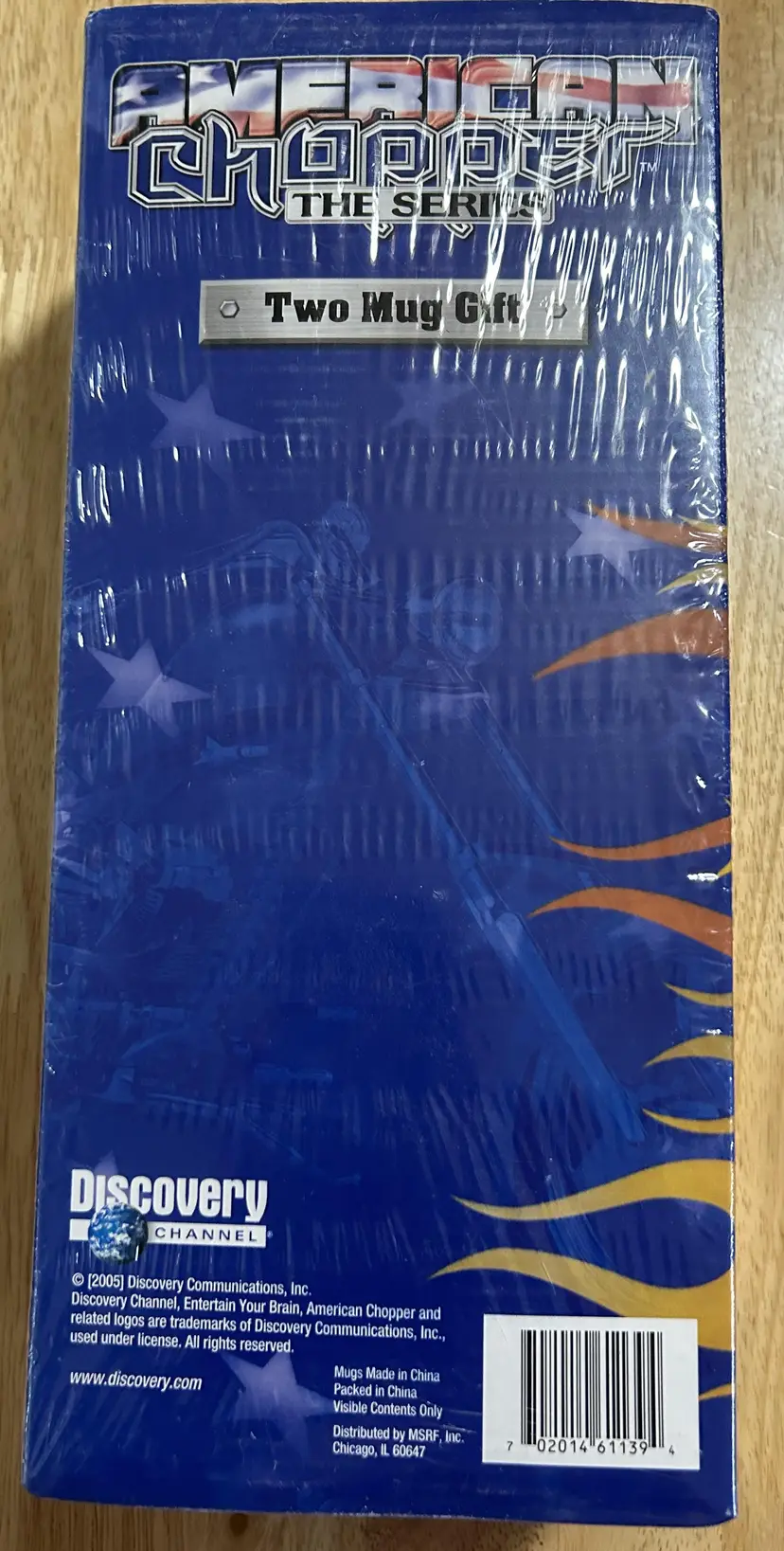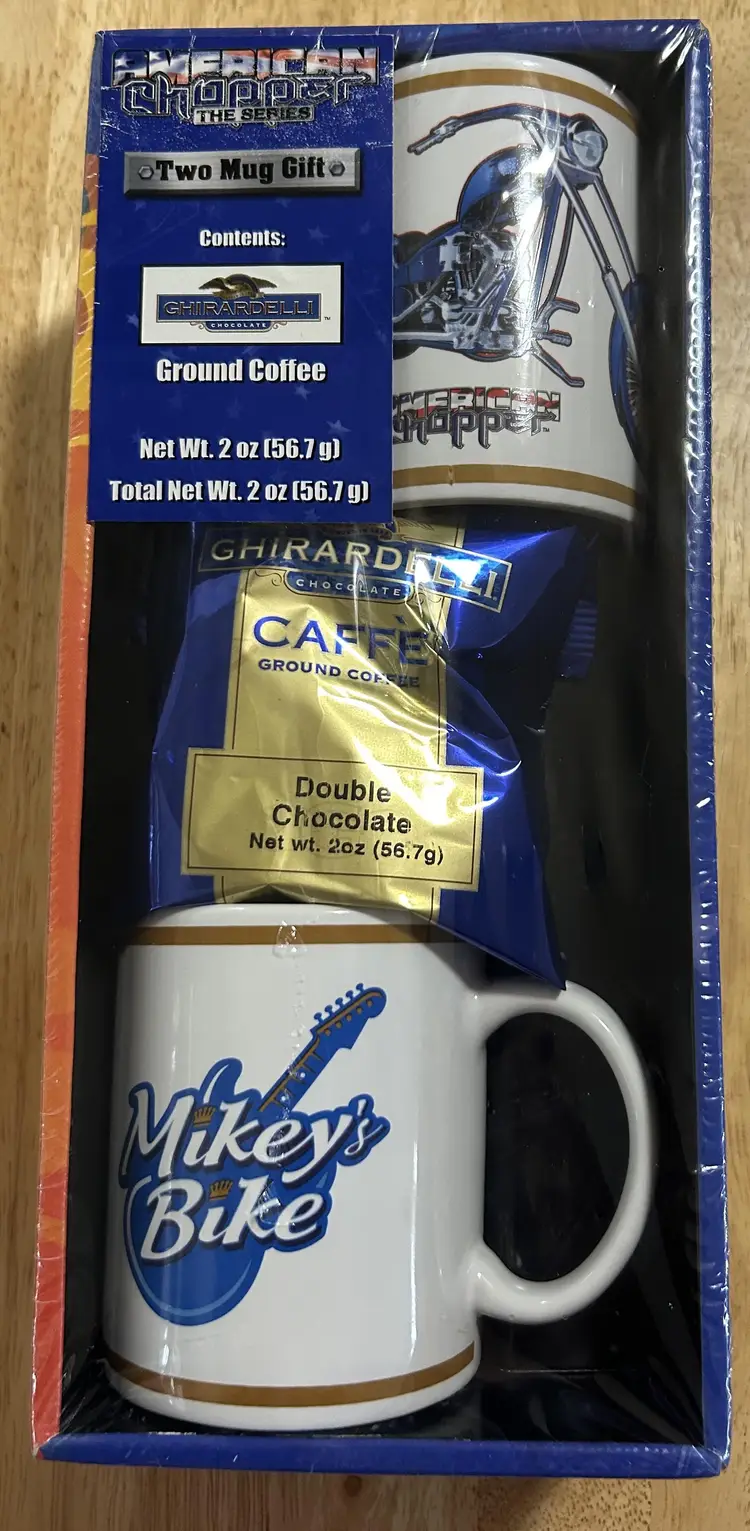 American Chopper The Series Two Mug Gift Set with Double Chocolate Ground Coffee. The set includes two coffee mugs along with Double Chocolate Coffee by Ghirardelli. New in original package. Circa 2005