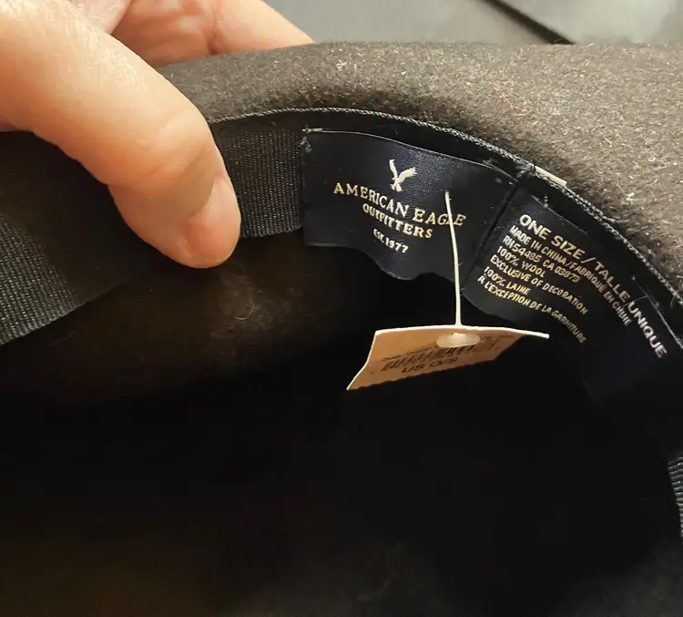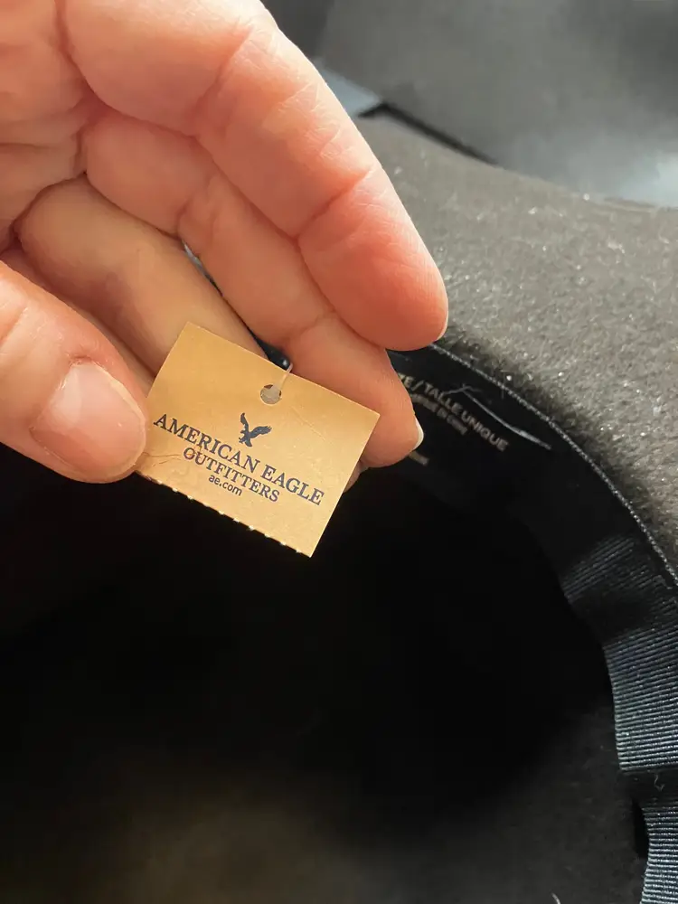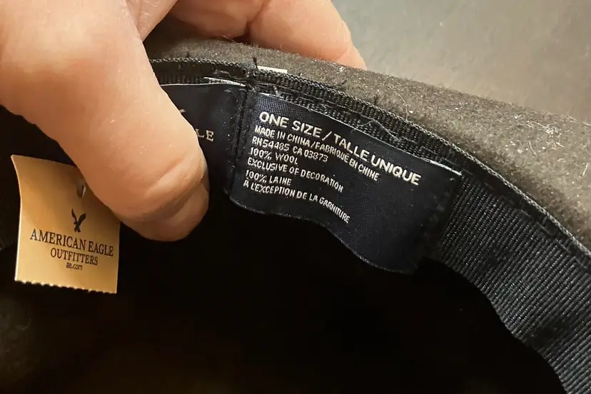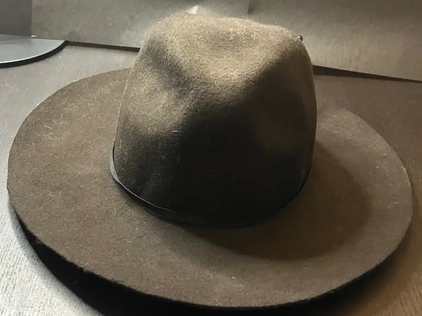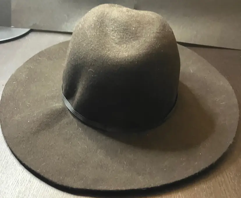 No rips or stain. Collapsible. Wool. Floppy.This was stored in a home with cats. I used a lint roller but I still see some cat hair on it. One size. Brim is 3 1/4" wide. Measures 14" from front to back and 13" from side to side.
