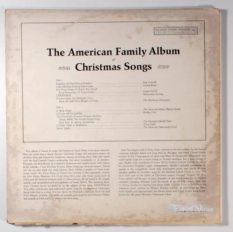 American Family Album of Christmas Songs, released by Columbia Special Products, is a compilation featuring a variety of traditional and popular Christmas songs performed by artists associated with Columbia Records. While specific details about the album’s release date and tracklist are limited, it is part of Columbia’s extensive catalog of holiday-themed albums, which often included contributions from prominent artists like Frank Sinatra, Johnny Cash, and Doris Day. The album holds historical significance as a product of Columbia’s efforts to curate festive music that resonated with American audiences during the mid-20th century, reflecting the era’s cultural emphasis on family-oriented holiday traditions. No specific hit singles are directly tied to this compilation in available records, but Columbia’s Christmas albums frequently featured iconic tracks like White Christmas or Have Yourself a Merry Little Christmas, which were popularized by artists on their roster. The album’s release under Columbia Special Products suggests it was likely a budget or promotional issue, aimed at broad distribution to capture the holiday market.