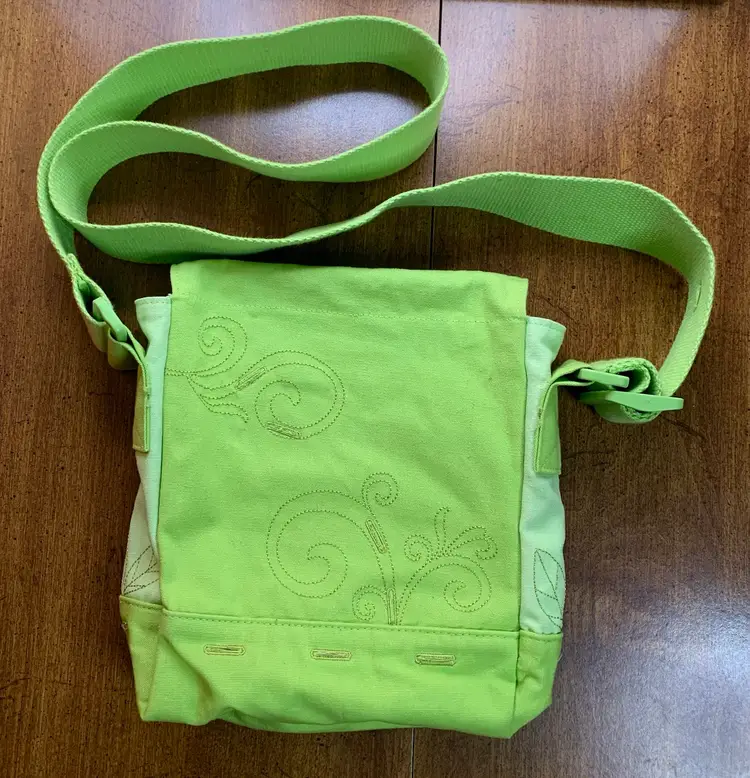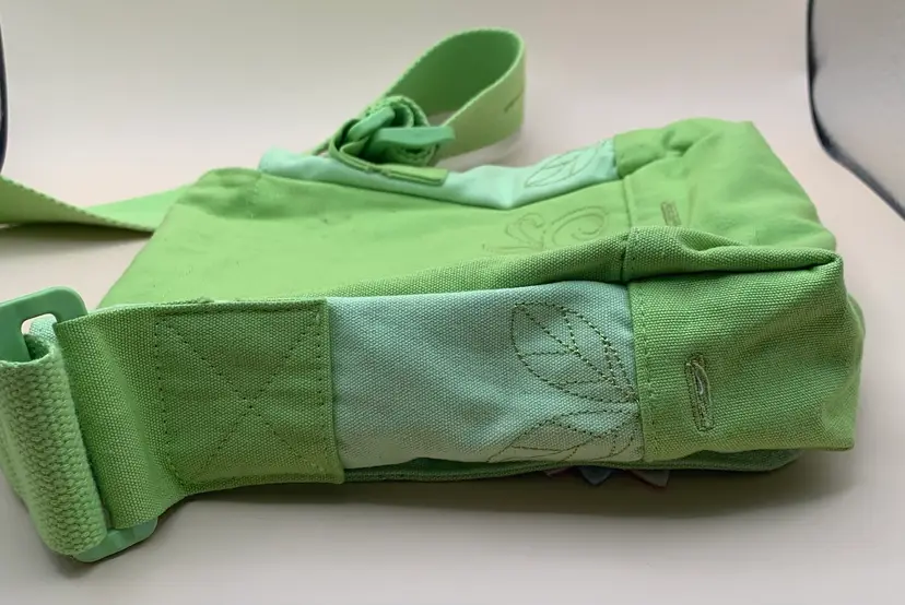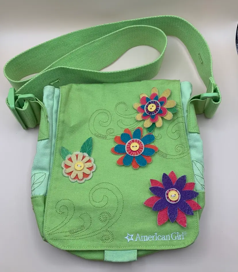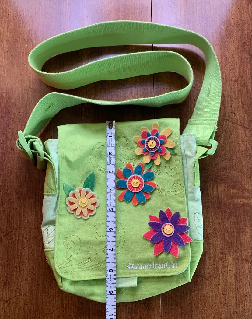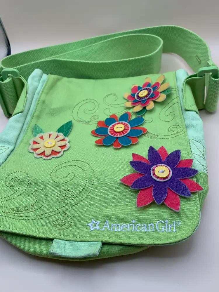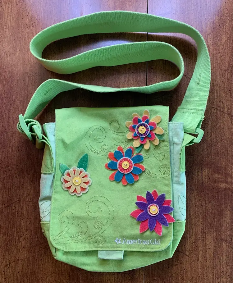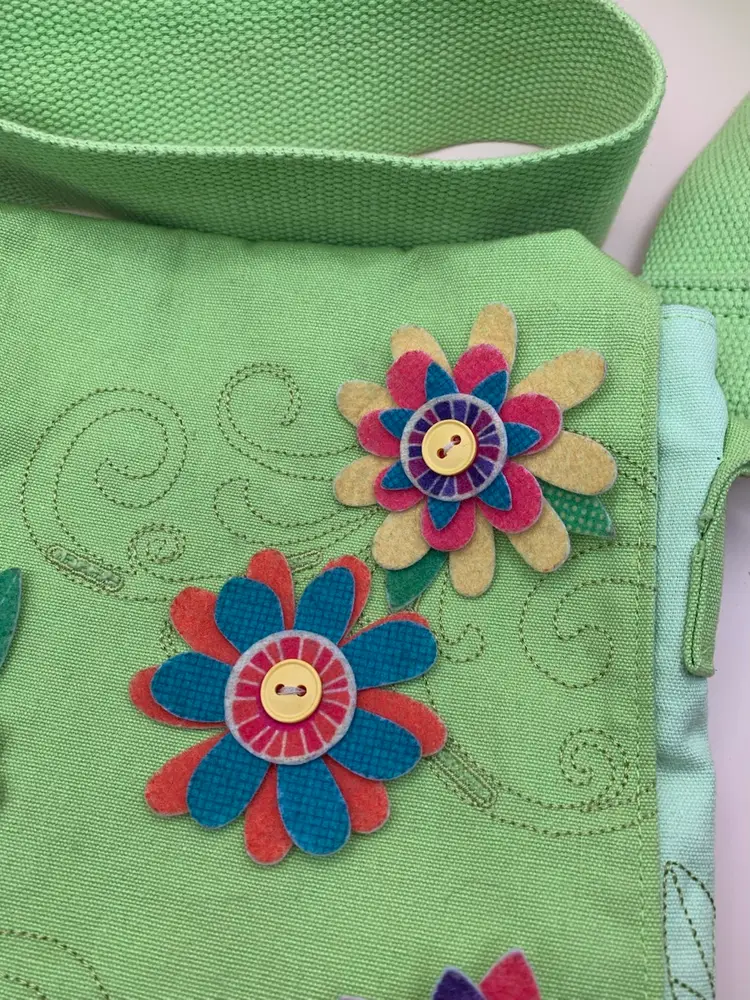 Decorated with felt flowers. Approximately 8.25 by 9”. In good condition. There is a little discoloration on some flower edges (dirt?).