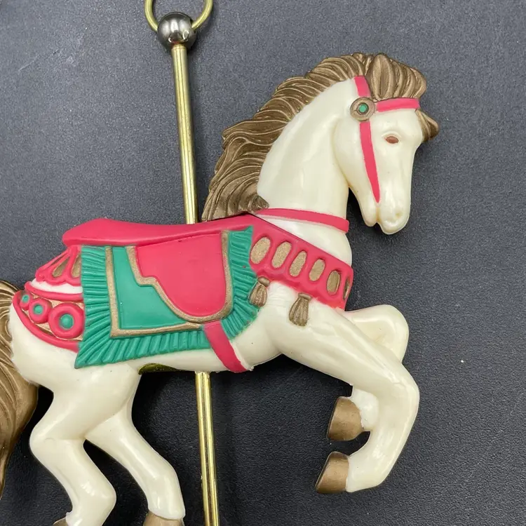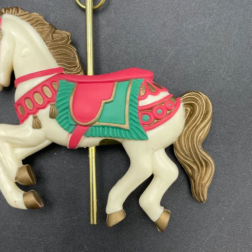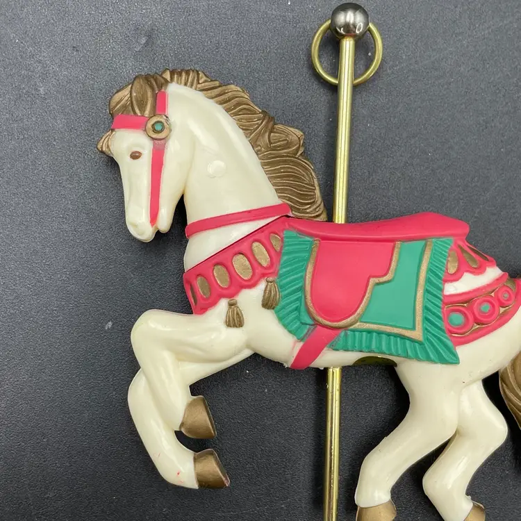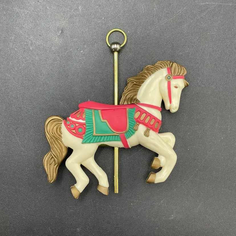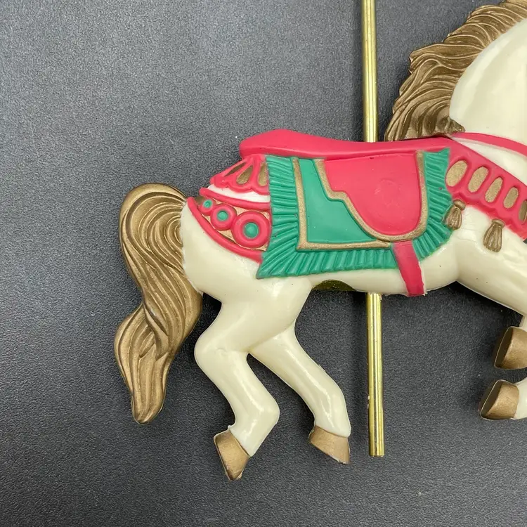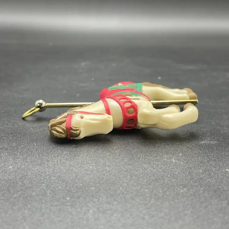 This is a vintage American Greetings plastic with metal pole carousel horse hanging ornament. Measures approximately 4" long x 4" wide. There is scuffing due to age and use. No major flaws.