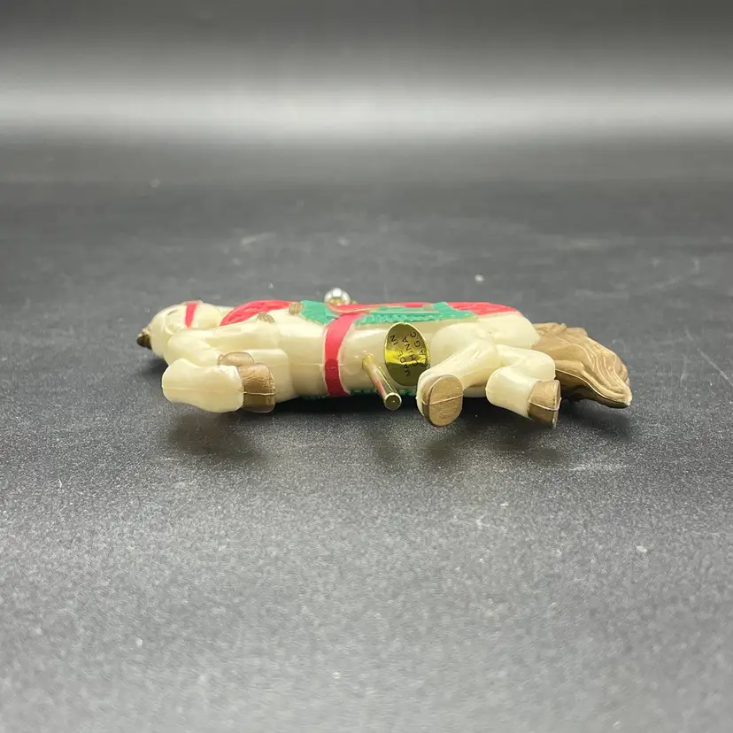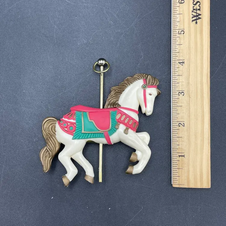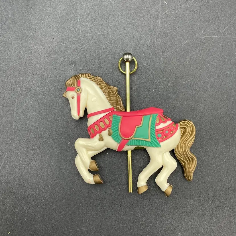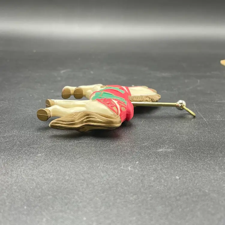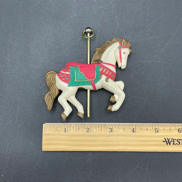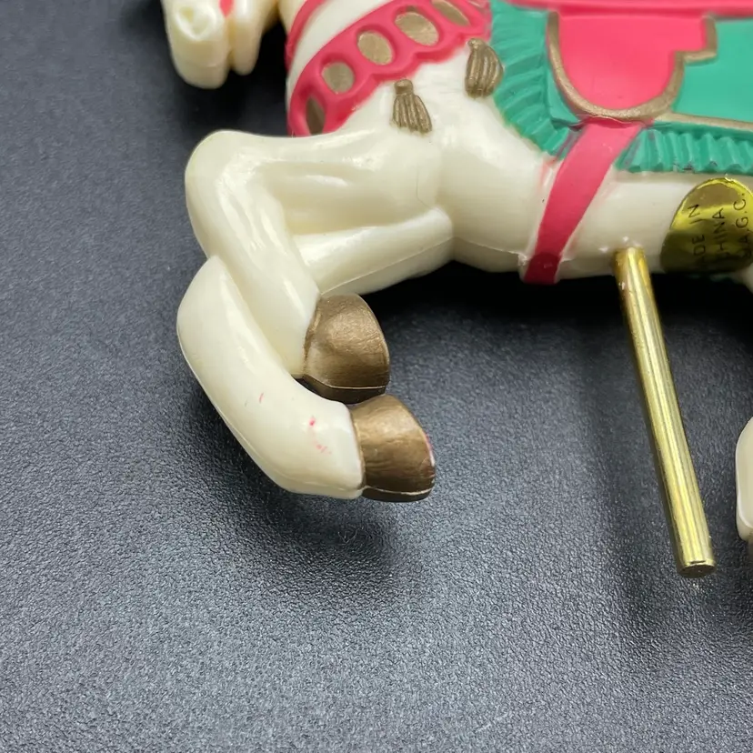 This is a vintage American Greetings plastic with metal pole carousel horse hanging ornament. Measures approximately 4" long x 4" wide. There is scuffing due to age and use. No major flaws.