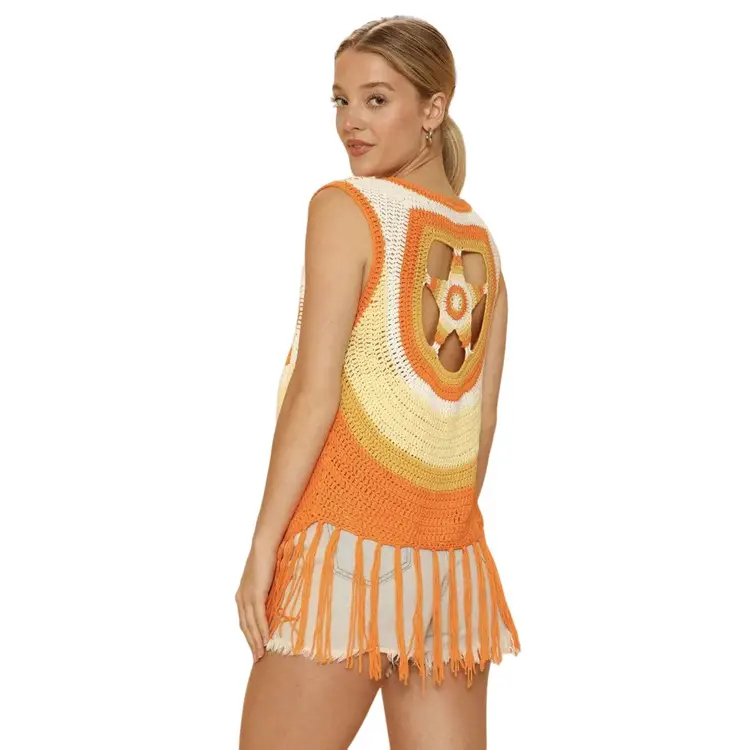 Crochet hippie fringe vest with Retro vibes from Miss Sparkling Star accent on back with orange, yellow and white colorway Crochet daisy top/gypsy hippie top/beach festival summer fall sweater top Materials: yarn/cotton Size XL Brand New in Package from manufacturer- no flaws Orange Multi Measurements taken flat: Armpit to armpit: 19" Shoulder to hem length: 29"