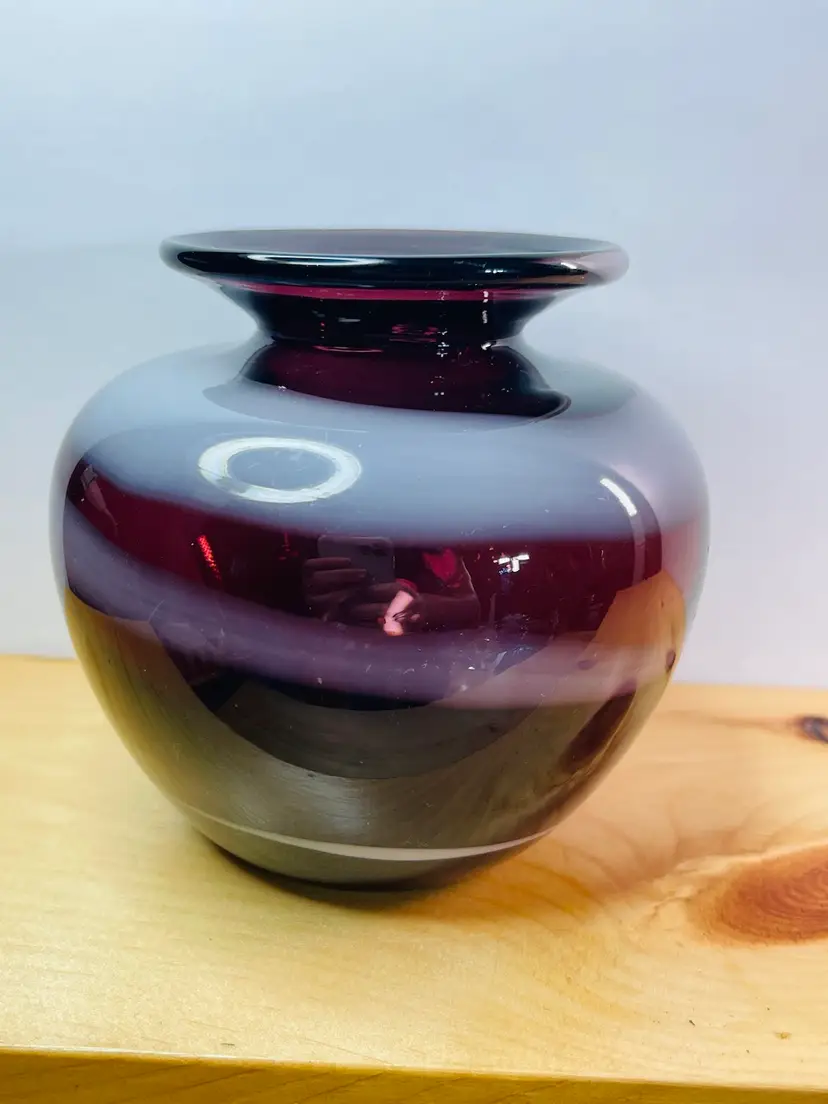 Vintage, amethyst glass vase with a white, swirling pattern.