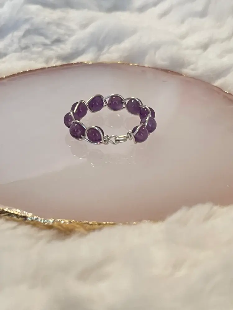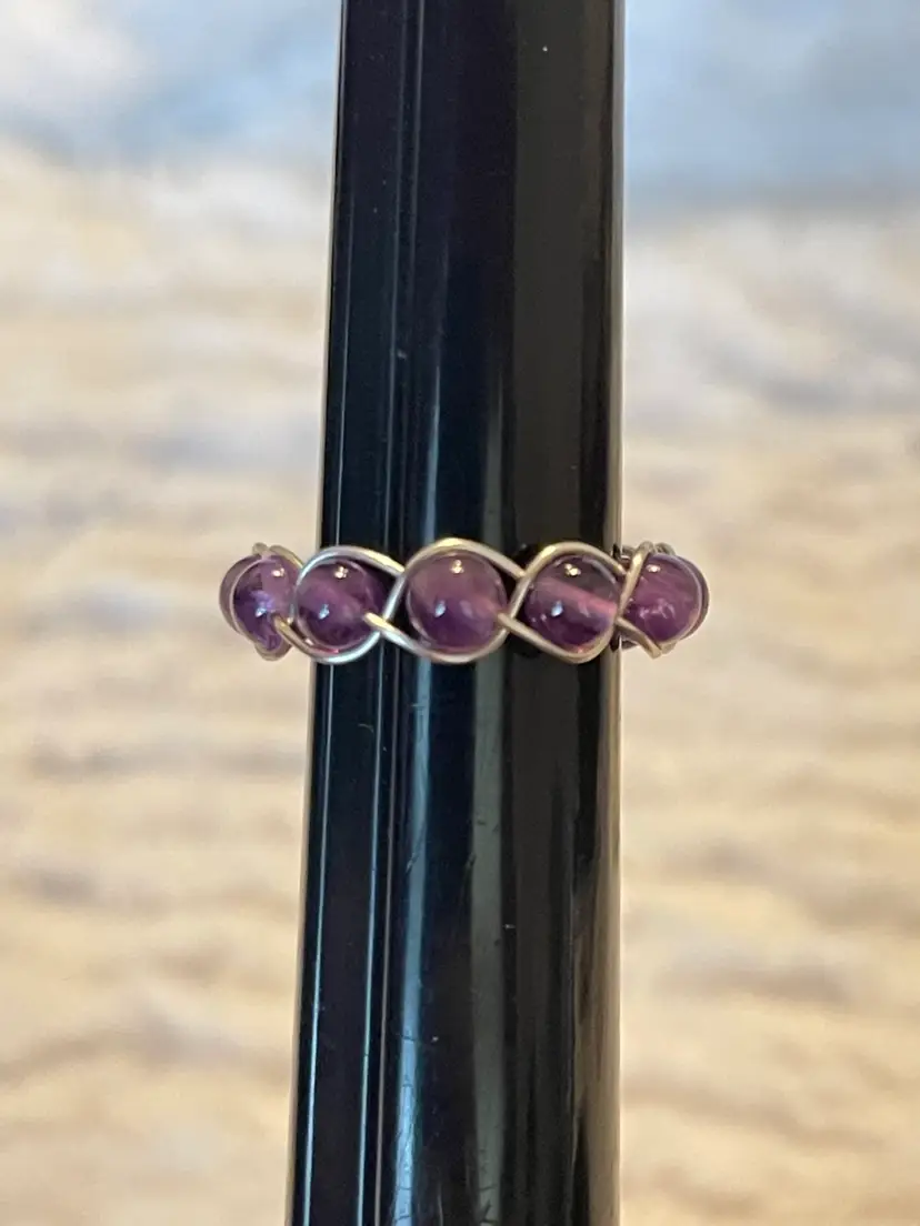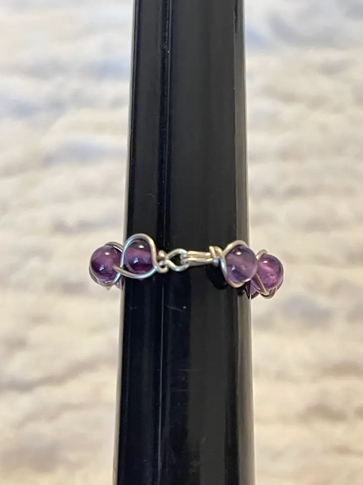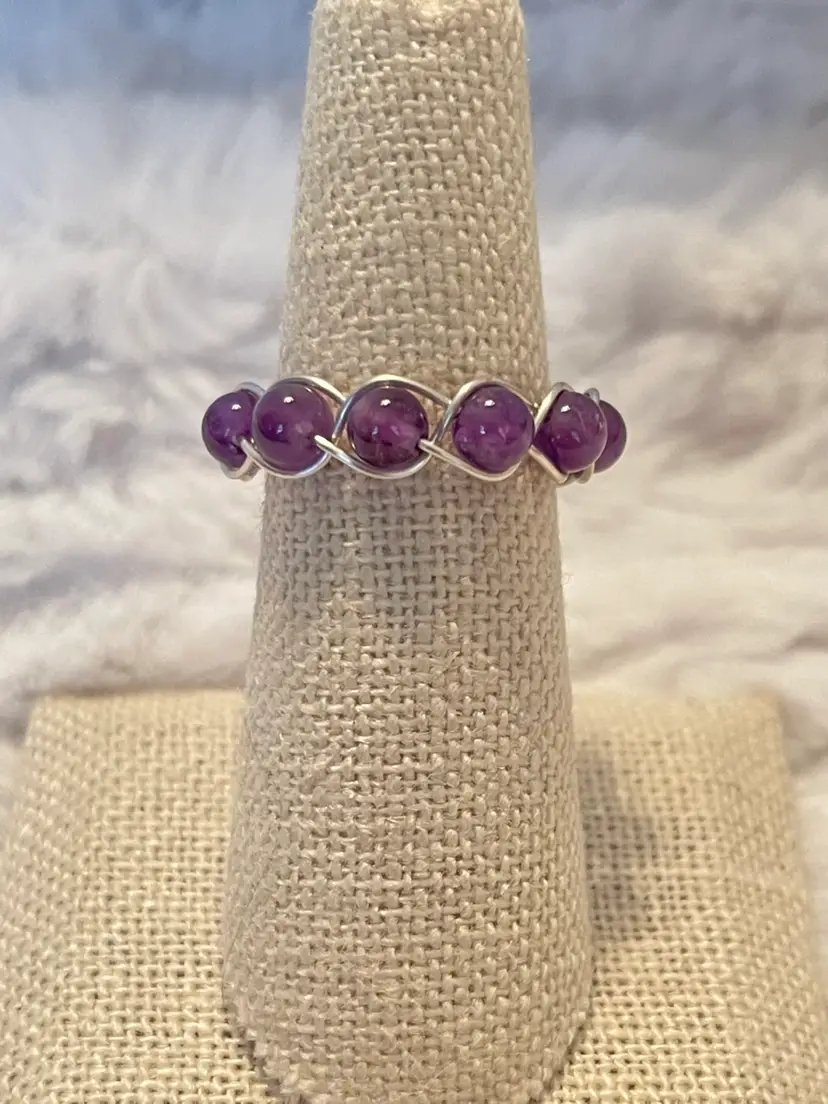 Handmade amethyst stones set in a delicate sterling silver plated wire wrap bezel design. This ring features softly rounded cabochon stones. Approximate size 7 New without tags.