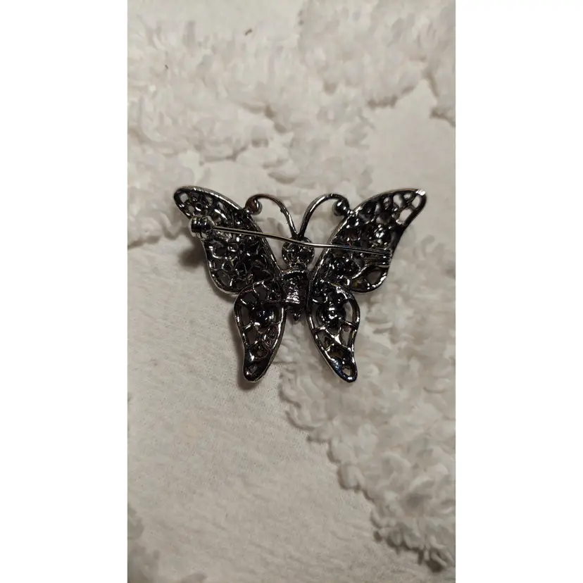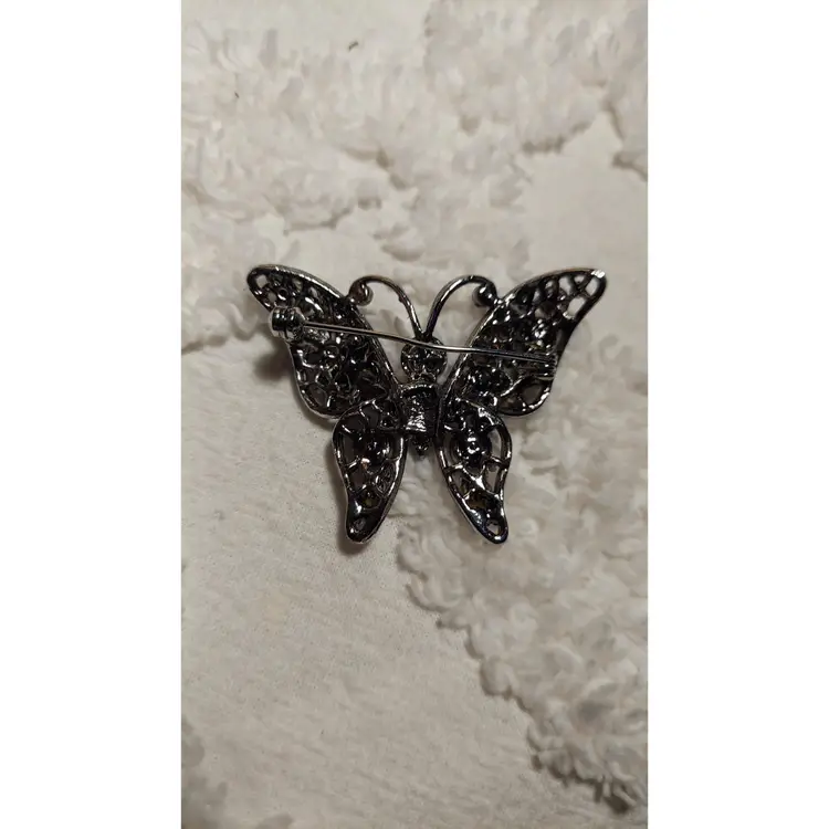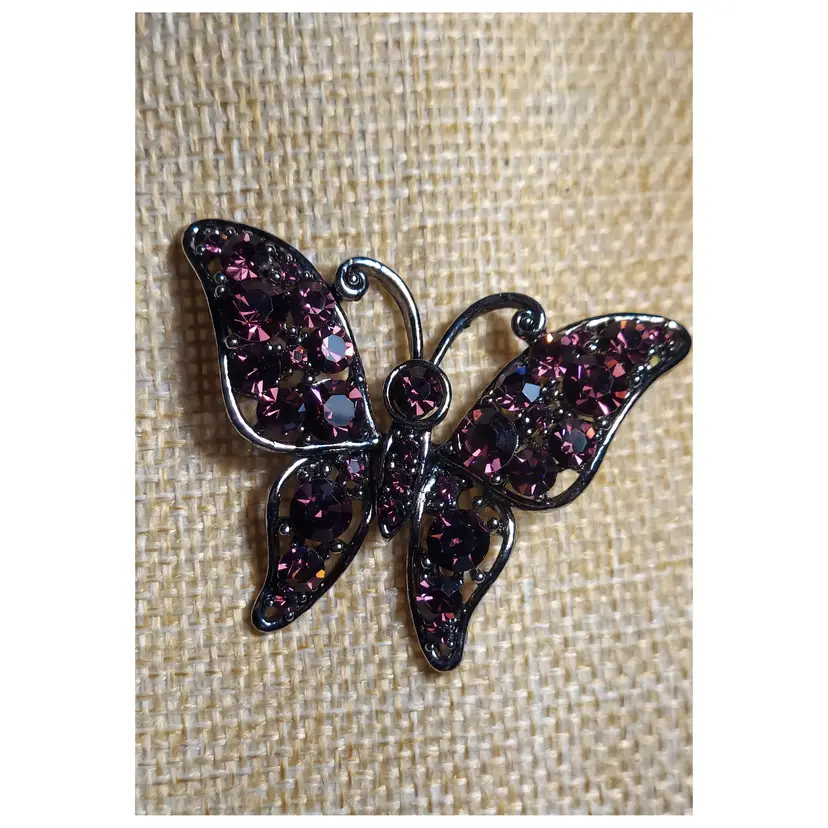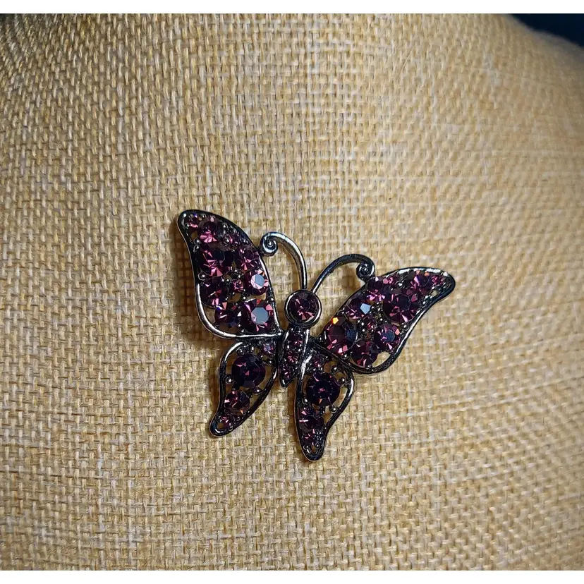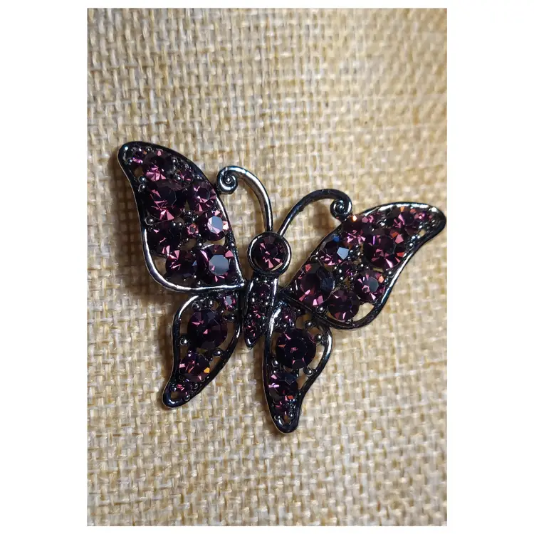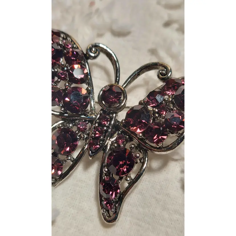 Beautiful and sparkly butterfly Brooch. The wings snd the body of the butterfly are completely encrusted with amethyst. No mark. New without tags. Silverstone metal