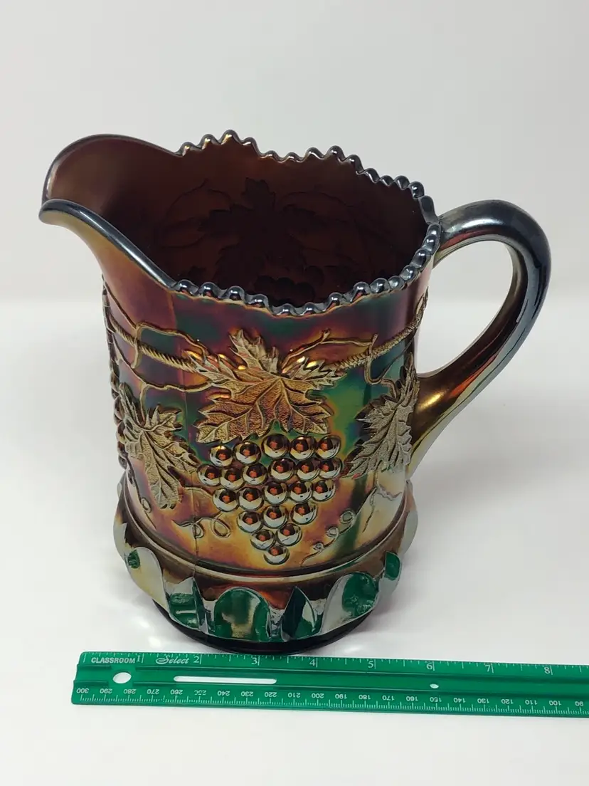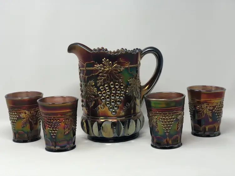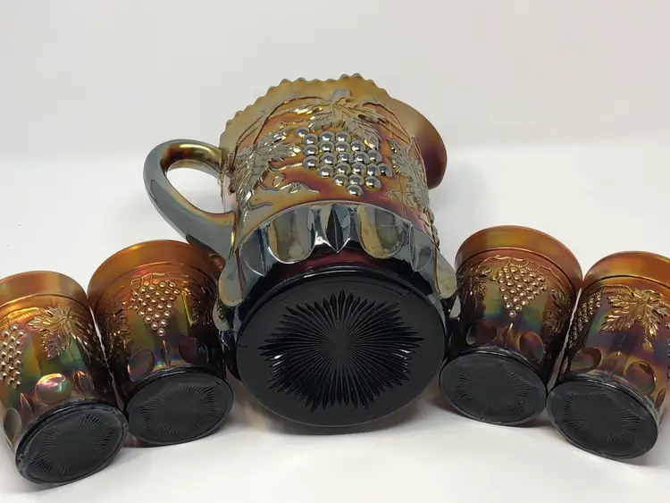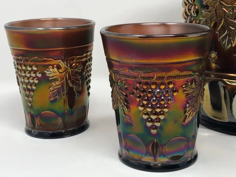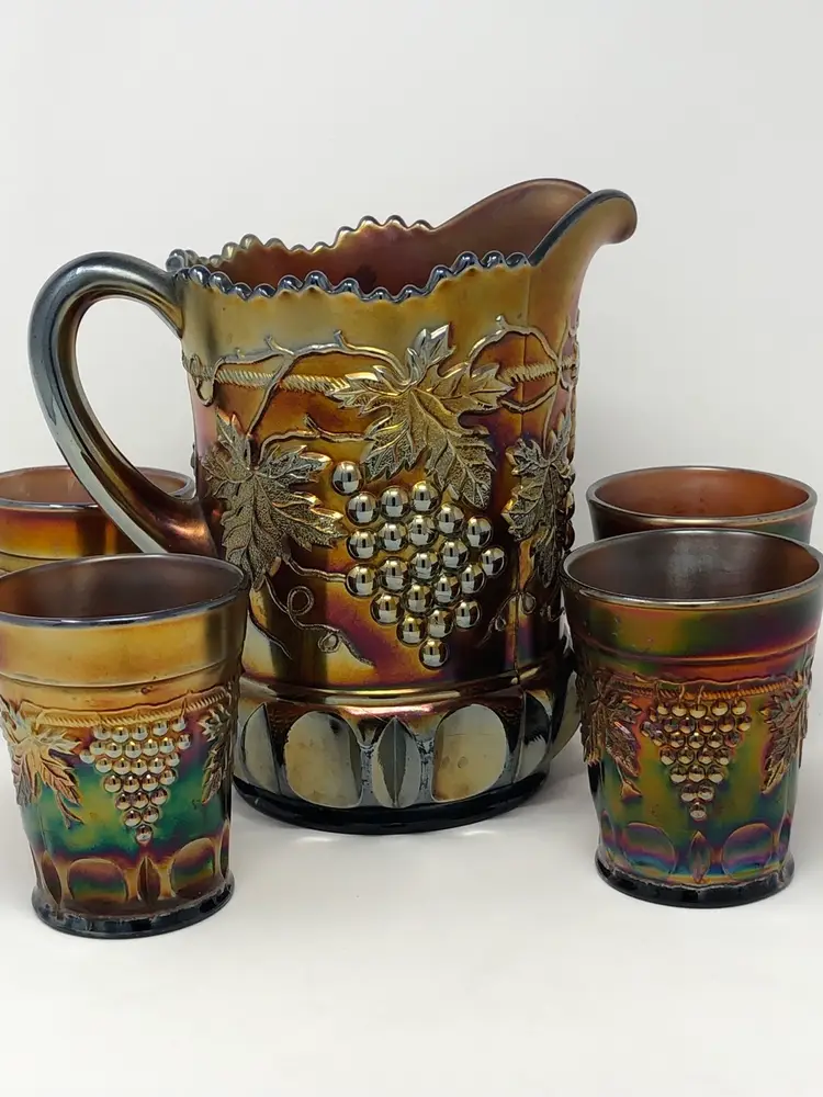 So splendid! This fantastic set is in Northwood’s Grape and Cable design and the iridescence is brilliant! The base color is purple/amethyst and each piece is marked with the Northwood N. Beautiful vintage condition, as shown in photos