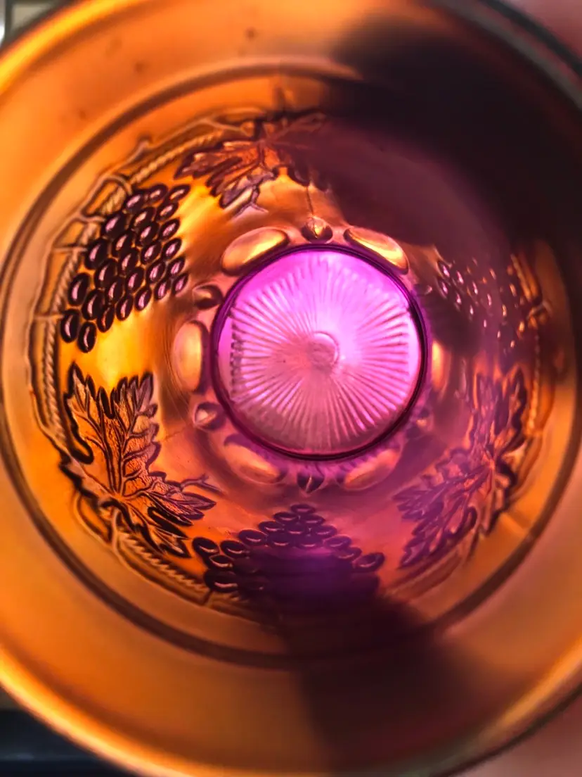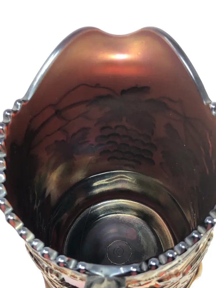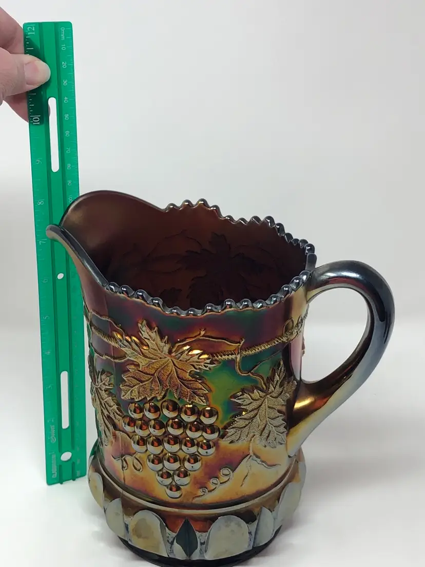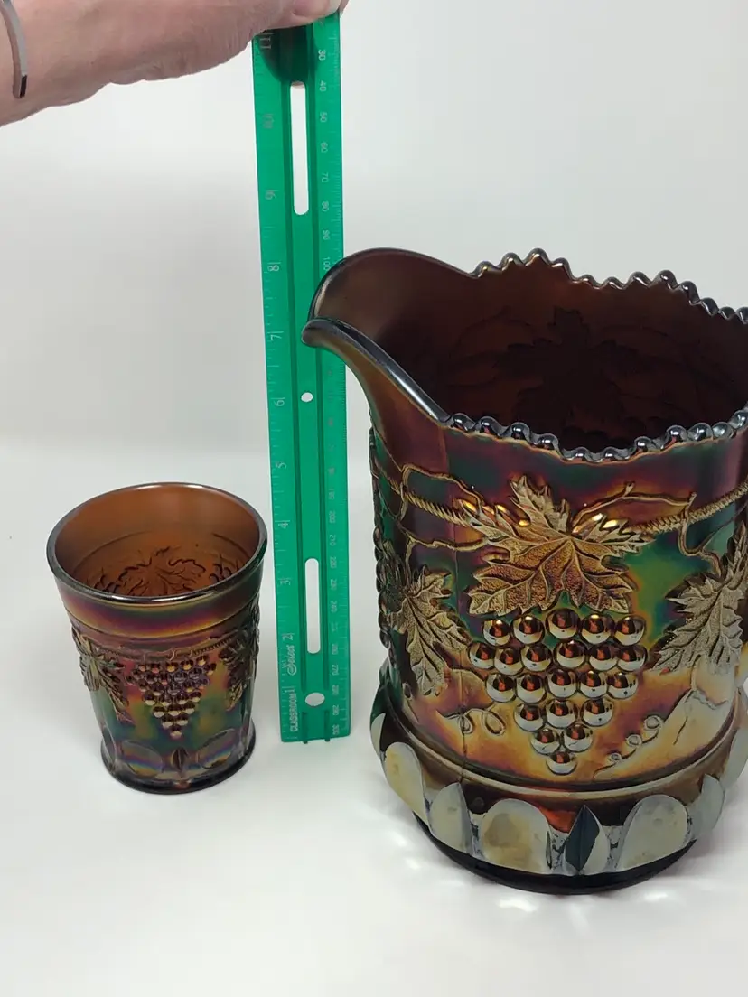 So splendid! This fantastic set is in Northwood’s Grape and Cable design and the iridescence is brilliant! The base color is purple/amethyst and each piece is marked with the Northwood N. Beautiful vintage condition, as shown in photos