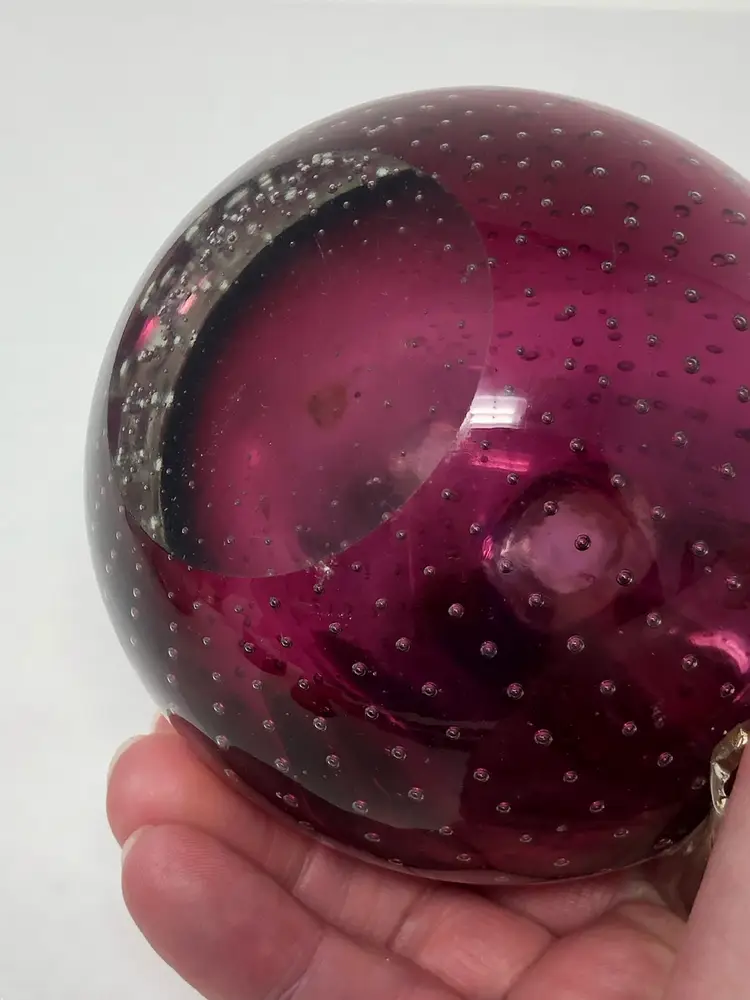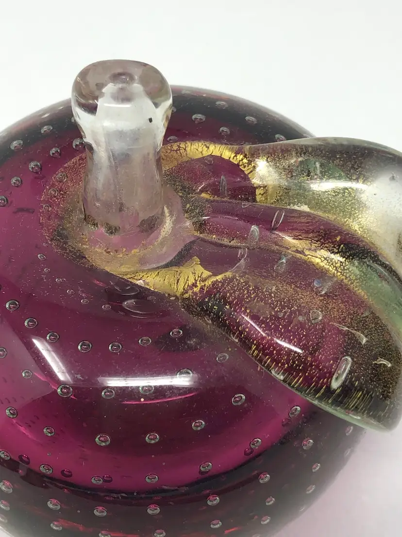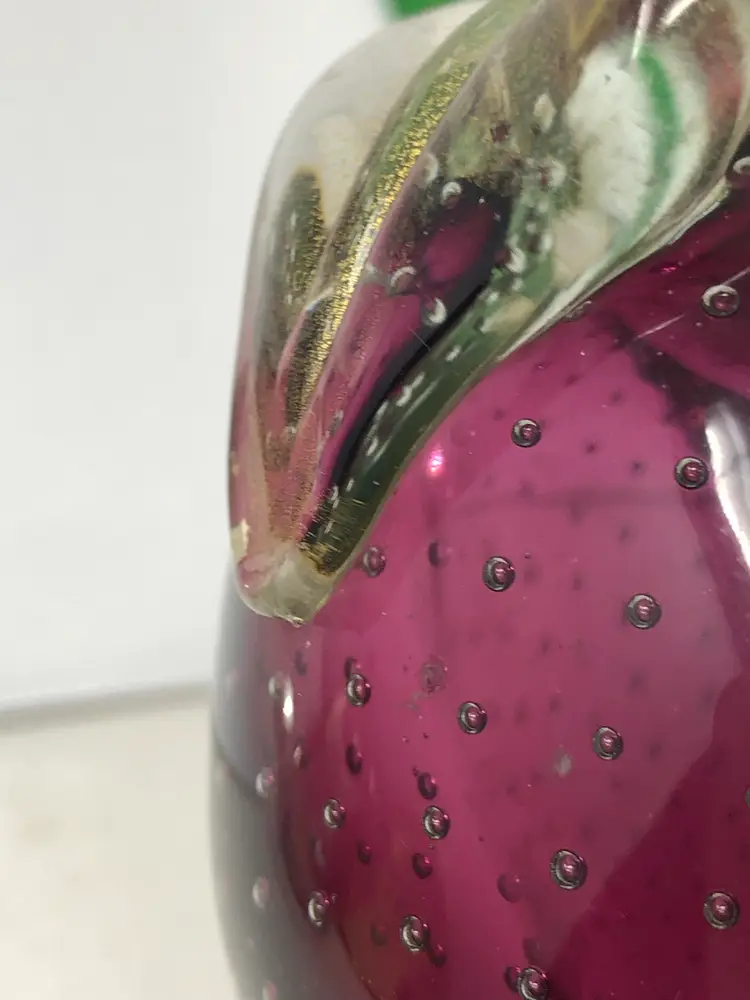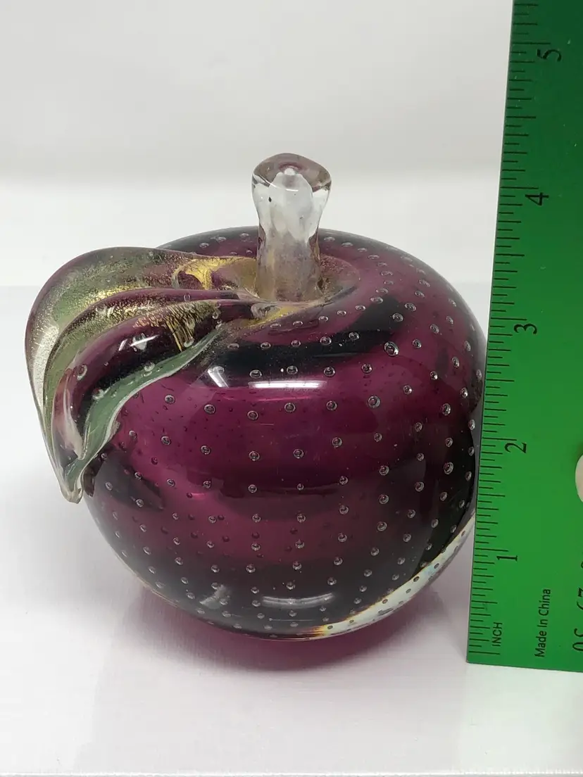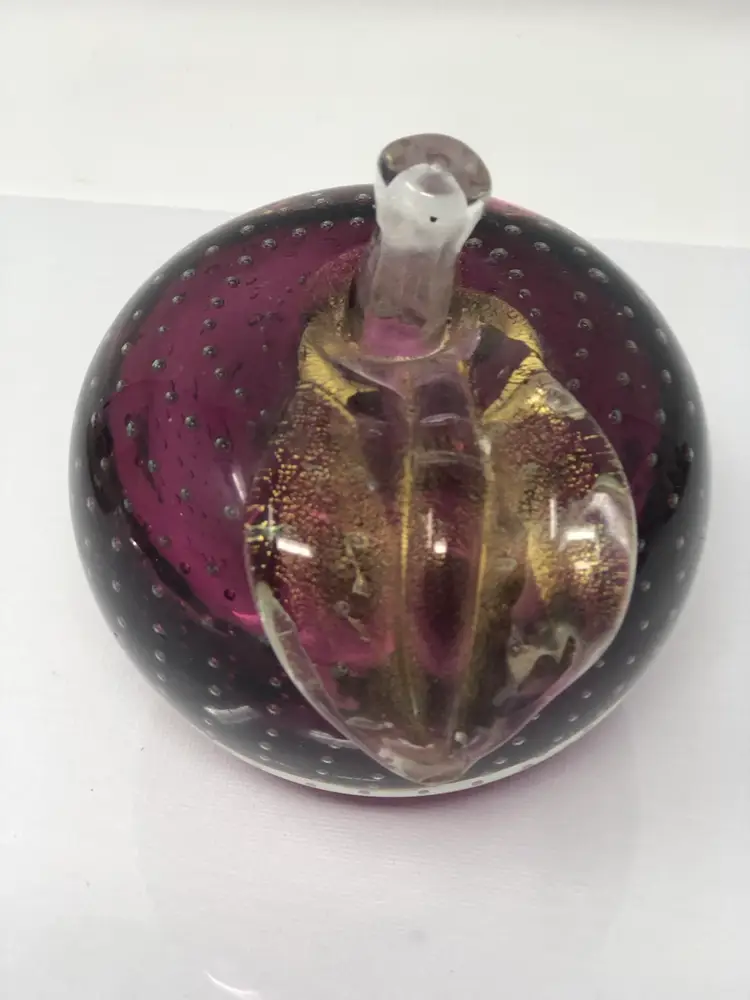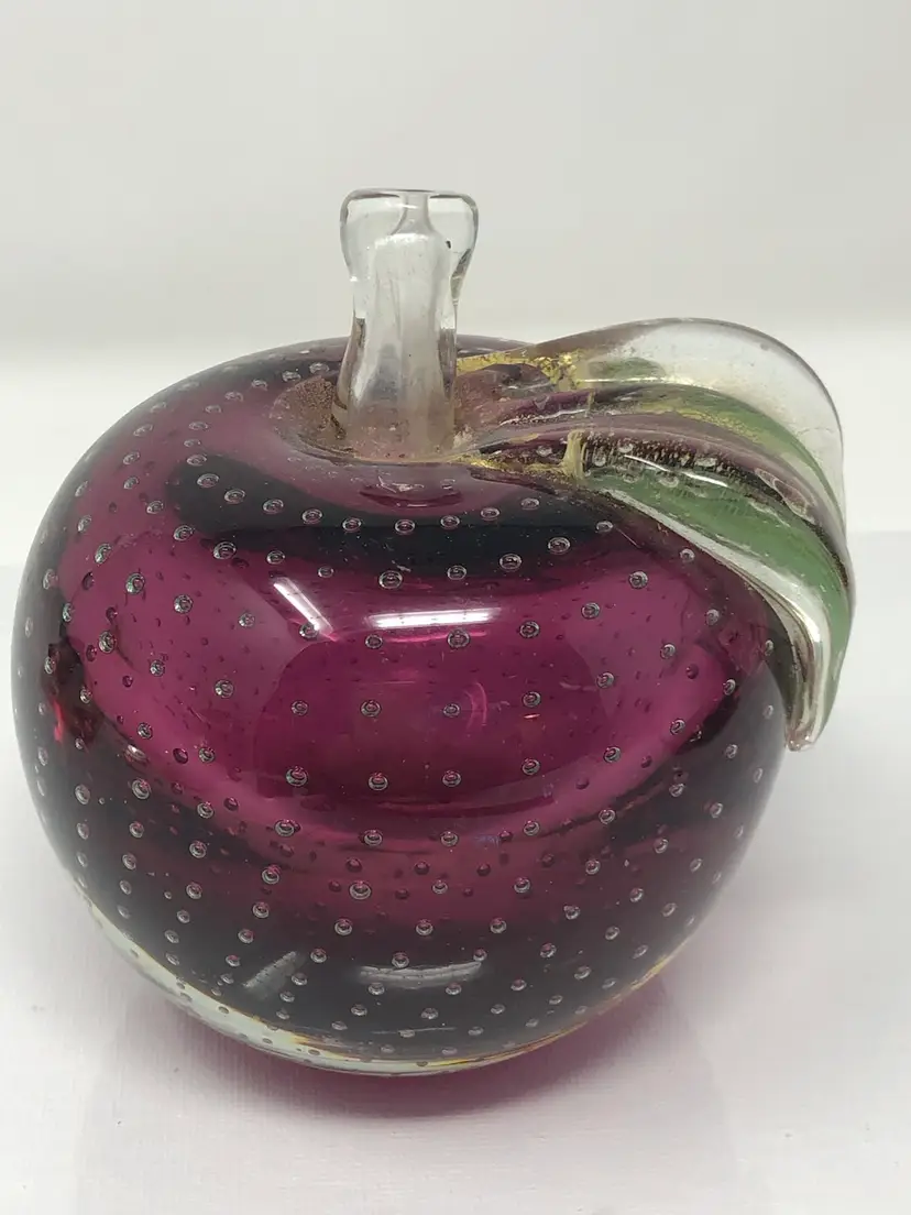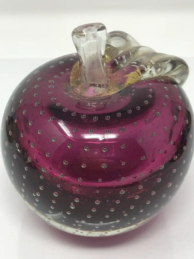 4" glass apple with clear over amethyst glass has applied leaf with gold fleck and controlled pattern of bubbles throughout. No markings or labels, one small chip on the highly polished base