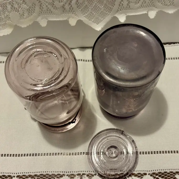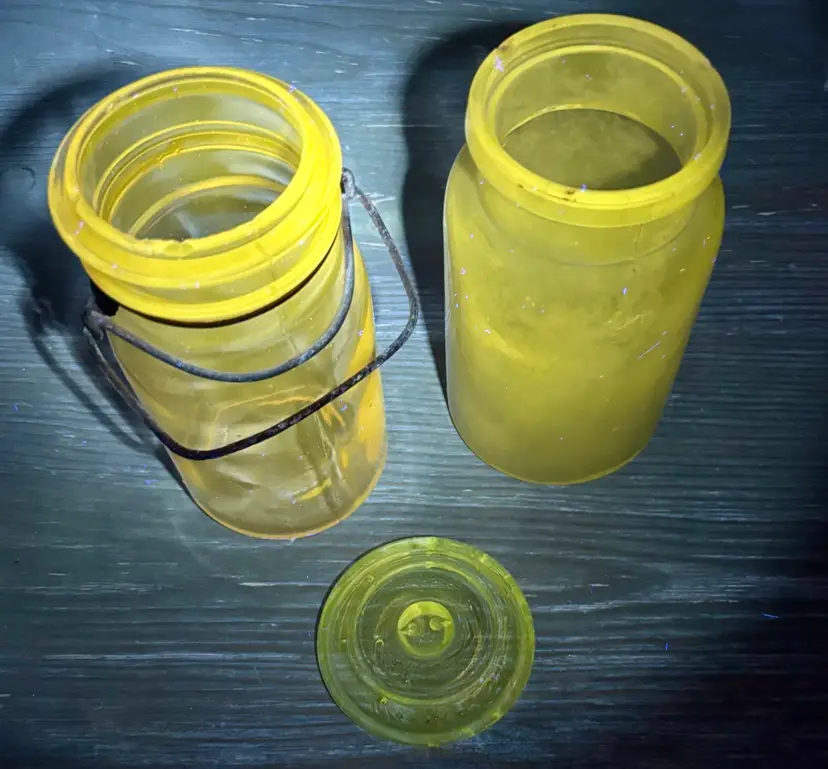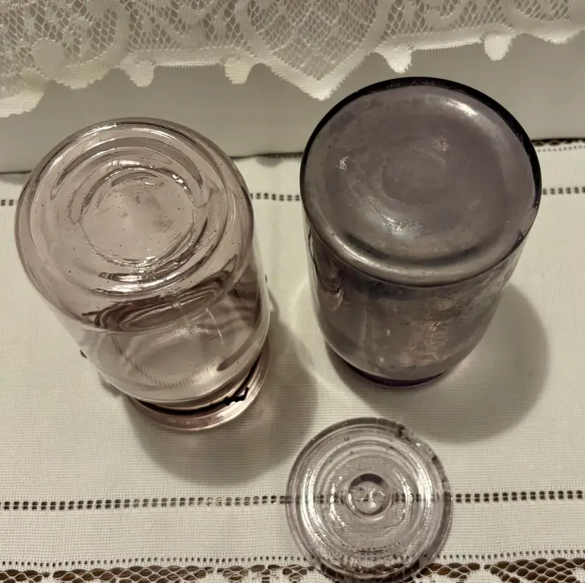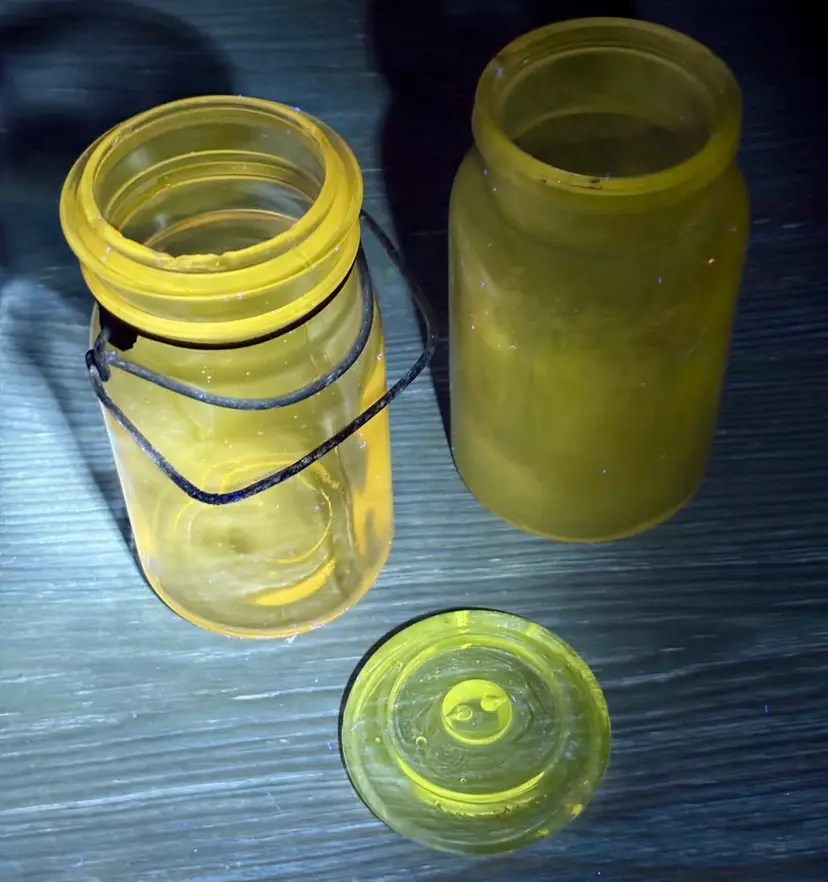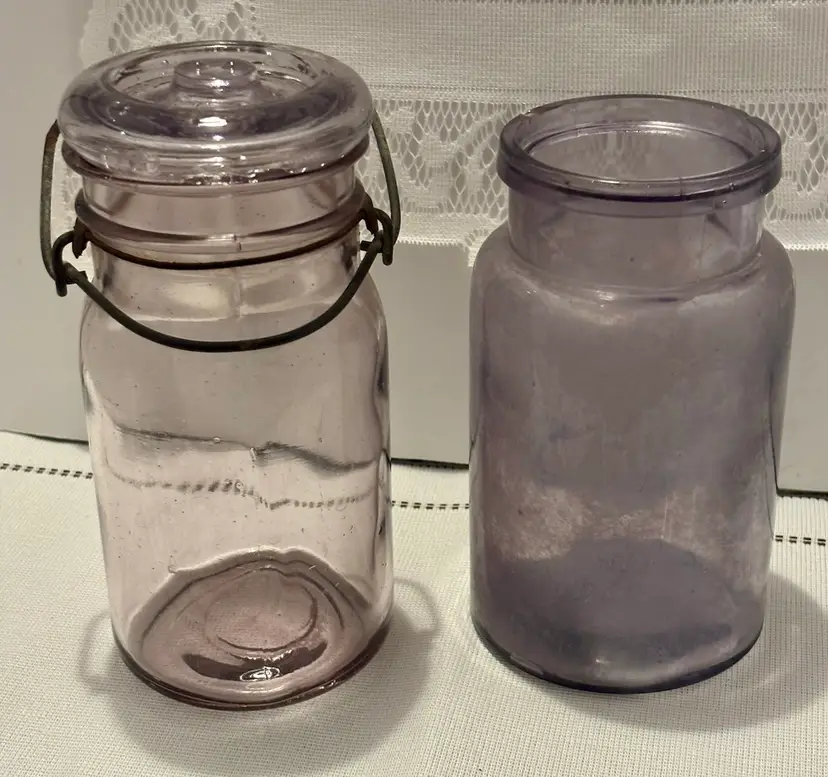 2 jars 1 lid Has several chips see all photos for full descriptions Great farmhouse/primitive/rustic/old english/cottage core decor pieces! Light purple color but glows green! ππ These are very RARE but because of the chips(which I think add to the nostalgia and beauty) I have them at a great price! Glow is under a 365 black light
