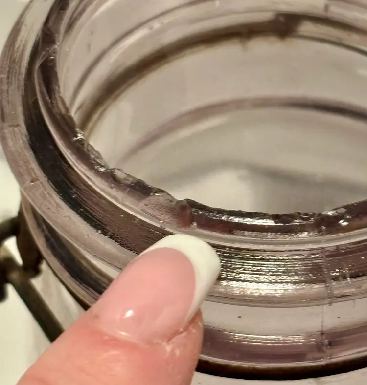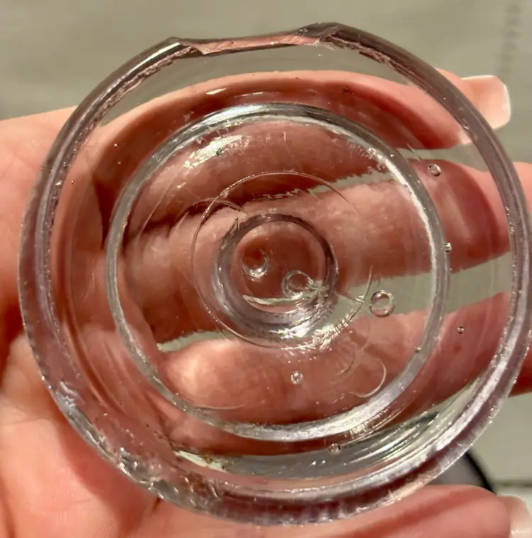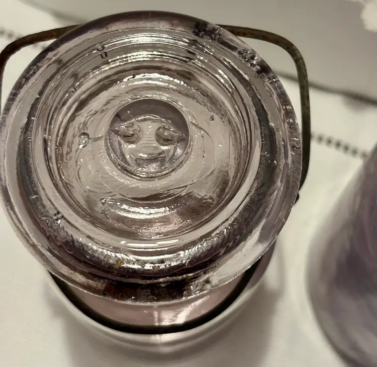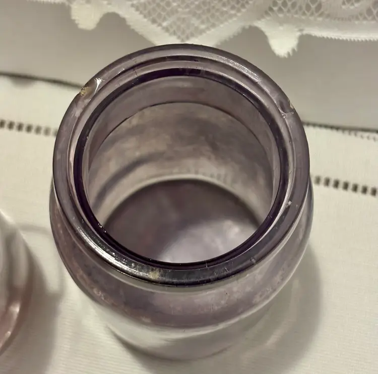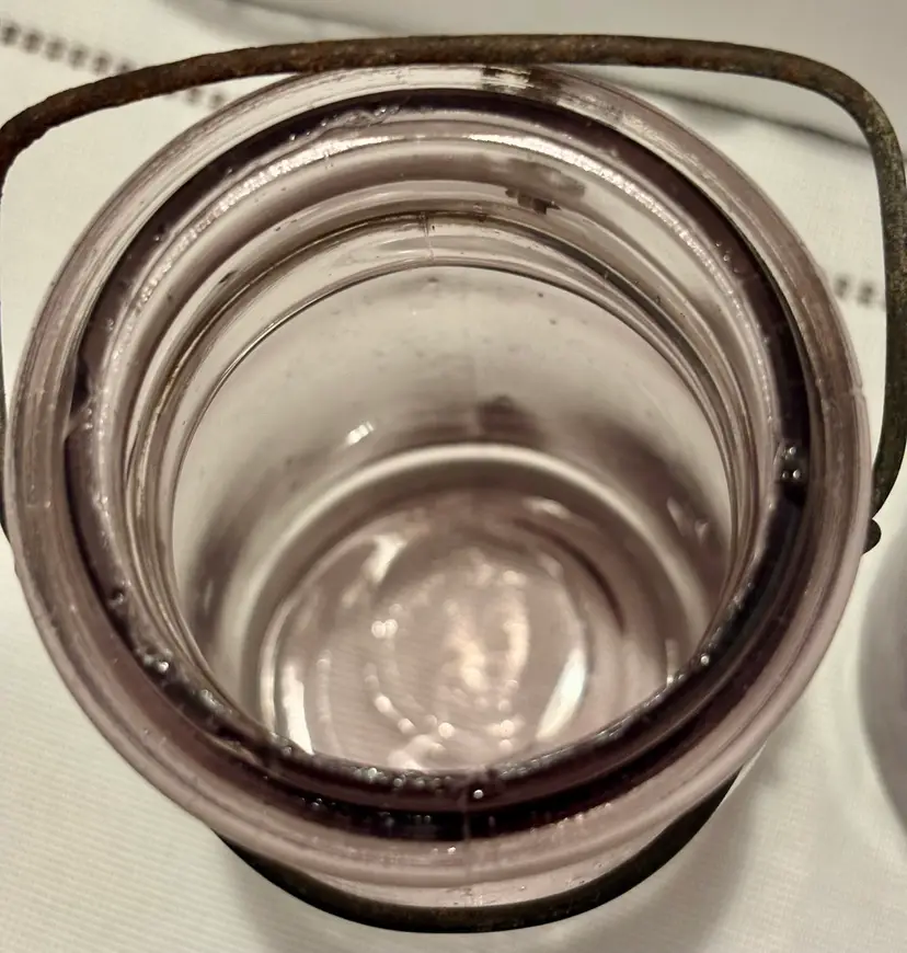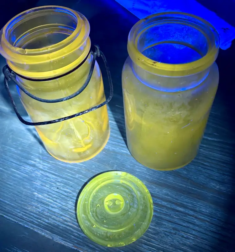 2 jars 1 lid Has several chips see all photos for full descriptions Great farmhouse/primitive/rustic/old english/cottage core decor pieces! Light purple color but glows green! ππ These are very RARE but because of the chips(which I think add to the nostalgia and beauty) I have them at a great price! Glow is under a 365 black light