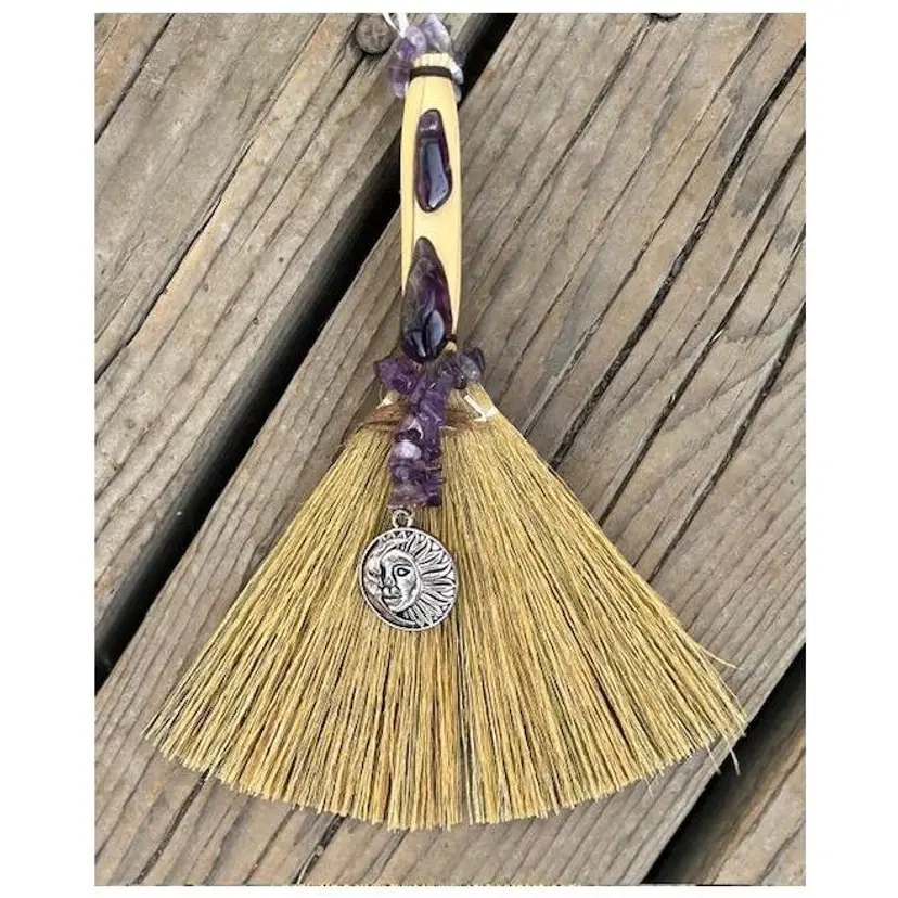 A Besom Broom accented with Purple Amethyst, a Moon & Sun Pendant and cedar peel. 7" Long & 6" Wide. For your Kitchen or other Special Space. Hand Crafted.
