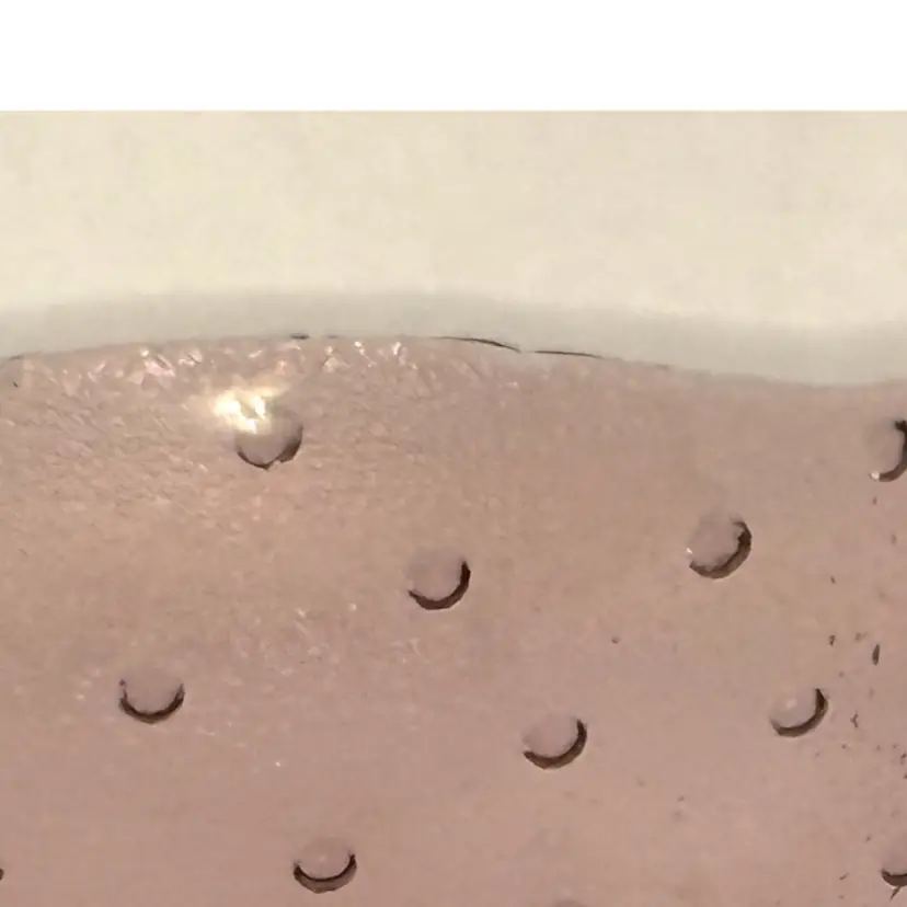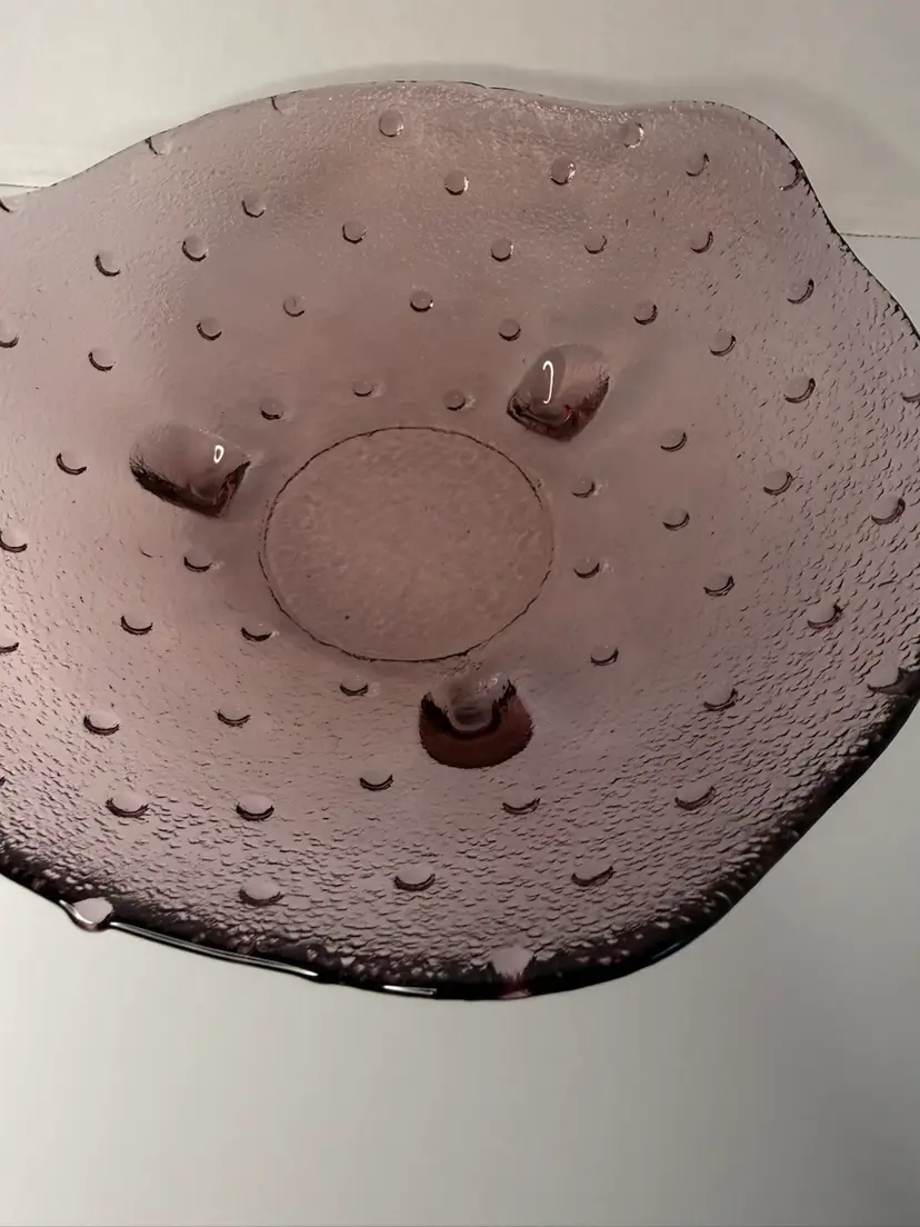 The amethyst purple color beautifully highlights the unique, all-over 'hobnail'. Its freeform, gently ruffled rim and three small, integrated feet give it an organic, sculptural quality. Excellent condition