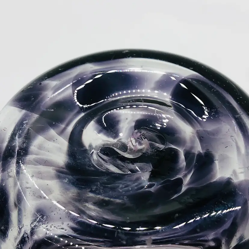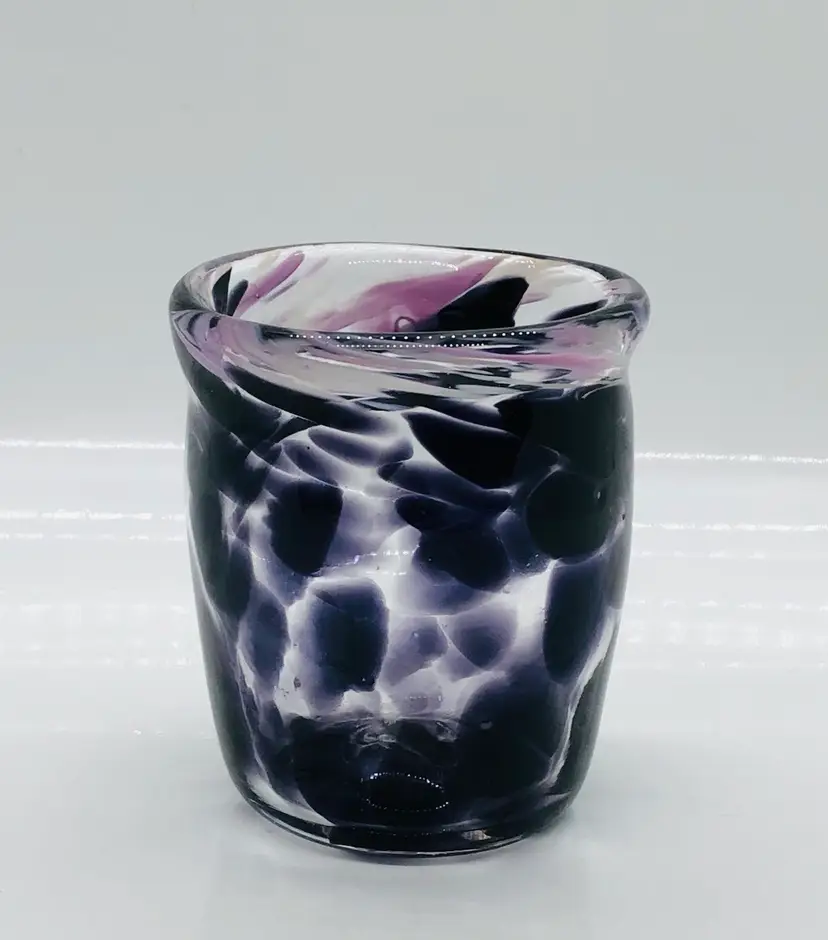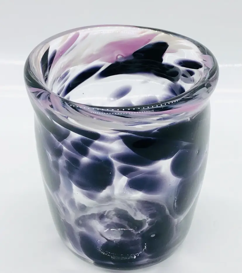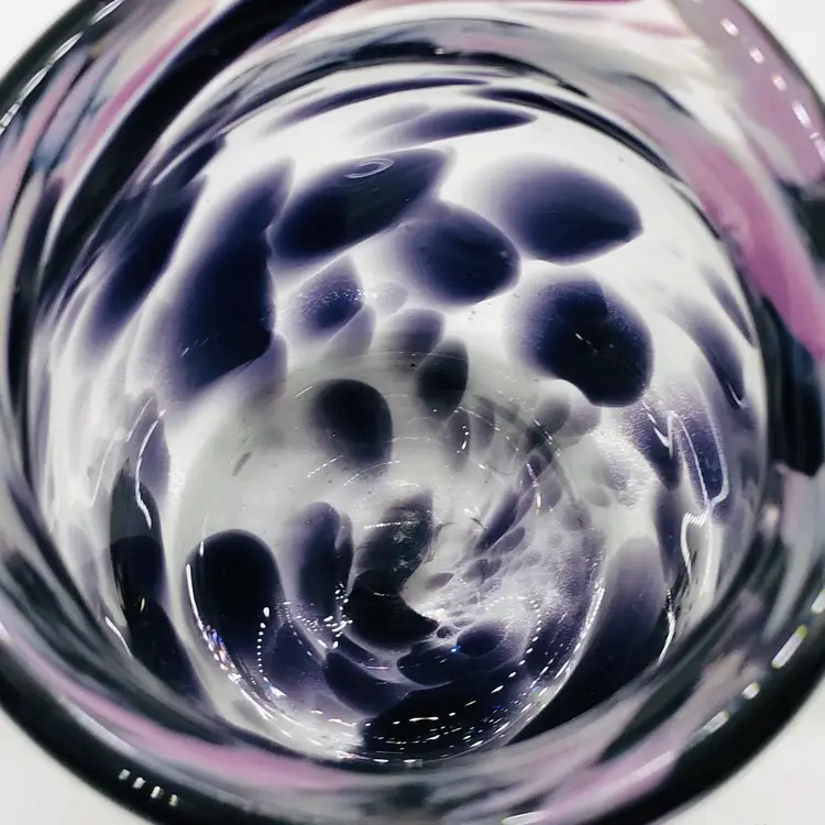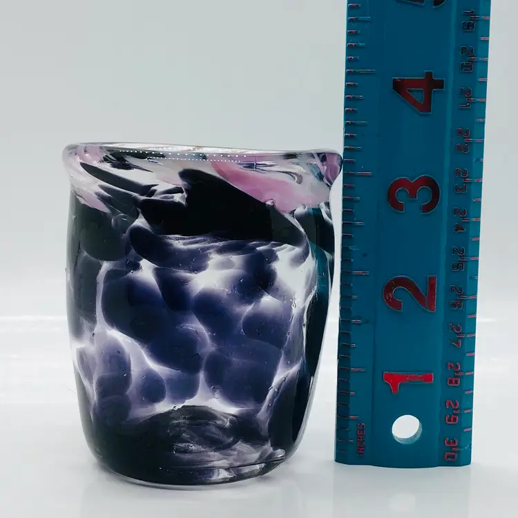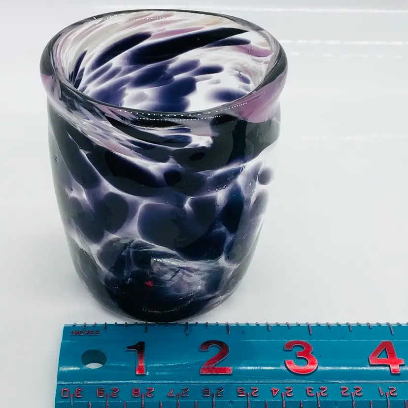 This product is a beautifully hand-blown amethyst glass vase featuring a spotted pattern, making it a unique and decorative piece for any home. Standing at 3.5 inches tall and weighing 7 ounces, this art glass vase adds a touch of elegance with its purple color and intricate design. Perfect for displaying flowers or as a stylish candle holder, this vase is sure to be a focal point in any room. Crafted by hand this piece showcases the artistry and skill of traditional hand-blown glassmaking.please check photos. Thank you ๐