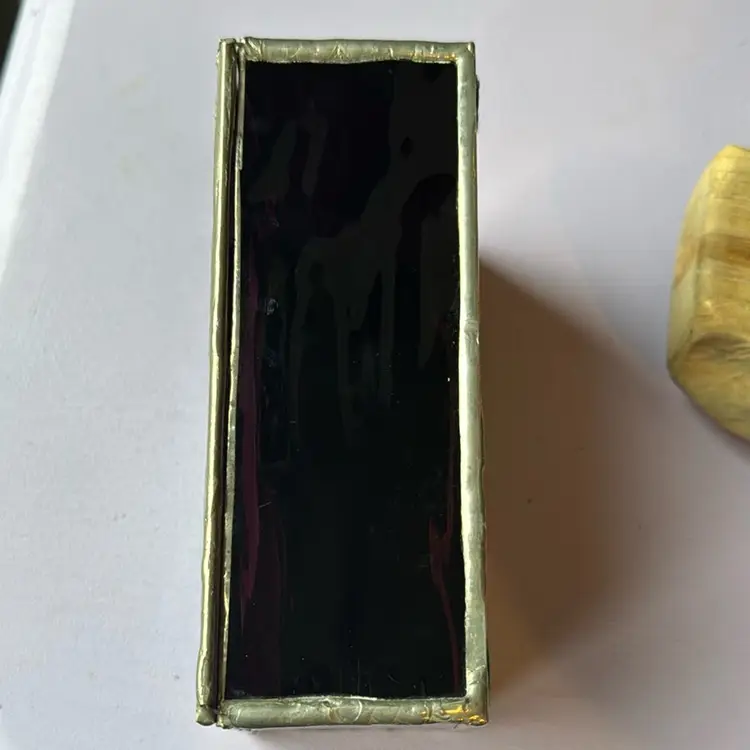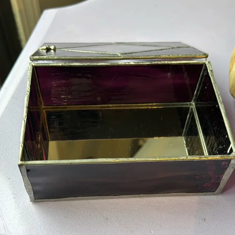 Beautiful amethyst colored stained glass trinket box with clear glass design on top. Mirrored bottom. No chips or cracks. Measures 6” x 4” and 2.25 inches tall.