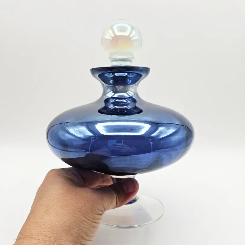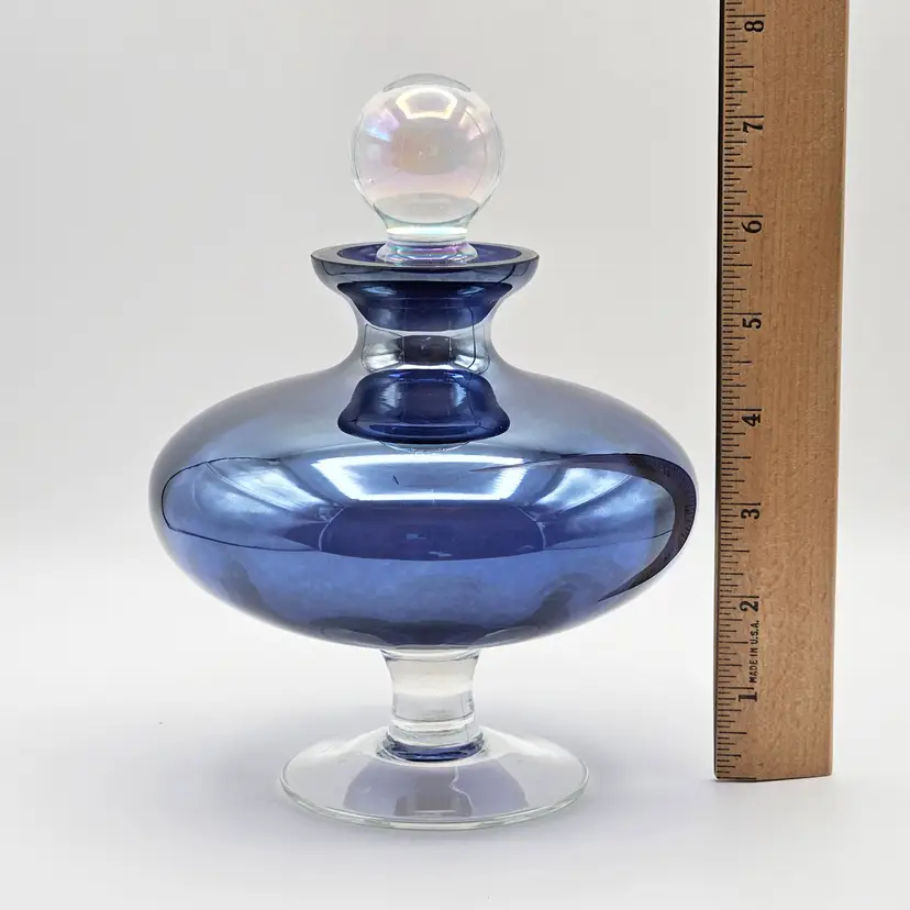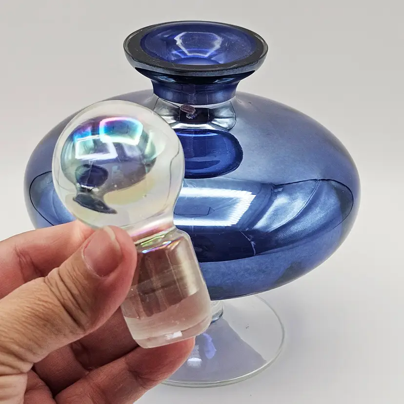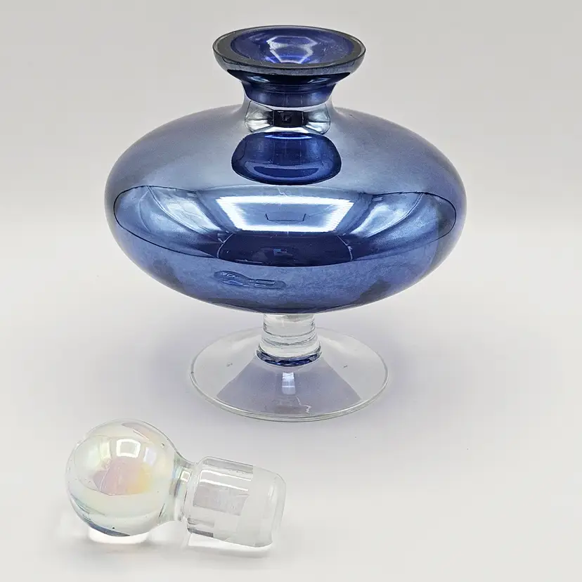 Striking jewel-toned vintage art glass “genie” bottle in a rich amethyst violet purple hue with a luminous iridescent finish. Art glass with a rounded, sculptural body set on a clear pedestal base, giving it an elegant, mid-century modern inspired look. Topped with its original clear orb stopper, also showing a subtle iridescent sheen. Versatile as a perfume bottle, small decanter, or decorative display piece.