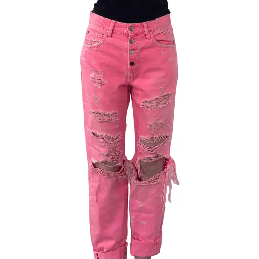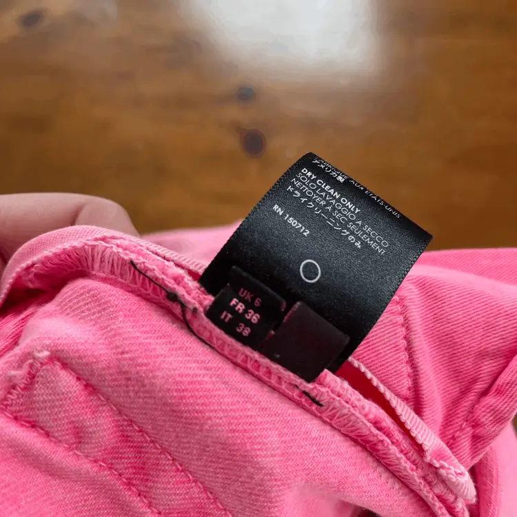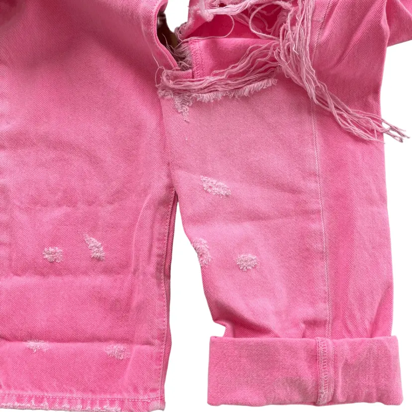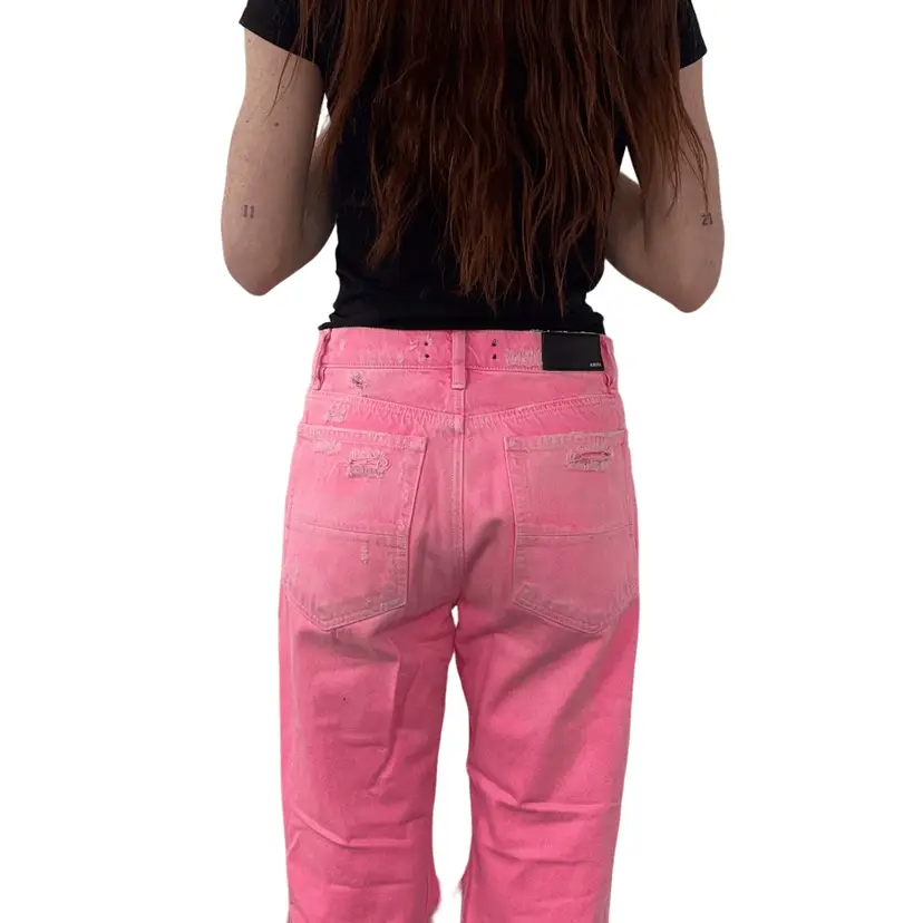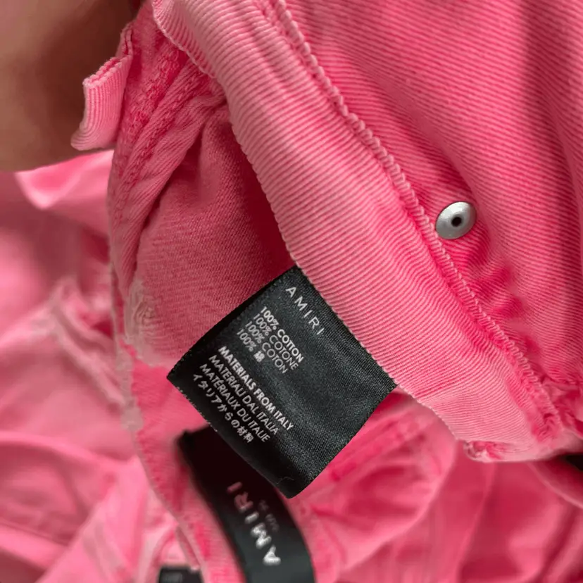 Brand: Amiri Details: Straight pink denim jeans with scattered tears. Five high waist pockets with Britton closure and belt loops at the waist. Size: UK 6 / about US 24 (would also fit 25) Condition: pre-worn, rips/tears a bit more than when first purchased