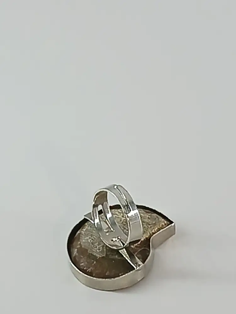1 3/16 x 1 5/16 x ¼ inch Ammonite Fossil has been mounted into a silver plated adjustable ring setting.