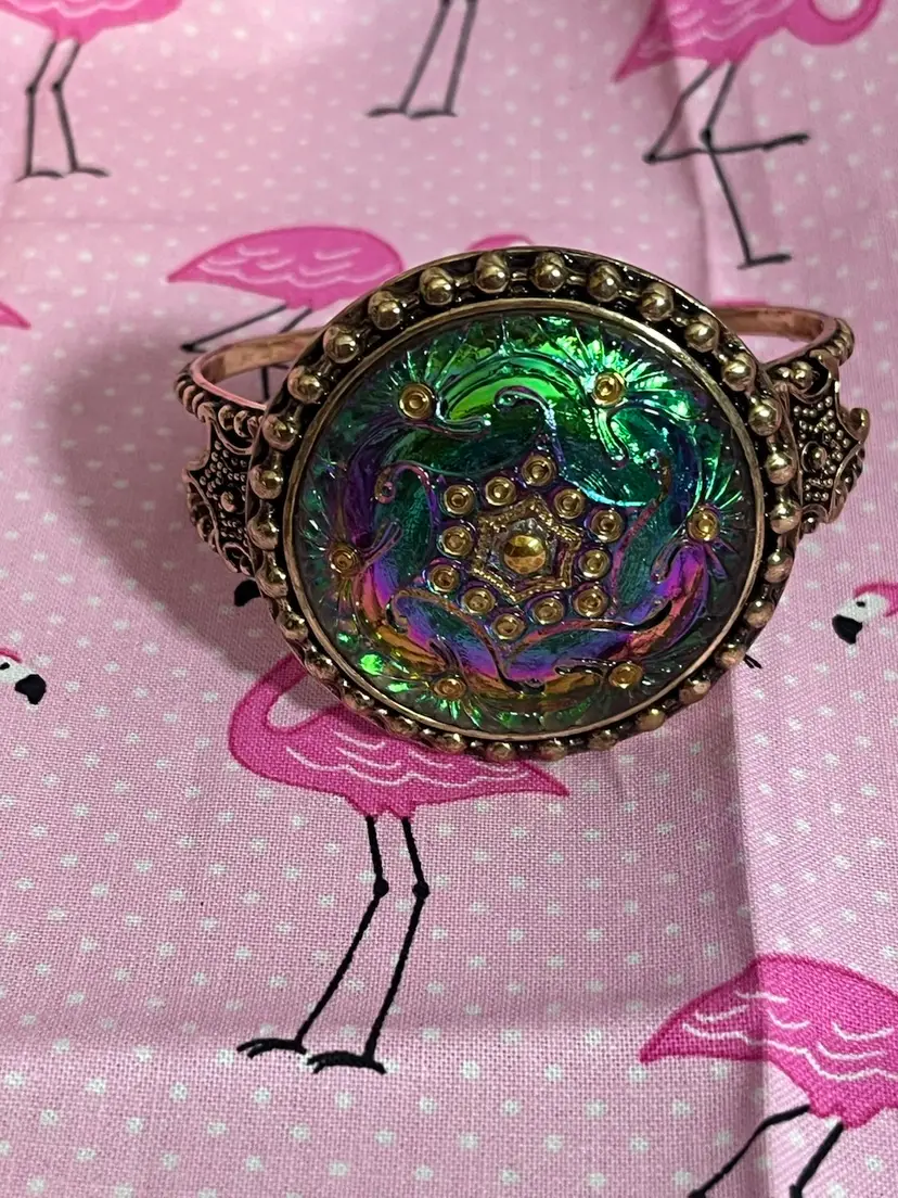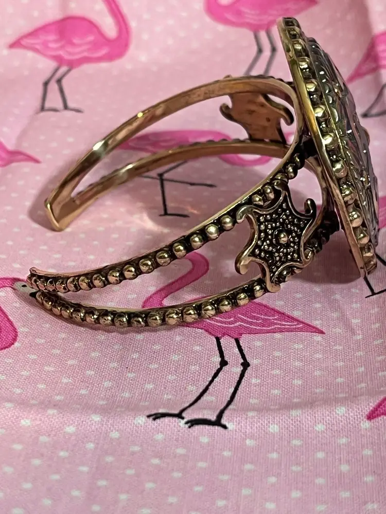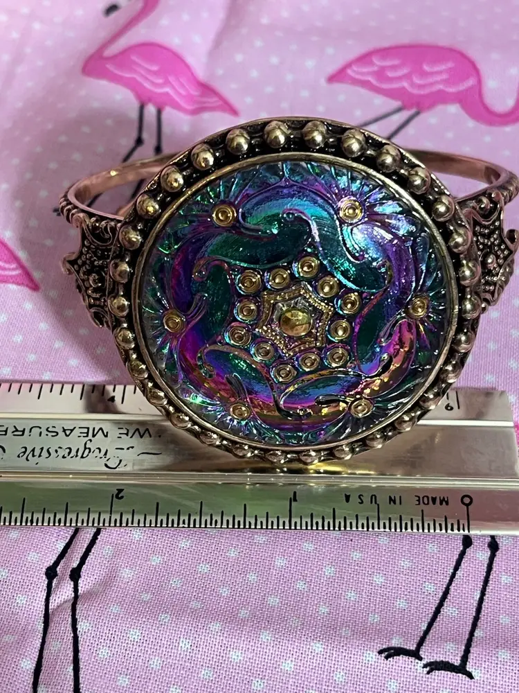 The Amy Kahn Russell Large Bronze Iridescent Purple and Rose Tones Art Glass Cuff is a stunning bracelet crafted by the renowned brand Amy Kahn Russell. This cuff bracelet features a unique multicolor design with iridescent purple and rose tones that add a touch of elegance to any outfit. Made with high-quality art glass, this cuff is a stylish and eye-catching piece of fashion jewelry that will surely make a statement.