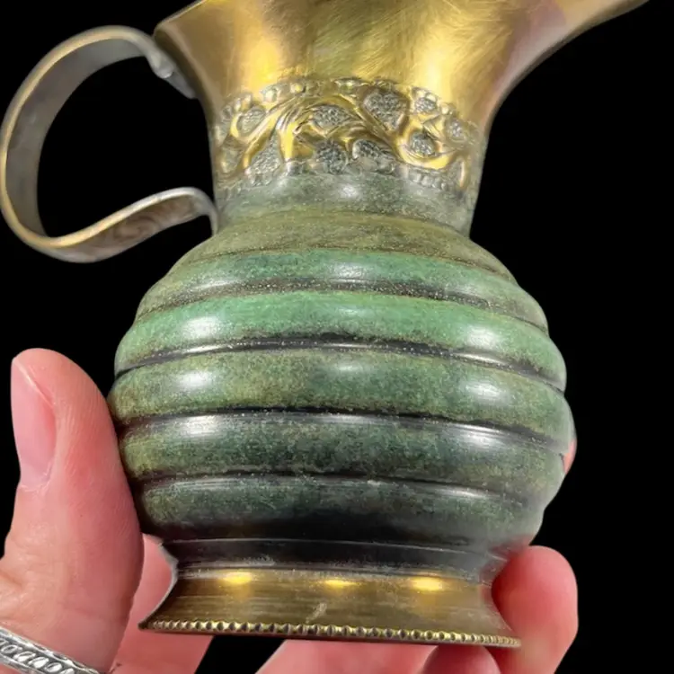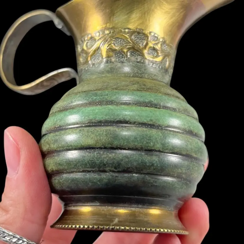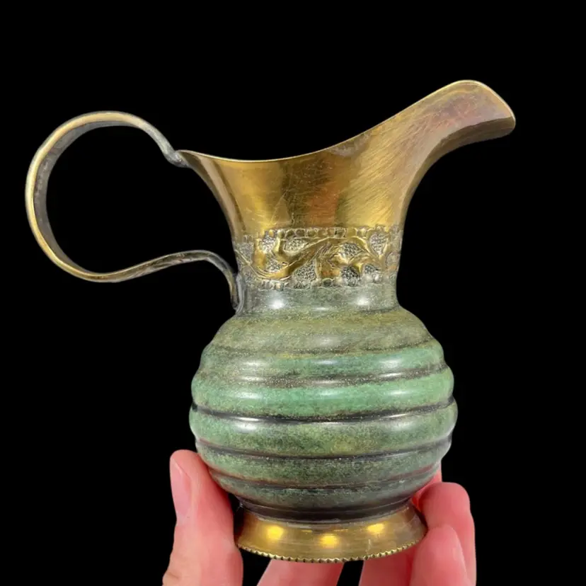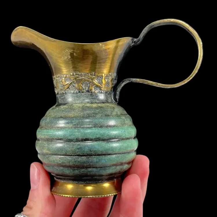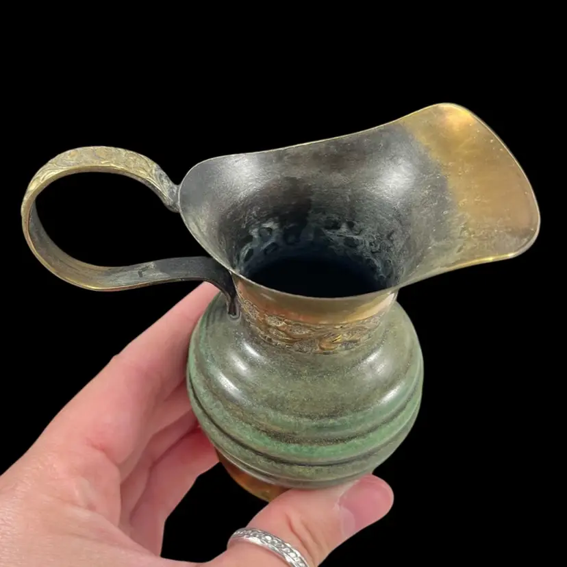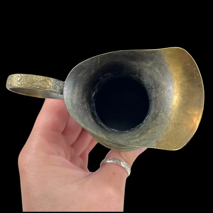 Approximately 4” from spout to handle, 3.25“ tall, with a 1.75” diameter base. Good vintage condition with some surface wear/patina.