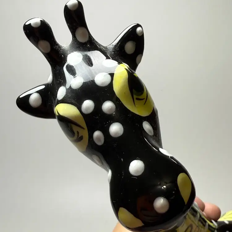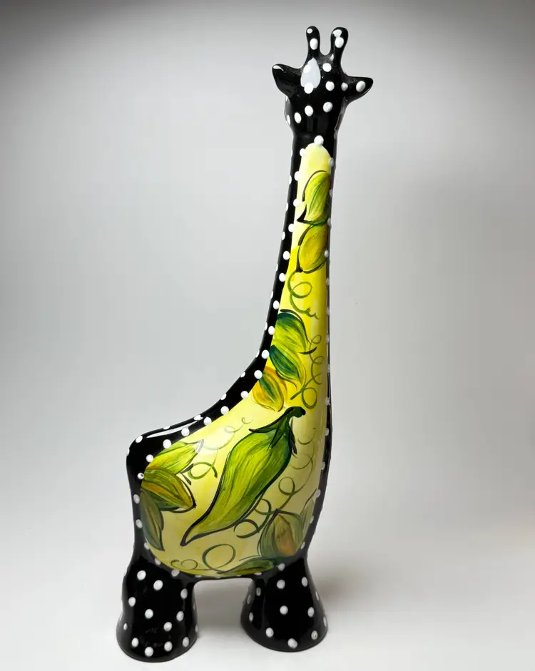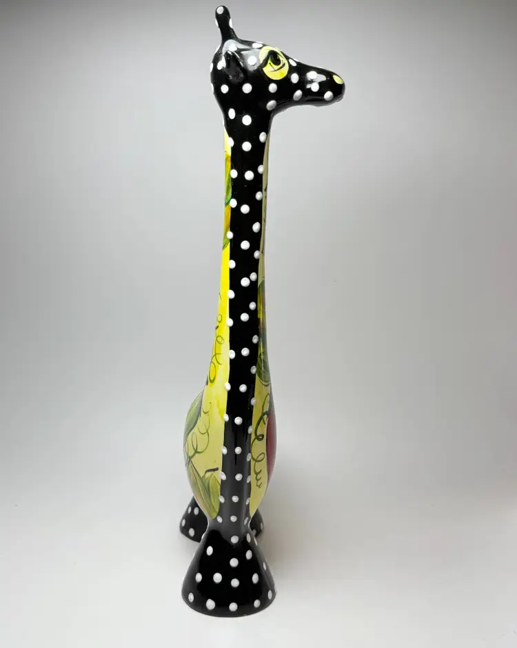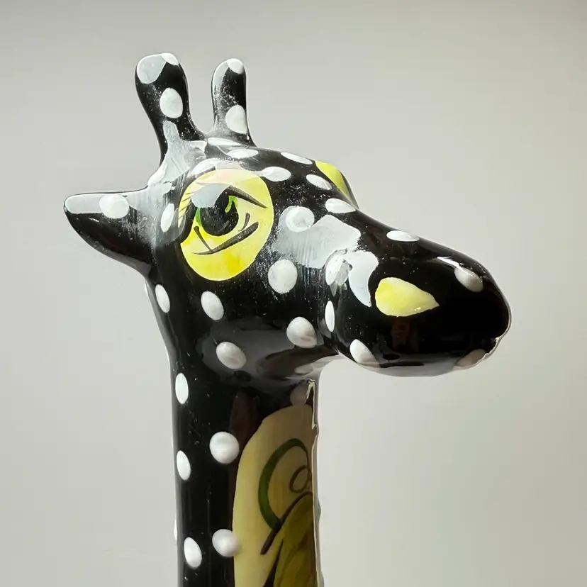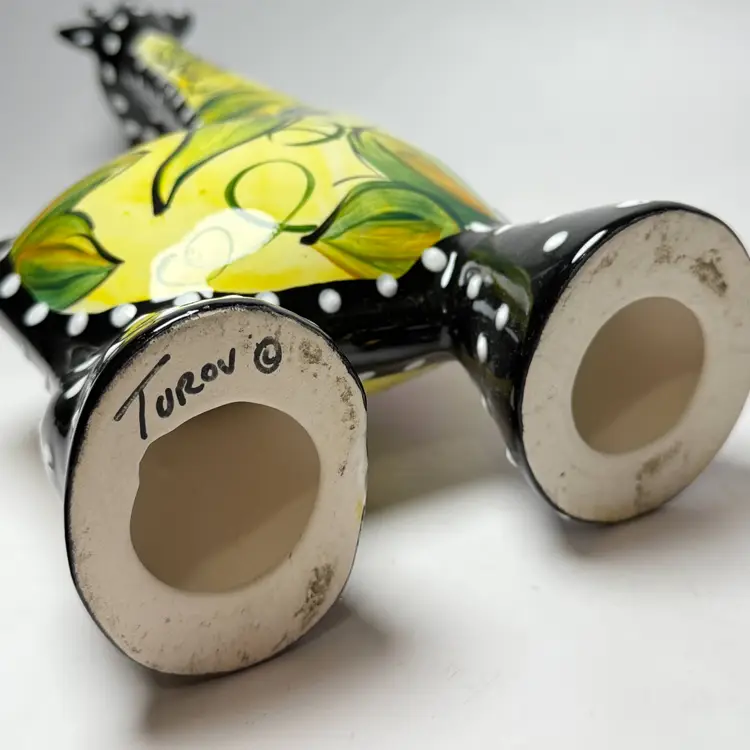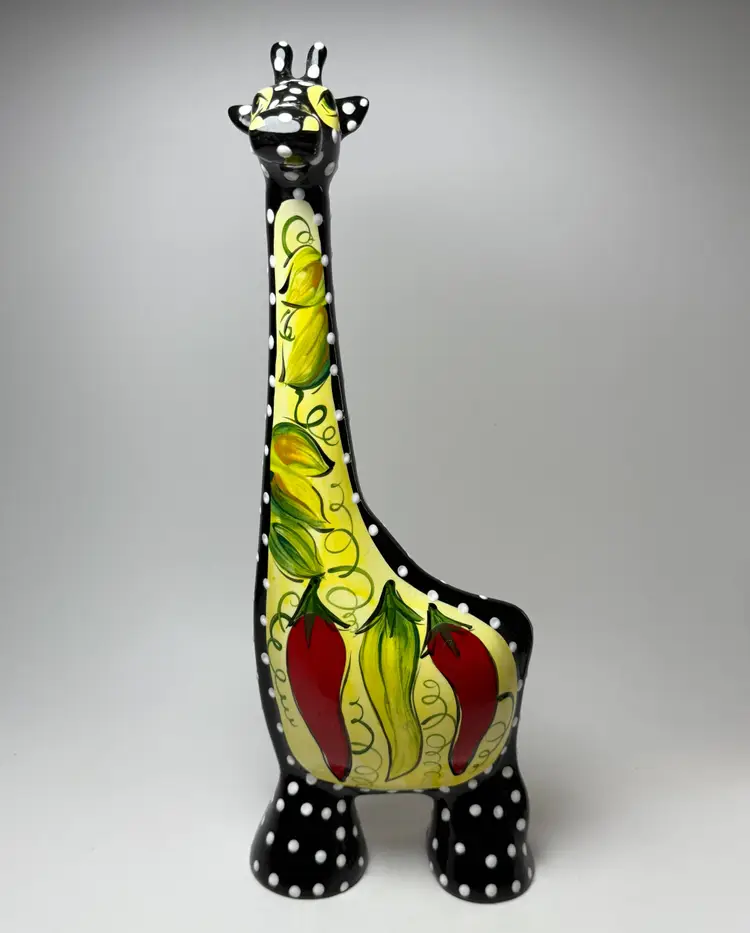 Anatoly Turov Russian Artist Giraffe Figure Black Polka Dots Chili Peppers Theme Signed. About 16" tall. Ceramic. Great condition. No chips, no cracks. Signed on the bottom.