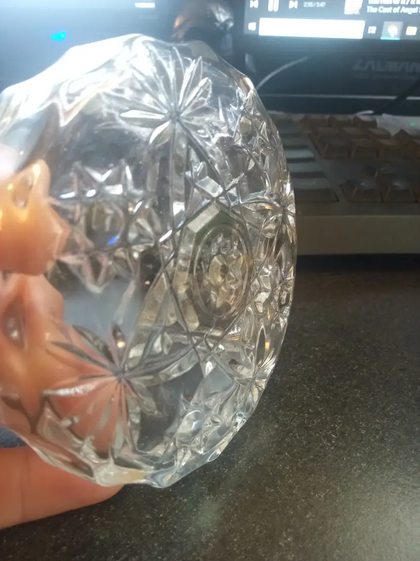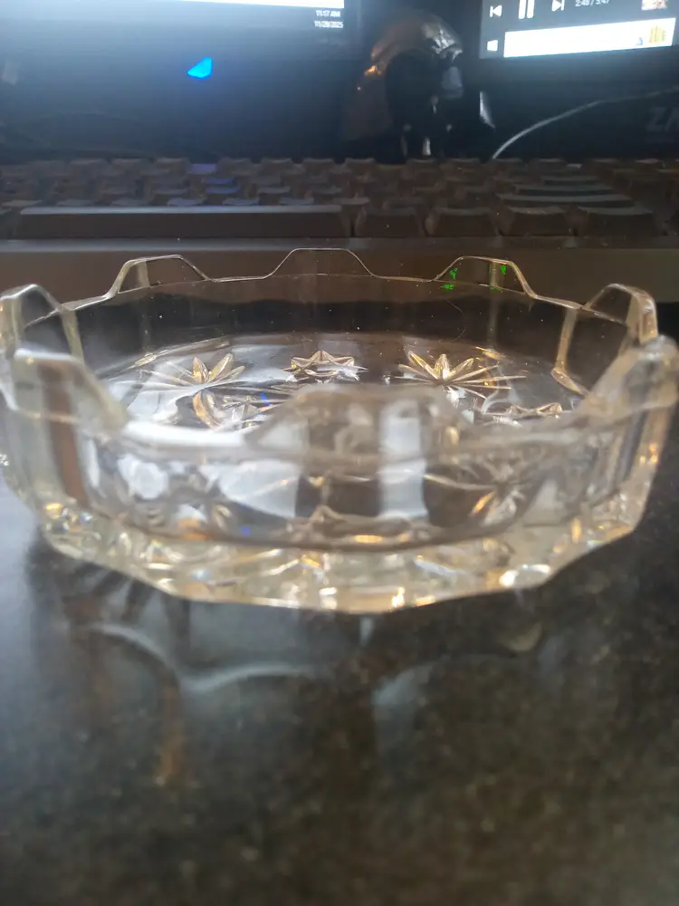 vintage Anchor Hocking Early American Prescut clear glass ashtray. It shows Star of David pattern.