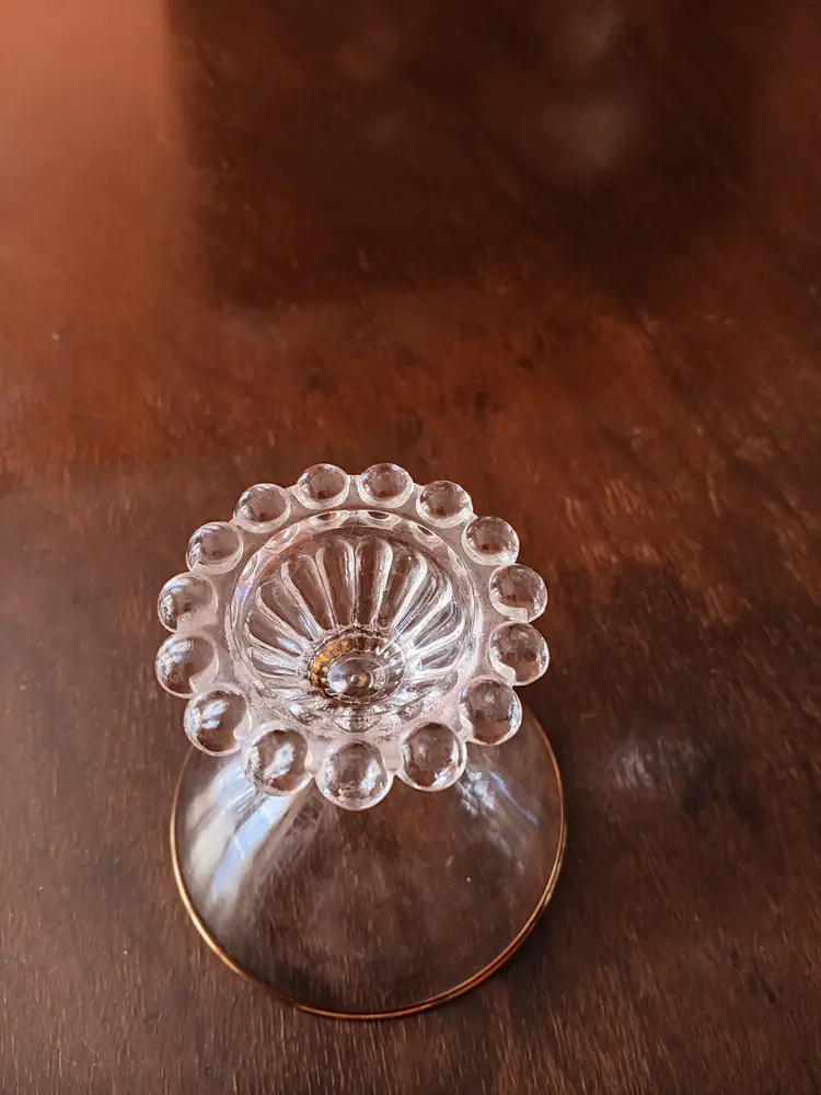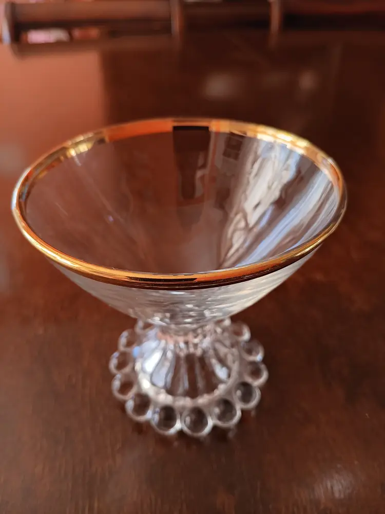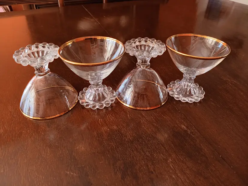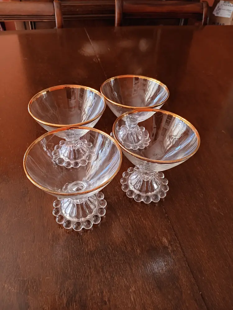 These are vintage Anchor Hocking Boopie (also known as Berwick) beaded glasses, likely sherbet or champagne coupes, featuring a distinctive ring of glass bubbles around the base and a gold-trimmed rim. Era: Primarily produced during the 1950s. Design: Clear glass with characteristic beaded footing and a gold rim detail. Usage: Often used for serving sherbet, desserts, or champagne. Care: Recommended for hand washing only to preserve the gold rim.