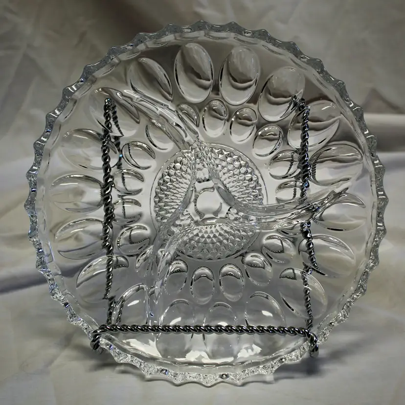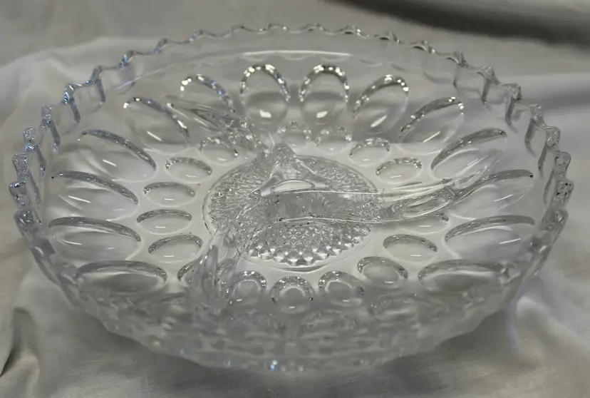 Serve up your favorite veggies with this vintage clear glass platter. Featuring a classic thumbprint design, it's perfect for entertaining guests or adding a touch of nostalgia to your gatherings. Approximately 9" wide x 1.5" tall.