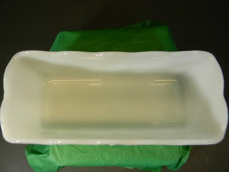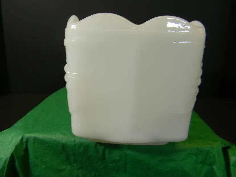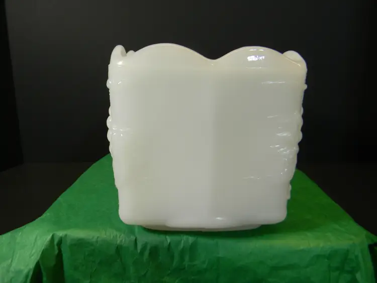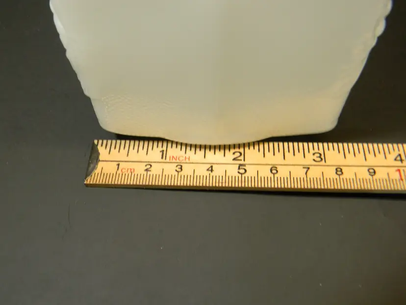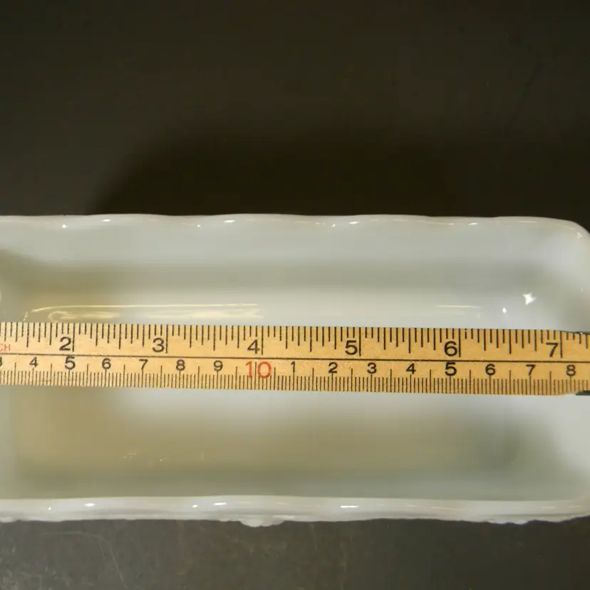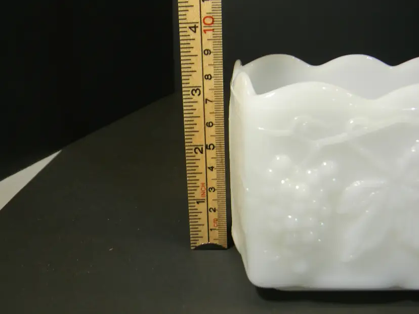 Wonderful Milk Glass grape leaf pattern from Anchor Hocking Fire King Measurements approximately 3 1/2 inches tall, 7 1/2 inches long, and 3 1/2 inches wide. No cracks or chips there is a scratch on the bottom see photo used condition No Stains No Box or Paperwork **See all photos before purchasing Measurements are in the photos