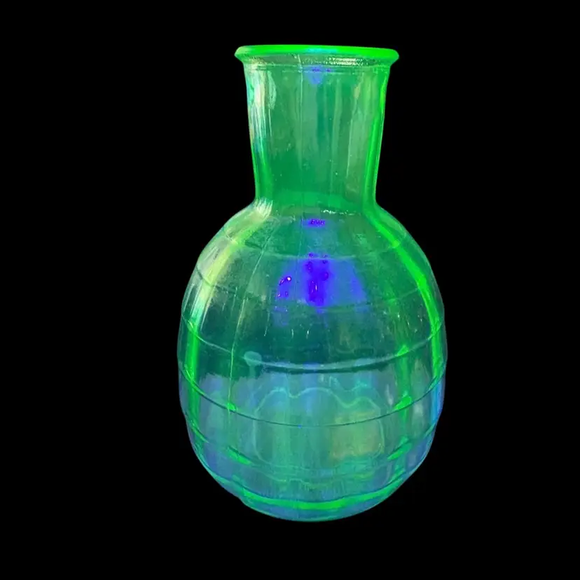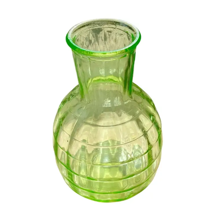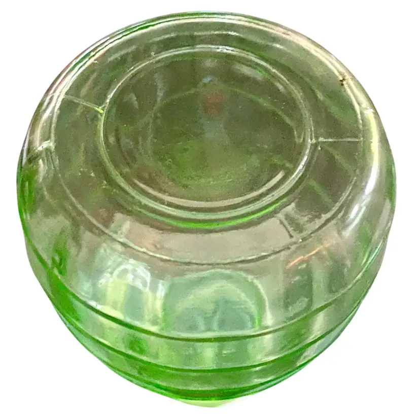This little decanter from Anchor Hocking was produced in the 30’s. The pattern is Block Optic and at one time it had a matching cup which unfortunately is long gone. It is uranium glass and glows like crazy. It is approximately 6” high and in excellent condition with no cracks or chips. I took the first photo in a light box and the others in outdoor light. The color is closer to the first photo.