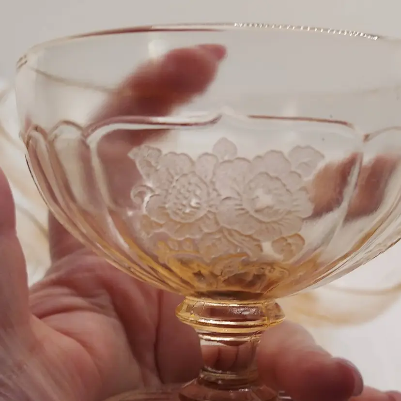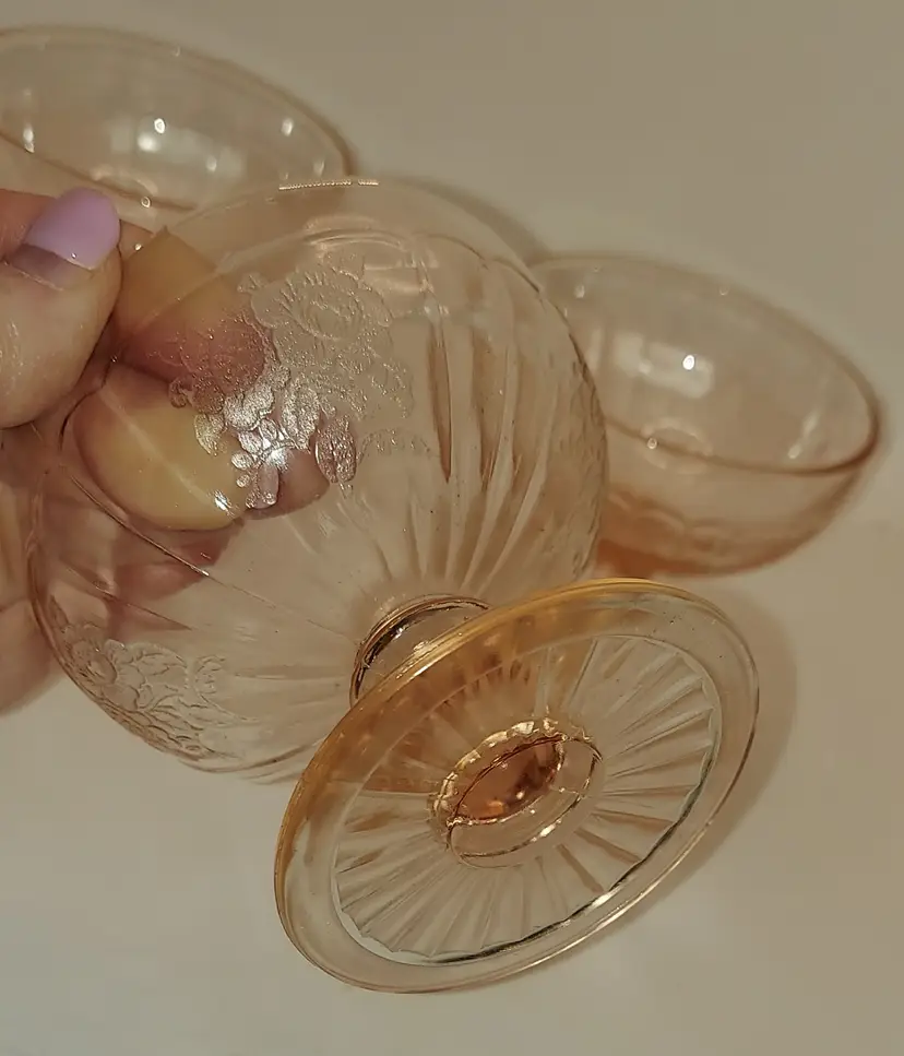 These are 4 Vintage Anchor Hocking Glasses called Mayfair Open Rose in PINK Depression and are Footed. They called these Sherbet dishes. Hocking Glass Company (later Anchor Hocking) was popular during the 1930s. The Dimensions are 3 1/4 inches tall and 3 1/2 inches in diameter at the rim. These are straight out of my Grandma's cupboard. These were from her Mom and I'm selling these for her They have been lovingly Pre-loved and pre-owned but in Fantastic condition! Please see my other PINK DEPRESSION GLASS FOR SALE ON HERE!! This item is cross-posted on other apps so if you love it grab it, then its GONE when you come back--that means it was SOLD on another app! Also please see our other items for sale as we love to bundle to save on shipping! All of our packages are packed with love and care so rest assured it will arrive safely. Please send serious offers as we usually accept ones that are lower than competitively priced!