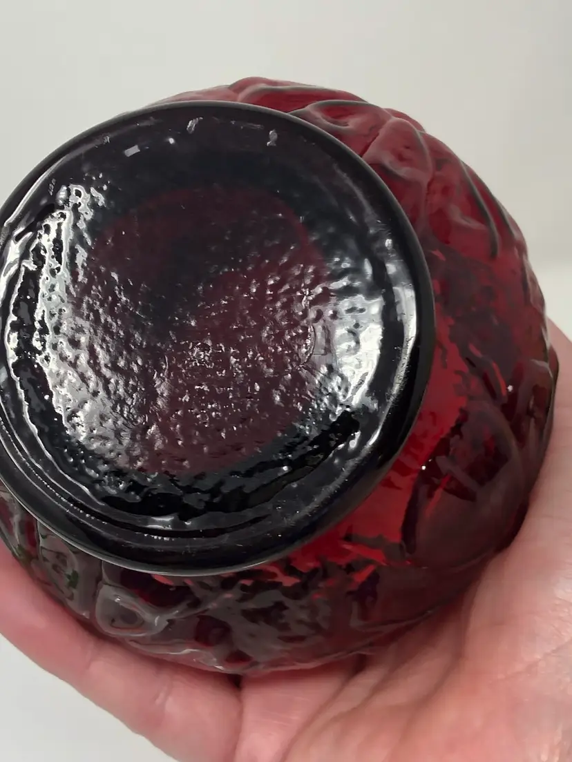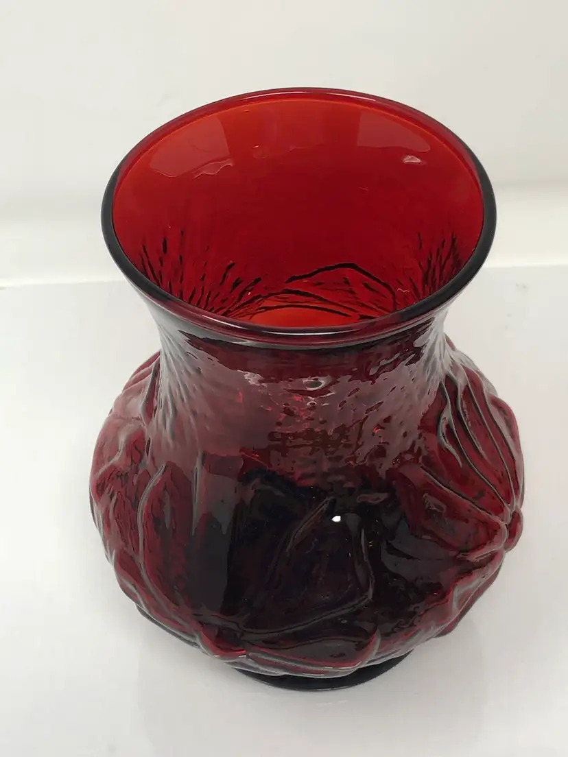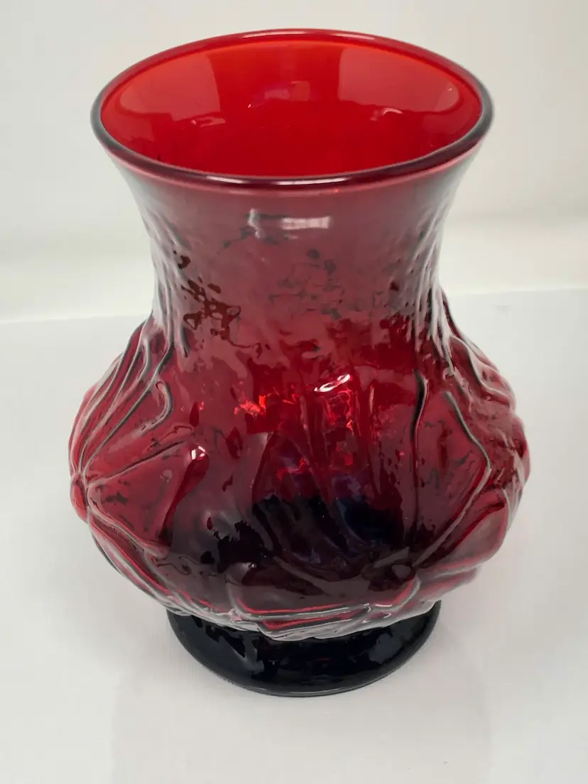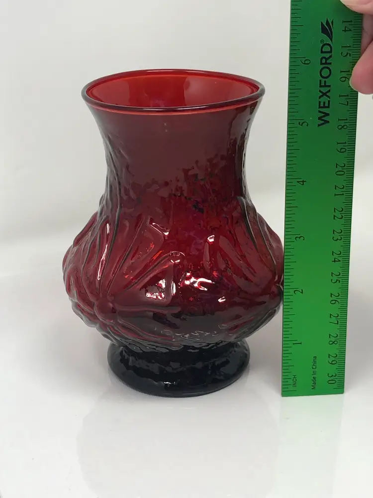 5 1/2" red glass vase. Anchor Hocking Rainflower Pattern. No markings or labels, no chips or cracks.